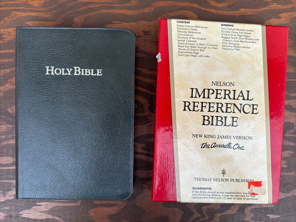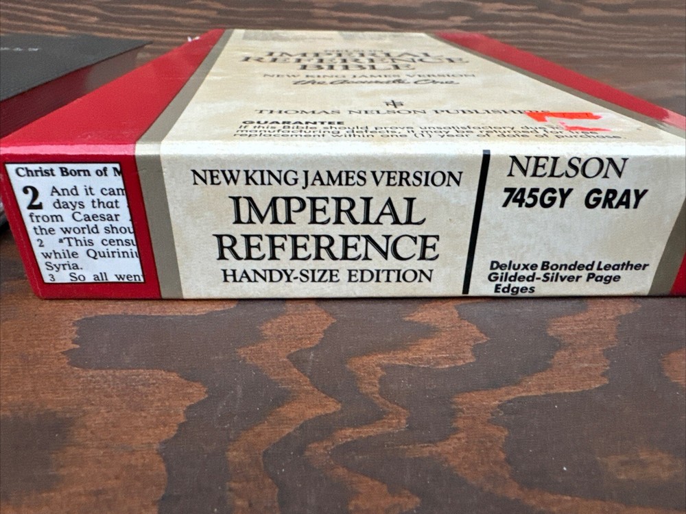 Nelson KJV Imperial Reference Bible #745GY in Gray Bonded Leather, Words of Christ in Red, has Silver Gilt Edges. Looks like never used, silver edges look great, presented to page is blank. Storage box has some wear and stains but Bible is very nice. ~ Buy and bid with confidence, check our feedback. Please note Shipping times. Books because of their heavy weight, will be mailed the more affordable USPS Media Mail, which can take 2-9 business days from the Los Angeles area. Faster 1-3 day shipping available. Please allow 1 business day for shipping. We are in Pacific Standard Time (Los Angeles area) and many times can ship the same day, especially for items bought before noon.
