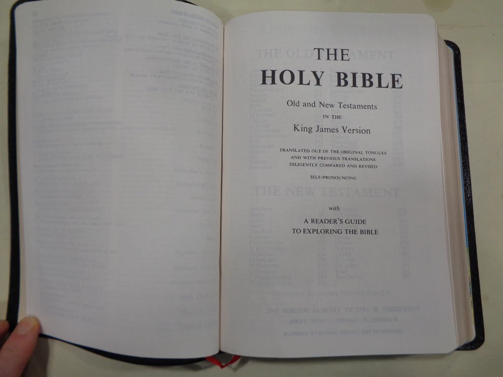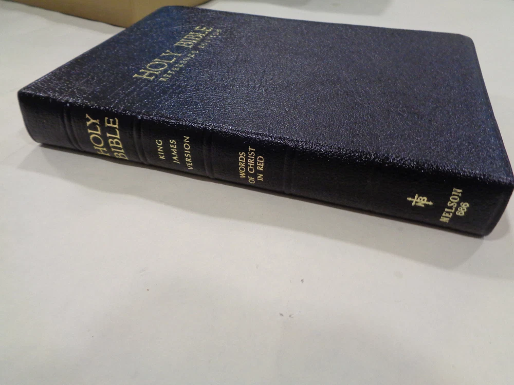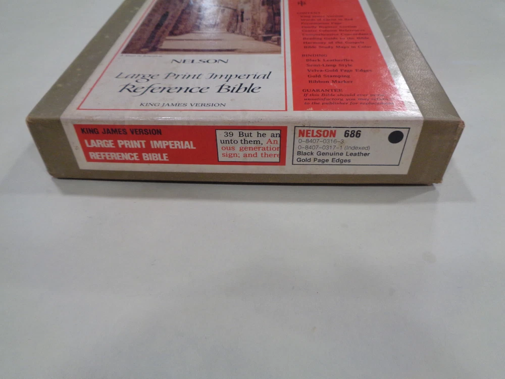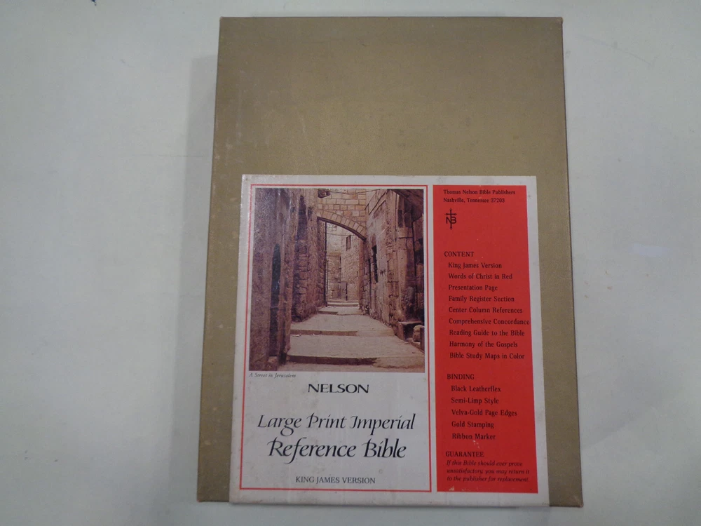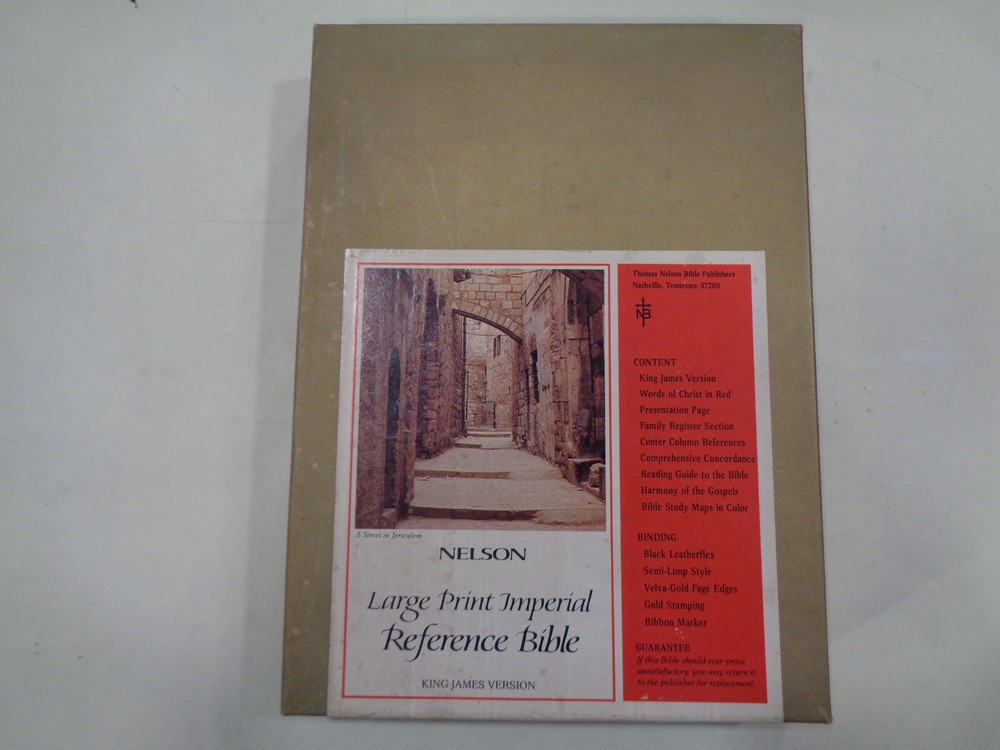 Nelson Large Print Imperial Reference Bible KJV Leather Red Letter w/Box Here is a very interesting edition “Nelson Large Print Imperial Reference Bible”. The Bible features a nice format and font for easier reading, contents are crisp and clean, housed in nice original box Publisher: Thomas Nelson, latest copyright 1972 The Bible measures approx. 9 ½ by 6 ½ inches. The spine end has some light wear and creasing The boards and corners have slightest of minor wear. The hinges and binding are strong and tight. The pages are in crisp clean shape, names in pen on Presentation page, Bible is very nice. Shipping weight is 4 pounds Inventory: 0924PE003