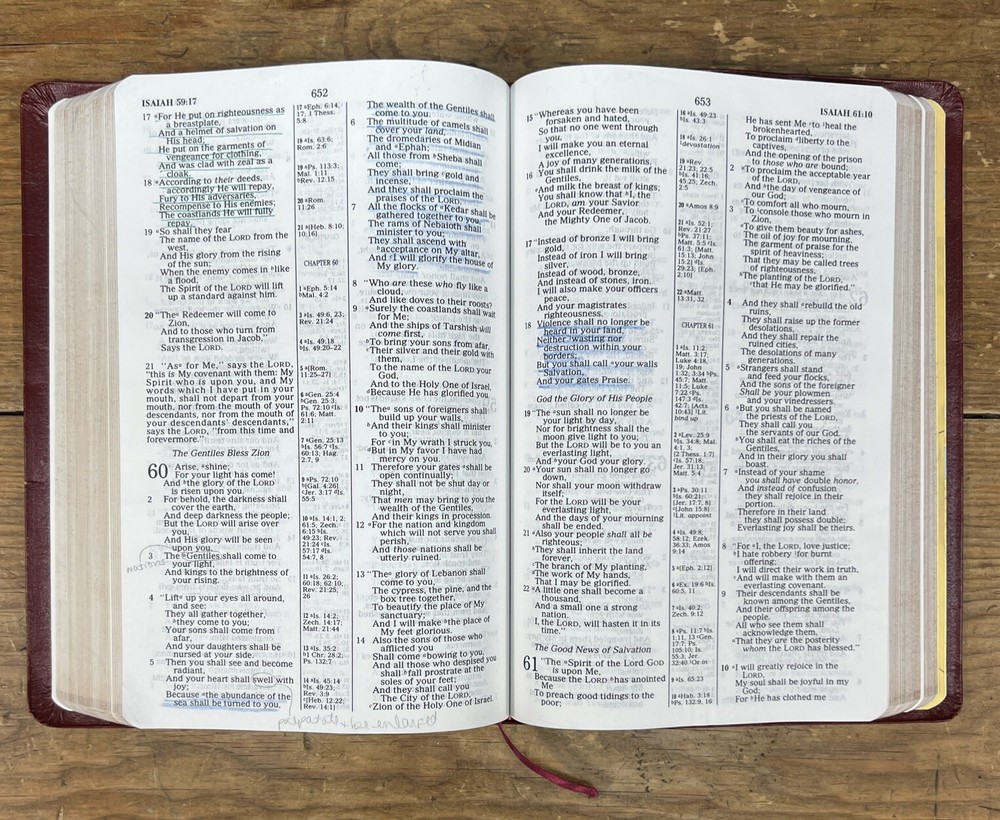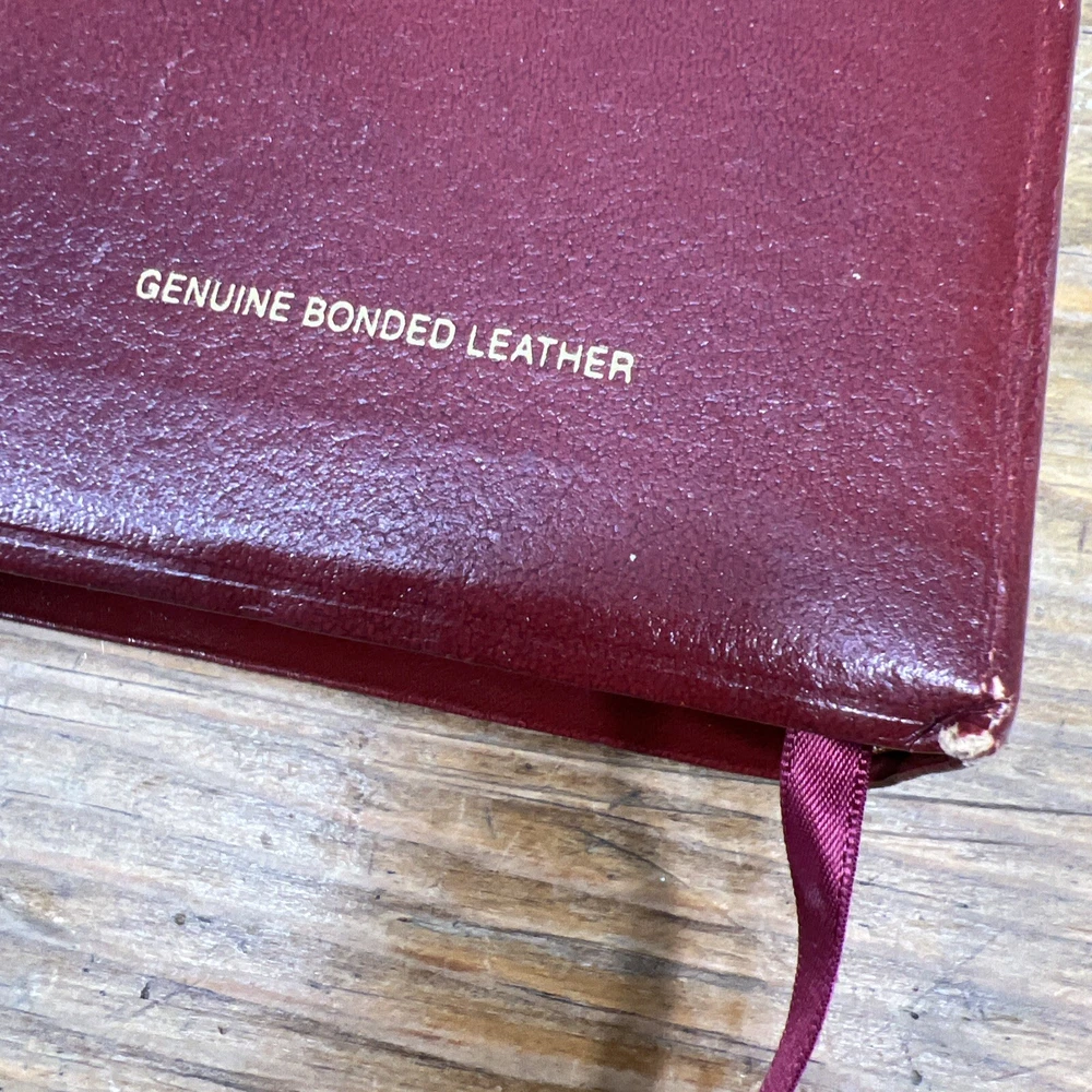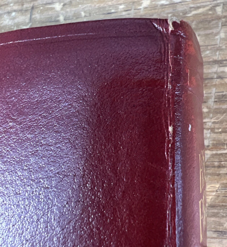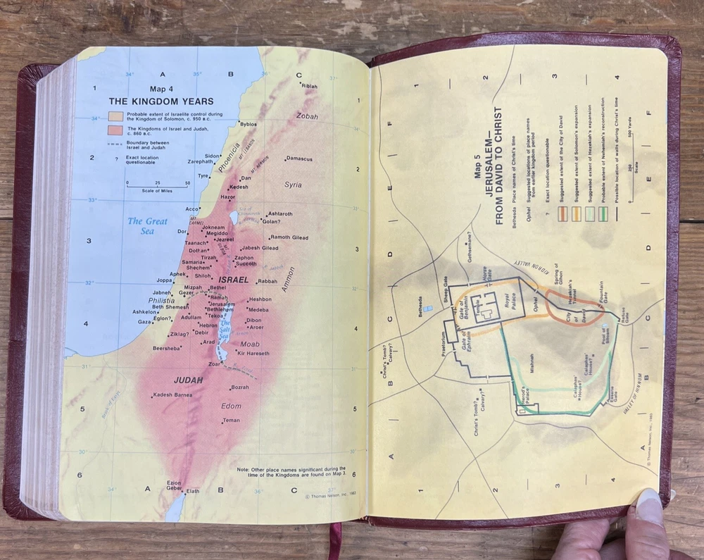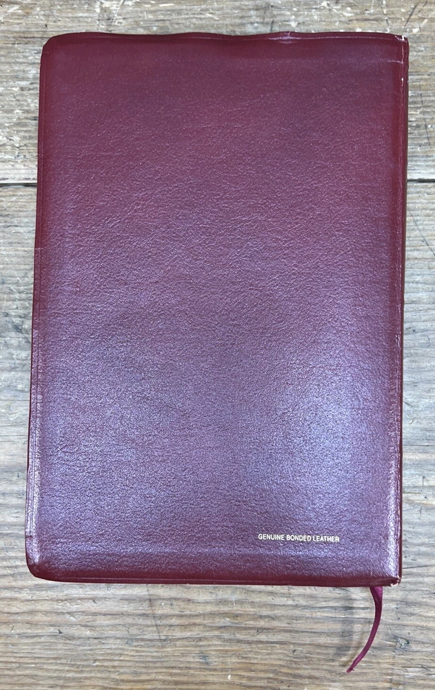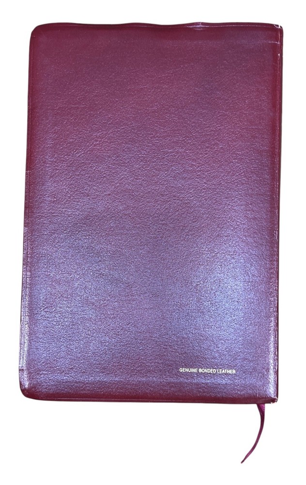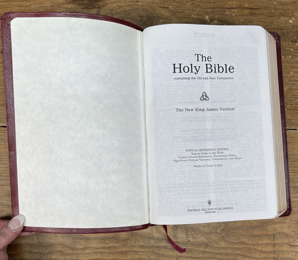 This is a 1994 edition of the Nelson NKJV Topical Study Large Print Reference Bible. It is a bonded leather version with red lettering and features a topical reference edition of the New King James Version of the Bible. The book title includes the words "Nelson NKJV Topical Study Large Print Reference Bible" and is authored by Thomas Nelson. The book is published by Thomas Nelson and made in the United States. The book's aspects include a format of bonded leather, language of English, and a topic of Bible studies. There is highlighted and writing on some pages. Also cover has some wear