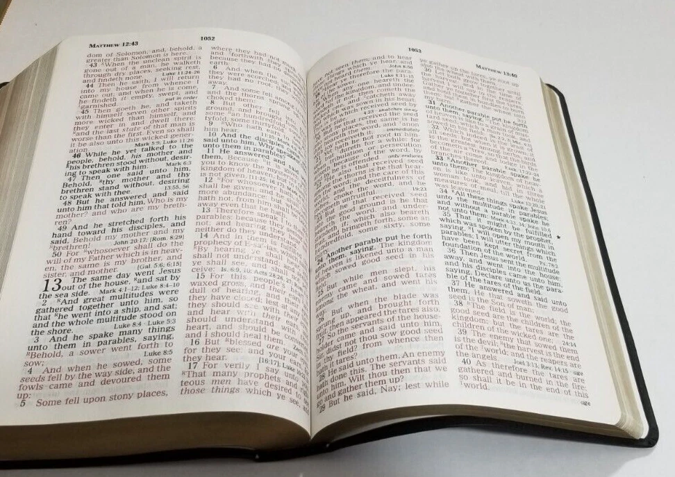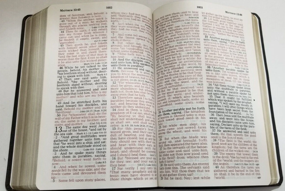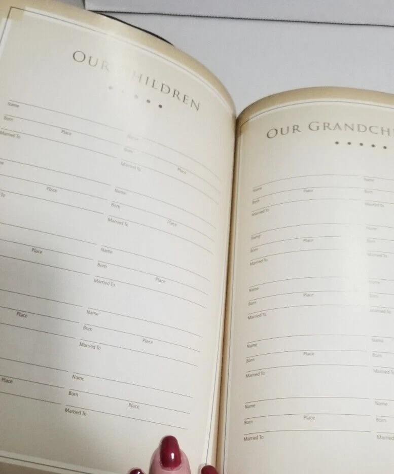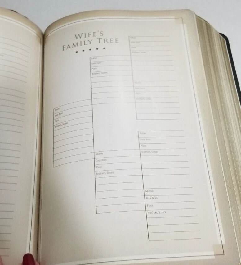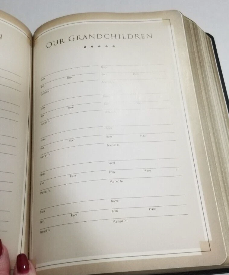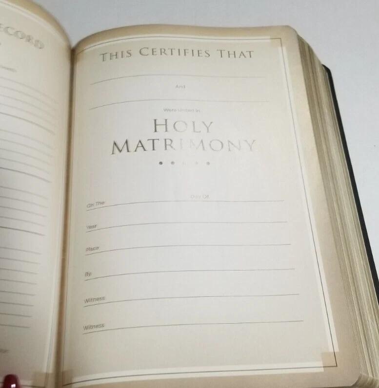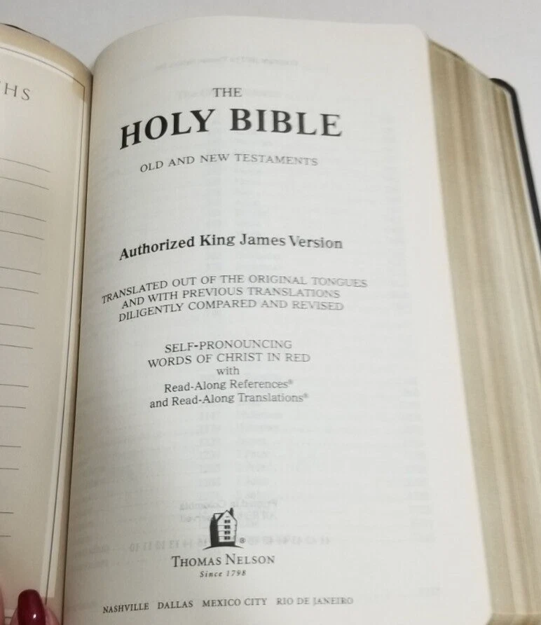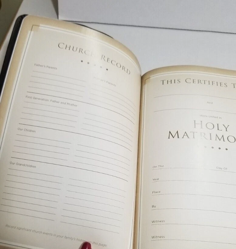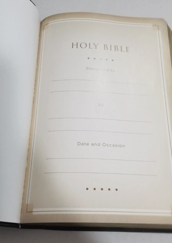 Holy Bible - Giant Print - Black Leathersoft (Imitation Leather) Cover - Red Letter Edition (Read-Along References and Faith-Building) Authorized King James Version Translated Out of the Original Tongues and With Previous Translations Diligently Compared and Revised Self-Pronouncing Words of Christ in Red with Read-Along References and Read-Along Translations In this edition, each book of the Bible begins with a concise introduction provided by the publisher. Personal Records Pages: Presentation Page Church Record Marriage (Holy Matrimony)Record Husband's Family Tree Wife's Family Tree Our Children Our Grandchildren Record of Deaths In very good condition overall with some wear/dings on the cover. All pages, very clean and intact. All family records pages are pristine and blank. Please feel free to contact me if you have any questions. Buyer to pay all shipping; just check the shipping calculator for your options. Thanks for looking!