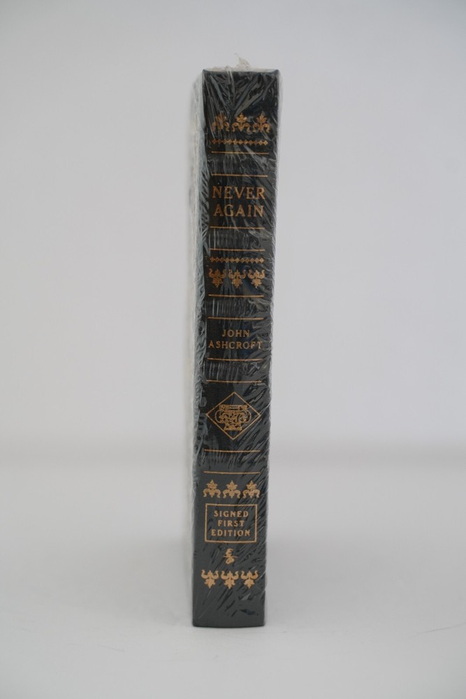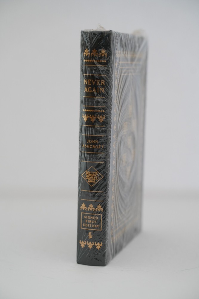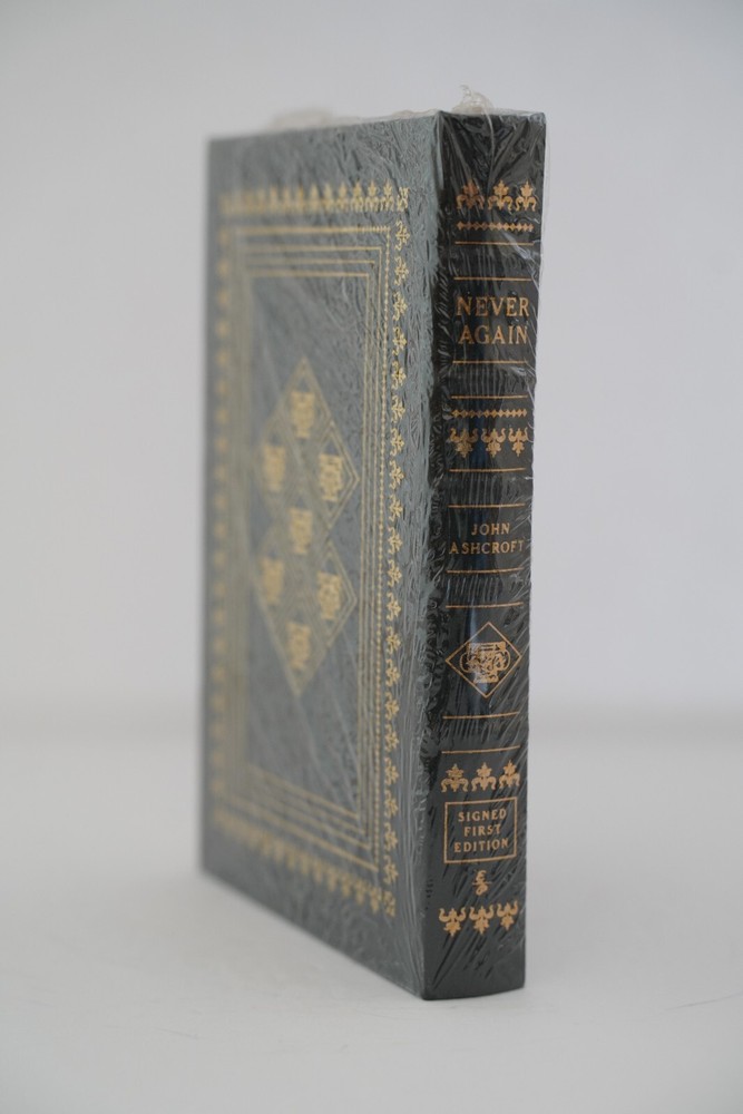 Never Again SIGNED John Ashcroft SEALED Easton Press FIRST EDITION Never opened! Sealed! Great condition! Book features: Easton Press Full Genuine Leather Hubbed Spine Accented With 22 kt. Real Gold Satin Ribbon Page Marker Distinctive Cover Design Gilded Page Edges to Protect Against Humidity High-Quality Acid - Free paper Smyth-Sewn Pages Silk-Moire End eaves Make sure to see my other auctions as I have dozens of Easton Press signed First editions!
