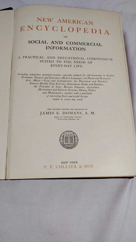 New American Encyclopedia of Social & Commercial Info James Homans ©1908 Collier New American Encyclopedia of Social & Commercial Information | James Homans | Leather Bound | ©1908 | PF Collier & Son | Good Preowned Condition Pictures are of the actual items you will receive – check them out as part of the description for condition and what’s included | Your purchase will come careful packaged, typically in recycled packing materials, and mailed just as soon as possible after your payment is confirmed, usually same or next day, | THANKS FOR YOUR PURCHASE Any stands, bookends, or easels used in photos are not included | I reserve the right to upgrade to a faster USPS service or to use FedEx or UPS services at my discretion and at no additional cost to you when I believe it will provide a better experience.