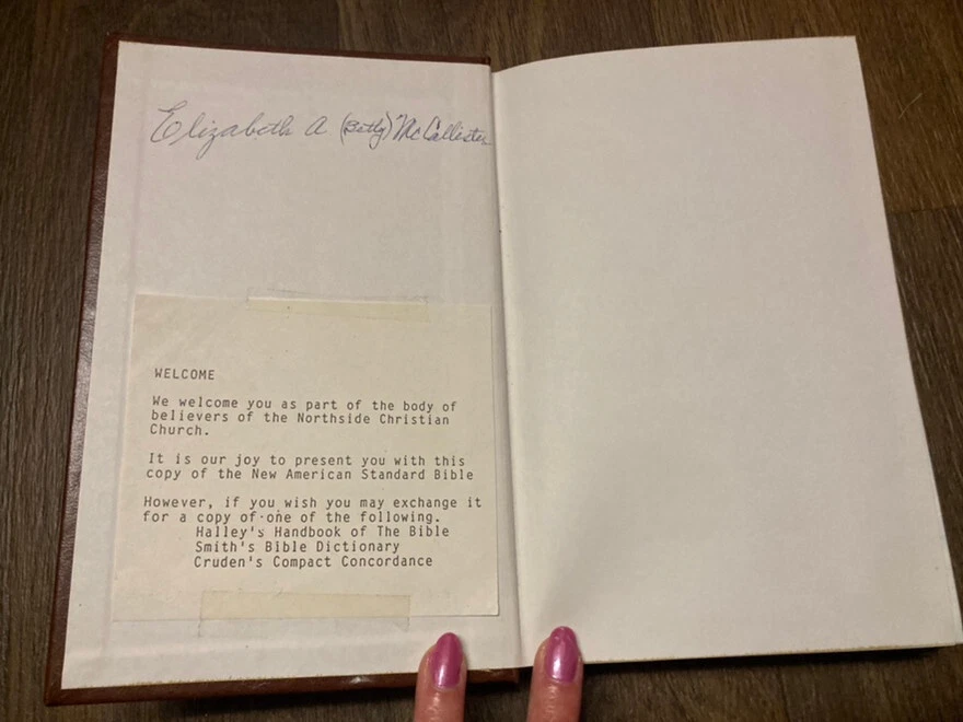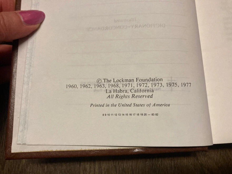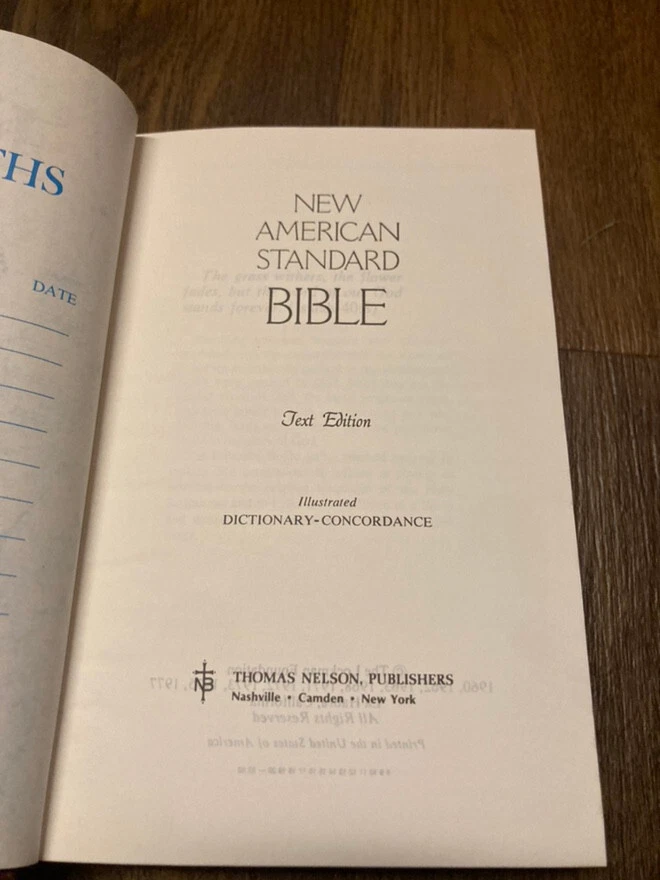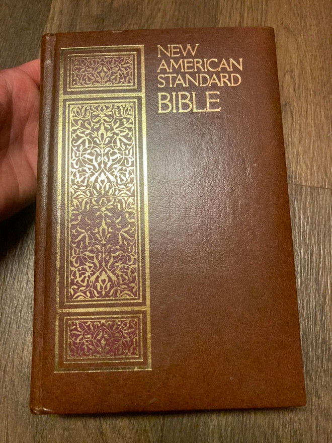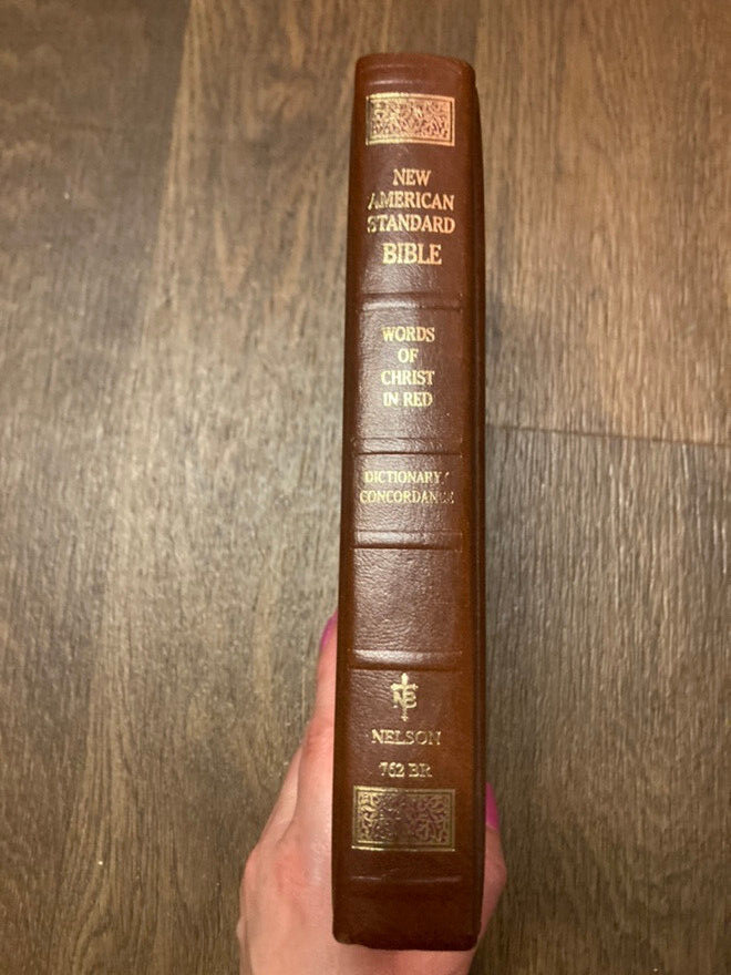 New American Standard Bible Brown Bonded Leather Thomas Nelson Publishers 1977. Pre-owned copy with writing inside cover and first page, the rest clear. Item will be packed with care and shipped promptly from a smoke free home. I can combine shipping on most items being purchased at one time and shipped to the same address. Thanks for looking!