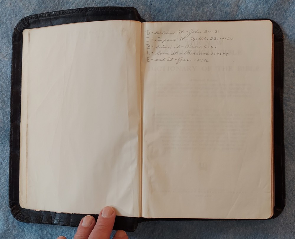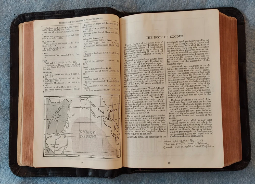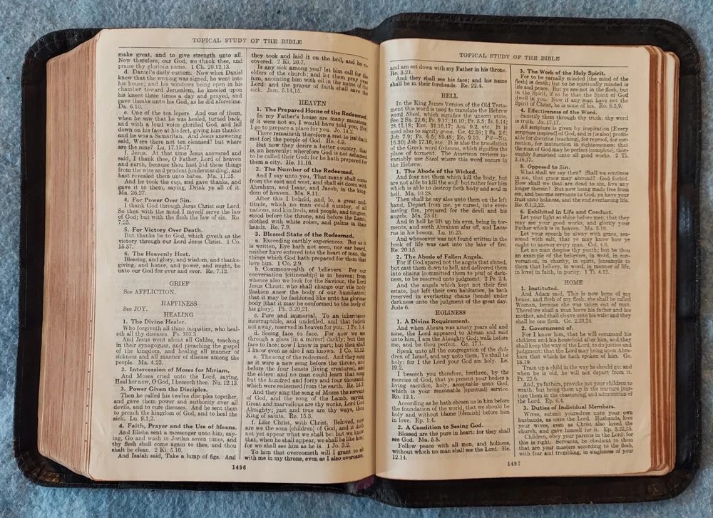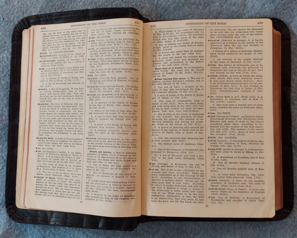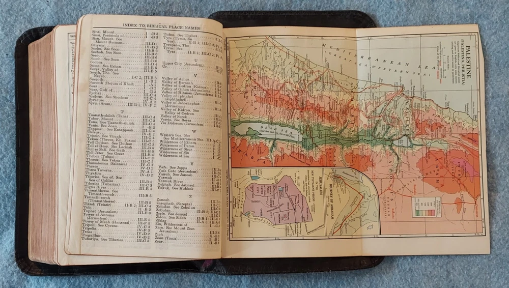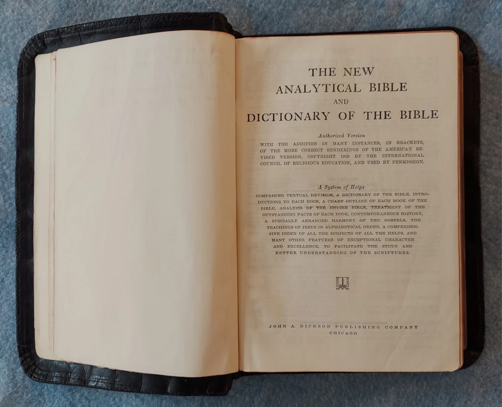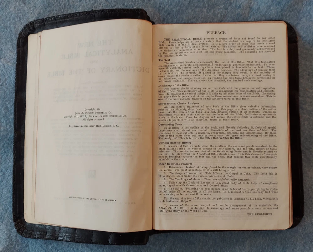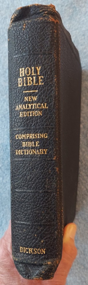 New Analytical Edition Bible Dickson 1941 King James KJV Study Helps Genuine Leather The New Analytical Bible and Dictionary of the Bible AUTHORIZED KING JAMES VERSION with the addition, in many instances [in brackets] of the more correct renderings of the American Revised Version, copyright 1929 by the International Council on Religious Education and used by permission A System of Helps COMPRISING TEXTUAL REVISION, A DICTIONARY OF THE BIBLE, INTRODUCTIONS TO EACH BOOK, A CHART OUTLINE OF EACH BOOK OF THE BIBLE, ANALYSIS OF THE ENTIRE BIBLE, TREATMENT OF THE OUTSTANDING FACTS OF EACH BOOK, CONTEMPORANEOUS HISTORY, A SPECIALLY ARRANGED HARMONY OF THE GOSPELS, THE TEACHINGS OF JESUS IN ALPHABETICAL ORDER, A COMPREHENSIVE INDEX OF ALL THE SUBJECTS OF ALL THE HELPS, AND MANY OTHER FEATURES OF EXCEPTIONAL CHARACTER AND EXCELLENCE TO FACILITATE THE STUDY AND BETTER UNDERSTANDING OF THE SCRIPTURES. JOHN A. DICKSON PUBLISHING COMPANY CHICAGO 1941 (Copyright 1931, 1938, 1941) MANUFACTURED IN THE UNITED STATES OF AMERICA Genuine Leather cover 6 ½ x 10 x 1 ¾ inches, 1639 pages plus Index, Index to Biblical Place Names, and Maps Unusual Helps and Features comprised of: · A Dictionary of the Bible · Introduction to Each Book · A Chart Outline of Each Book · Analysis of the Entire Bible · Treatment of Outstanding Facts of Each Book · Contemporaneous History · A Harmony of the Gospels Specially Arranged · The Teachings of Jesus in Alphabetical Order · A Concordance · Maps · A Comprehensive Index to Important Subjects, Persons, Places and Things to Facilitate Study an Understanding of the Scriptures · Many other features of exceptional character and excellence Also · A system of verse-end cross-references Topical page headings Brief chapter outlines · Pronouncing (clues to proper pronunciation of proper names) Gold gilt finish on the page edges This vintage Bible is in good condition . The name and address of the previous owner is written on the first page with brief notations on the next three pages. Marks are observed on many pages of the Bible text (underlining and brief notations) (175 that I counted). One page corner is torn and taped (Galatians 4-5). The binding is good. The cover has a bit of shelf/edge wear with some scuffing around the edges and at the top & bottom of the spine. Please see the photos. The gold gilt finish on the page edges is a bit worn and scuffed.
