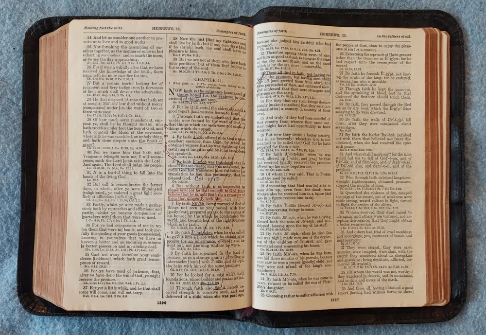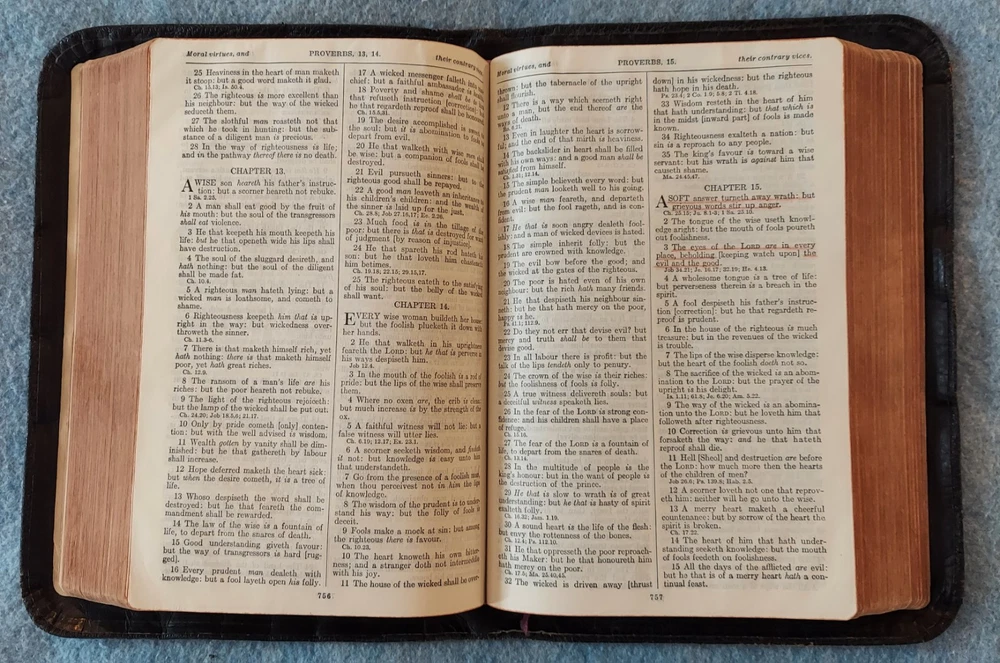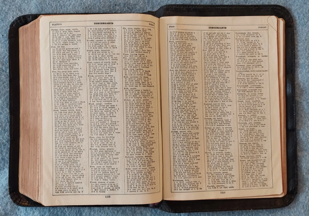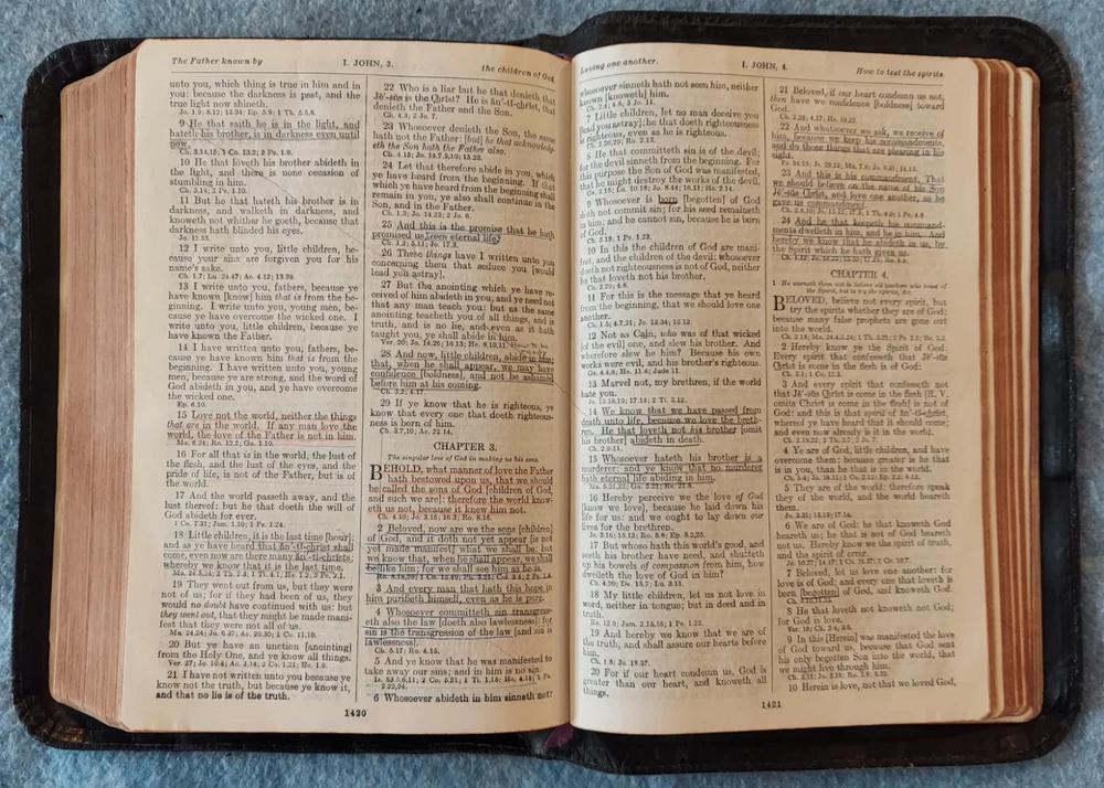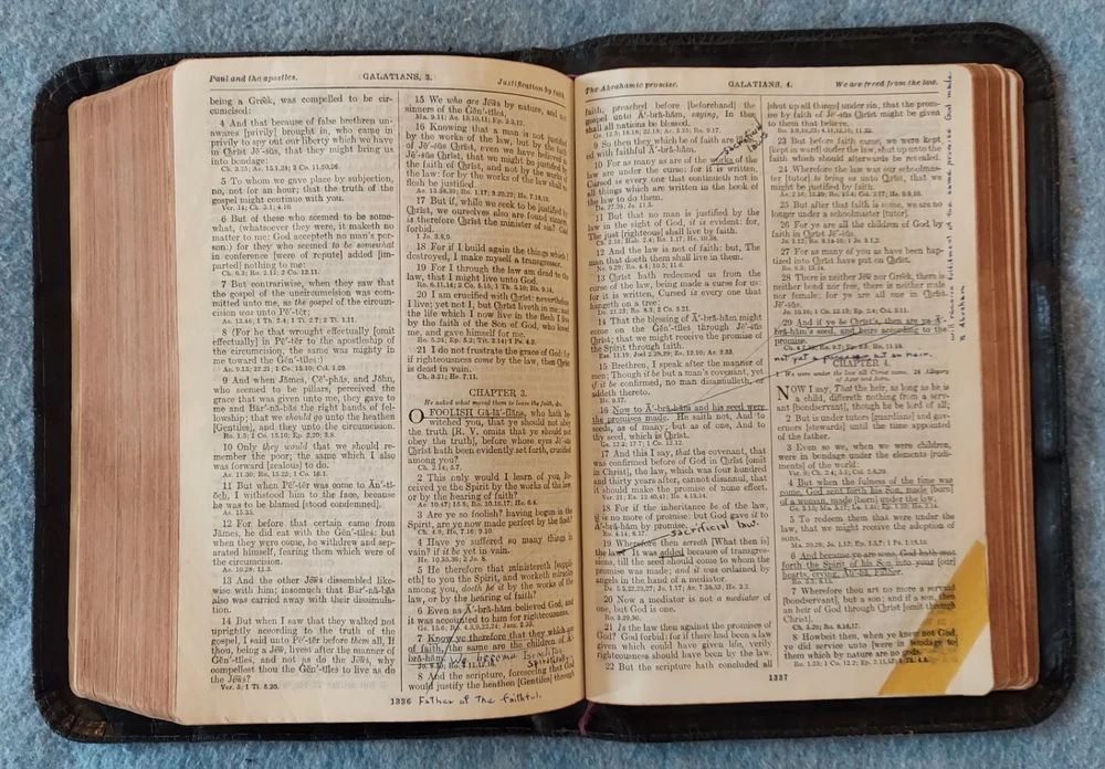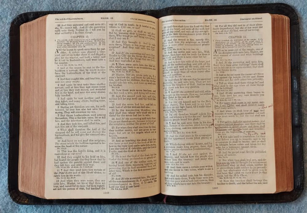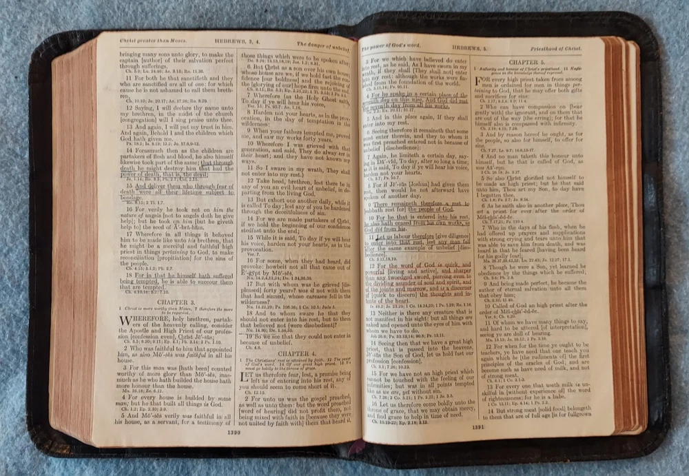New Analytical Edition Bible Dickson 1941 King James KJV Study Helps Genuine Leather The New Analytical Bible and Dictionary of the Bible AUTHORIZED KING JAMES VERSION with the addition, in many instances [in brackets] of the more correct renderings of the American Revised Version, copyright 1929 by the International Council on Religious Education and used by permission A System of Helps COMPRISING TEXTUAL REVISION, A DICTIONARY OF THE BIBLE, INTRODUCTIONS TO EACH BOOK, A CHART OUTLINE OF EACH BOOK OF THE BIBLE, ANALYSIS OF THE ENTIRE BIBLE, TREATMENT OF THE OUTSTANDING FACTS OF EACH BOOK, CONTEMPORANEOUS HISTORY, A SPECIALLY ARRANGED HARMONY OF THE GOSPELS, THE TEACHINGS OF JESUS IN ALPHABETICAL ORDER, A COMPREHENSIVE INDEX OF ALL THE SUBJECTS OF ALL THE HELPS, AND MANY OTHER FEATURES OF EXCEPTIONAL CHARACTER AND EXCELLENCE TO FACILITATE THE STUDY AND BETTER UNDERSTANDING OF THE SCRIPTURES. JOHN A. DICKSON PUBLISHING COMPANY CHICAGO 1941 (Copyright 1931, 1938, 1941) MANUFACTURED IN THE UNITED STATES OF AMERICA Genuine Leather cover 6 ½ x 10 x 1 ¾ inches, 1639 pages plus Index, Index to Biblical Place Names, and Maps Unusual Helps and Features comprised of: · A Dictionary of the Bible · Introduction to Each Book · A Chart Outline of Each Book · Analysis of the Entire Bible · Treatment of Outstanding Facts of Each Book · Contemporaneous History · A Harmony of the Gospels Specially Arranged · The Teachings of Jesus in Alphabetical Order · A Concordance · Maps · A Comprehensive Index to Important Subjects, Persons, Places and Things to Facilitate Study an Understanding of the Scriptures · Many other features of exceptional character and excellence Also · A system of verse-end cross-references Topical page headings Brief chapter outlines · Pronouncing (clues to proper pronunciation of proper names) Gold gilt finish on the page edges This vintage Bible is in good condition . The name and address of the previous owner is written on the first page with brief notations on the next three pages. Marks are observed on many pages of the Bible text (underlining and brief notations) (175 that I counted). One page corner is torn and taped (Galatians 4-5). The binding is good. The cover has a bit of shelf/edge wear with some scuffing around the edges and at the top & bottom of the spine. Please see the photos. The gold gilt finish on the page edges is a bit worn and scuffed.