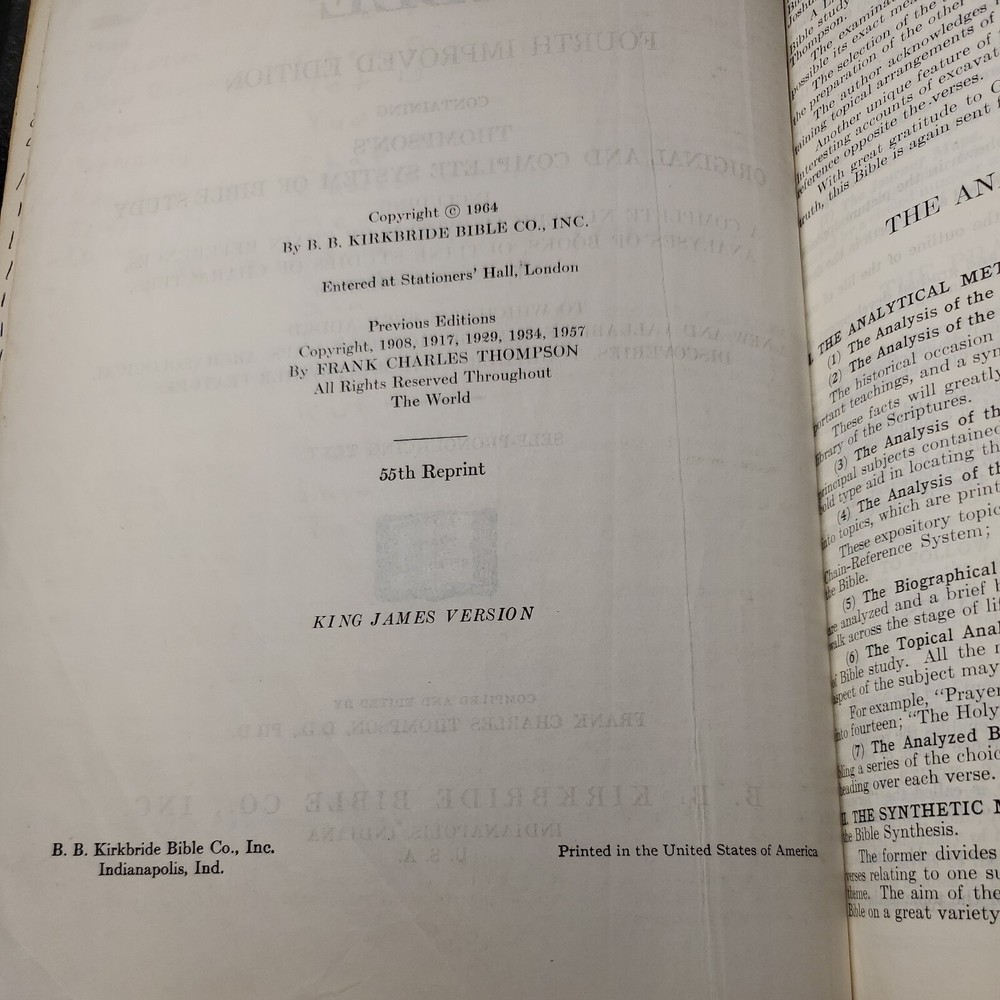 New Chain Reference Bible Thompson's 4th Improved Edition 1964 King James Version KJV. The New Chain Reference Bible Fourth Improved Edition" by Thompson. In the King James Version (KJV). 1964 by B. B. Kirkbride Bible Co. 55th reprint. Has name embossed on front cover as shown. In nice condition otherwise, showing some wear mainly on spine ends. Many markings notes highlighting. Old ribbon gone, new glued in. Weight is 2 lb 11 oz before packaging. 7 × 9¼ × 1½" Offers always considered. Thank you for looking. PS1-3bb.031124.34.9