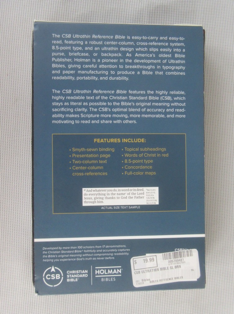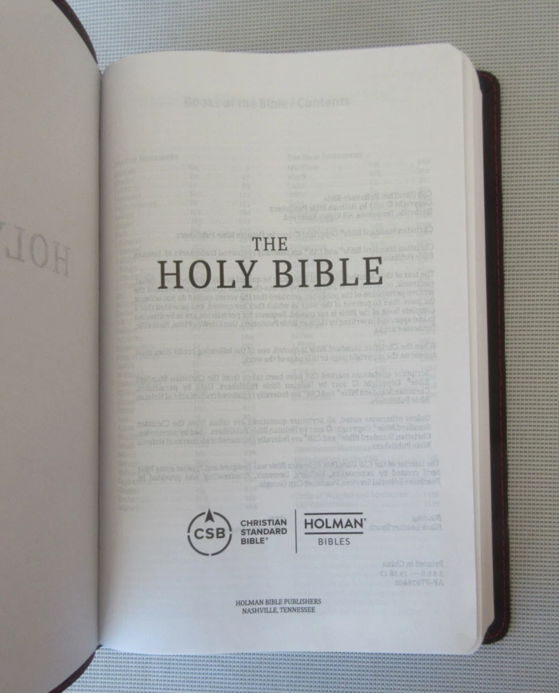 Christian Standard Bible published by Holman Bible Publishers Nashville 2017 Please note: the sleeve identifies this Bible as having a brown LeatherTouch cover. This is an error as this Bible actually has a black LeatherTouch cover (see photos.) New; removable protective sleeve; softcover; maps; concordance; red letter edition; binding tight; internal and external hinges intact; black LeatherTouch (imatation) cover; silver text and graphics on spine and front cover; 1196 pages; no markings found; no torn or missing pages; 8-5/8" x 5-5/8 ". I am not a professional book appraiser. Please use the photos to make your own judgment of the book's condition. Shipping to any domestic (US) address will be made through USPS Media Mail (2 - 10 days delivery time.) Purchases with shipment to any location outside the United States will be made via Priority Mail International. Any duties and/or customs charges are the responsibility of the buyer. Combined shipping is available on most of our listings. If a calculated shipping charge on multiple items seems unreasonable, it probably is. Sometimes the eBay Rate Calculator has a mind of its own. Contact us with your interests and with your zip code and we will do our best to respond quickly with an accurate shipping quote. All items we offer are guaranteed to be correctly represented to the best of our knowledge. Most of the items we list are vintage or antique, and may have minor nicks, dings, scuffs, scratches, wear, etc. as would be expected. In our descriptions of listings we try to be as complete as possible. The absence of a condition statement does not imply that the item is in perfect condition or completely free from wear and tear, imperfections, or the effects of aging. What is found in the description and/or seen in the photos is the extent of what is included in this listing. Please do not assume that this listing has or should have additional parts, pieces, or accessories that are not detailed in the description and/or is not shown in the photos. If you need more details or have any specific questions about the listing or what is included please email us prior to purchase. All items are sold "as is." By purchasing this item you are agreeing that 1) you have read the complete description, 2) reviewed all photos, and 3) have asked any questions of concern.