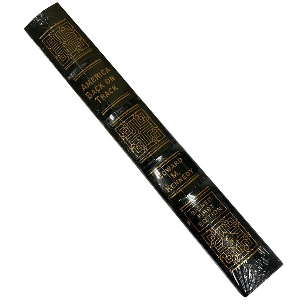 Personally signed Edward M. Kennedy, who represented Massachusetts in the United States Senate for 47 years. SIGNED FIRST EDITION. NUMBERED EDITION OF 1,750 Easton Press, Norwalk CT. 2006. Edward M. Kennedy "America Back On Track" Signed First Edition. Luxuriously bound with full genuine leather with 22kt gold accents. Hardcover book without dust-jacket as issued. Personally signed by the author on the special title page. Sealed with COA. The four-decade senator identifies a crossroads in America while contending that the country has stepped away from its basic ideals, in a call for national reform that proposes changes to national security, health care, education, civil rights, energy, and the environment. Edward M. Kennedy (1932-2009) represented Massachusetts in the United States Senate for 47 years. In 2004 he began interviews at the Miller Center of the University of Virginia for an oral history project about his life. For his 2009 memoir, "True Compass," he drew from his 50 years of contemporaneous notes from his personal diaries and worked closely on the book with Pulitzer Prize-winner Ron Powers, co-author of "Flags of Our Fathers" and author of "Mark Twain: A Life." From Publishers Weekly As the title implies, Senator Kennedy's book of political history, criticism and advice is an effort to reawaken the belief in progress that underlay politics in the 1960s, often lauding his brother's presidency and Johnson's just after. Kennedy presents some of his most important points in bulleted lists, giving the appearance of simplicity and clarity on complex topics like ways to adjust to globalization and "the shrinking world," steps to achieve "a sound energy conservation policy" and how to provide health care for all. Although Kennedy isn't often as clear as his bulleted points make it appear, his straightforward solutions—like equal federal, state and local government funding for education and an increase in the minimum wage to $7.25—are refreshing. Not unexpectedly, Kennedy's proposals also involve sharp criticism of the Bush administration: for focusing on the military war on terror rather than taking a broader view of global security; for the "politicization" of government agencies and departments like the FDA; for undermining civil liberties. His book will probably not start the next revolution, but Kennedy's talking points and proposed solutions offer a good basis for discussion, which, after all, is one aspect of democracy—which he fears is disappearing, or rather, being repressed. (Apr. 20) Copyright © Reed Business Information, a division of Reed Elsevier Inc. All rights reserved. From Booklist America's iconic liberal offers his analysis of how and why the nation has gone astray from its values and principles and how it can recover. Kennedy begins with a short history of the challenges that have faced the nation in the past and the proud achievements that have resulted from bold action. He acknowledges the changing political landscape since 9/11 with increased political polarization and concern about national security. Kennedy identifies seven challenges, devoting a chapter to each with historical references to provide cautionary lessons and solutions for getting back on track. With a Senate career spanning four decades, Kennedy sees the nation's primary challenge as reclaiming our constitutional democracy built in checks and balances between the branches of government. Kennedy criticizes the "unprecedented secrecy" of the Bush administration and the "bullying" of Republicans that prevents greater cooperation between Congress and the executive. In his first major policy book in more than 20 years, Kennedy also identifies other challenges, such as achieving an economy that provides equitably and providing healthcare to all Americans. Whether Kennedy fans or not, readers will appreciate his heartfelt concerns about the nation's direction and the ideals we all share. Vanessa Bush Copyright © American Library Association. All rights reserved Edward M. Kennedy Edward Moore "Ted" Kennedy (February 22, 1932 – August 25, 2009) was an American politician who served as a U.S. Senator from Massachusetts for almost 47 years, from 1962 until his death in 2009. A member of the Democratic Party and the Kennedy political family, he was the second most senior member of the Senate when he died and is the third-longest-continuously-serving senator in United States history. Kennedy was a brother of President John F. Kennedy and U.S. Attorney General and U.S. Senator Robert F. Kennedy—both victims of assassination—and was the father of Congressman Patrick J. Kennedy. Ted Kennedy was 30 years old when he first entered the Senate following a November 1962 special election in Massachusetts to fill the vacant seat previously held by his brother John, who had taken office as the president. He was elected to a full six-year term in 1964 and was later re-elected seven more times. The Chappaquiddick incident in 1969 resulted in the death of his automobile passenger, Mary Jo Kopechne. Kennedy pleaded guilty to a charge of leaving the scene of an accident and later received a two-month suspended sentence. The incident and its aftermath hindered his chances of ever becoming president. His only attempt, in the 1980 election, resulted in a Democratic primary campaign loss to the incumbent president Jimmy Carter. Kennedy was known for his oratorical skills. His 1968 eulogy for his brother Robert and his 1980 rallying cry for modern American liberalism were among his best-known speeches. He became recognized as "The Lion of the Senate" through his long tenure and influence. Kennedy and his staff wrote more than 300 bills that were enacted into law. Unabashedly liberal, Kennedy championed an interventionist government that emphasized economic and social justice, but he was also known for working with Republicans to find compromises. Kennedy played a major role in passing many laws, including the Imm