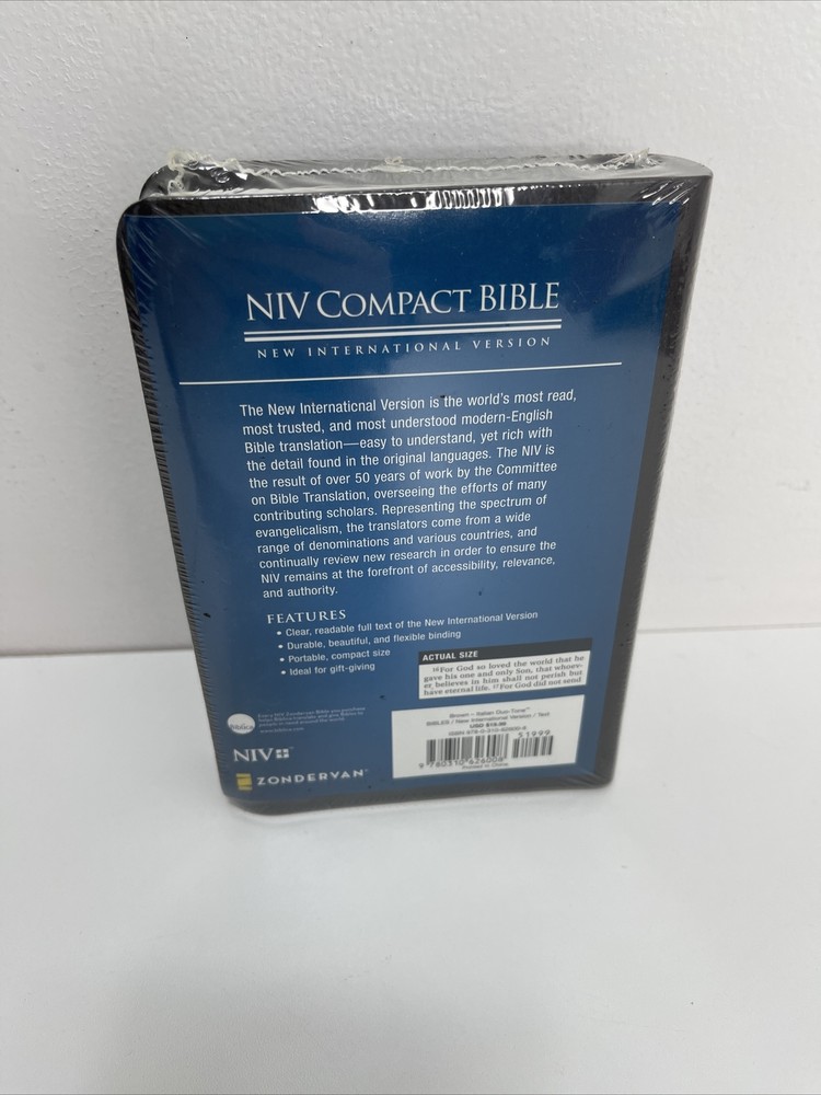 New International Version (NIV) Compact Brown Leathersoft Bible In Cellophane. Still sealed Please see all photos for item condition as they are included as part of the condition. SHIPPING. Approximately 80% of our material is re-used or recycled! Our US shipping and handling charges are stated individually in each listing and are determined by Weight, Size, Zone and Packing material. Payment is expected quickly and feedback is given accordingly. Purchases will be mailed within 1-3 days after receipt of payment. Returns of new items must still be as packed in their new unopend containers to receive credit. International shipping: if you the buyer refuses to pay duties and taxes on an international order, the cost of return shipping will be deducted from the buyers refund. Any measurements included in listing are all done flat lay. Any stock photos used are for visual use only of what item would look like on. Now that the formalities are taken care of; Thanks for looking and supporting small businesses, please check out the rest of our store and don't hesitate to send us a message. We would love to help if we can. Have a Wonderful Day