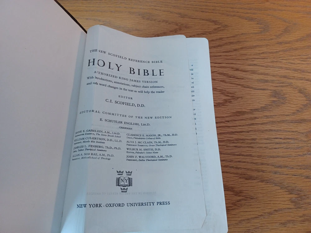 New Scofield Reference Bible 1967 Holy Bible Oxford University Press Leather There is some wear to the cover. The book has wear on the corners. There may be some marks in or on the book. Books are stored on a bookshelf in A/C. They are in a dark room and are well maintained. If you have any questions or concerns about this book please contact me. Listing and template services provided by inkFrog