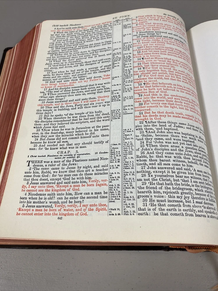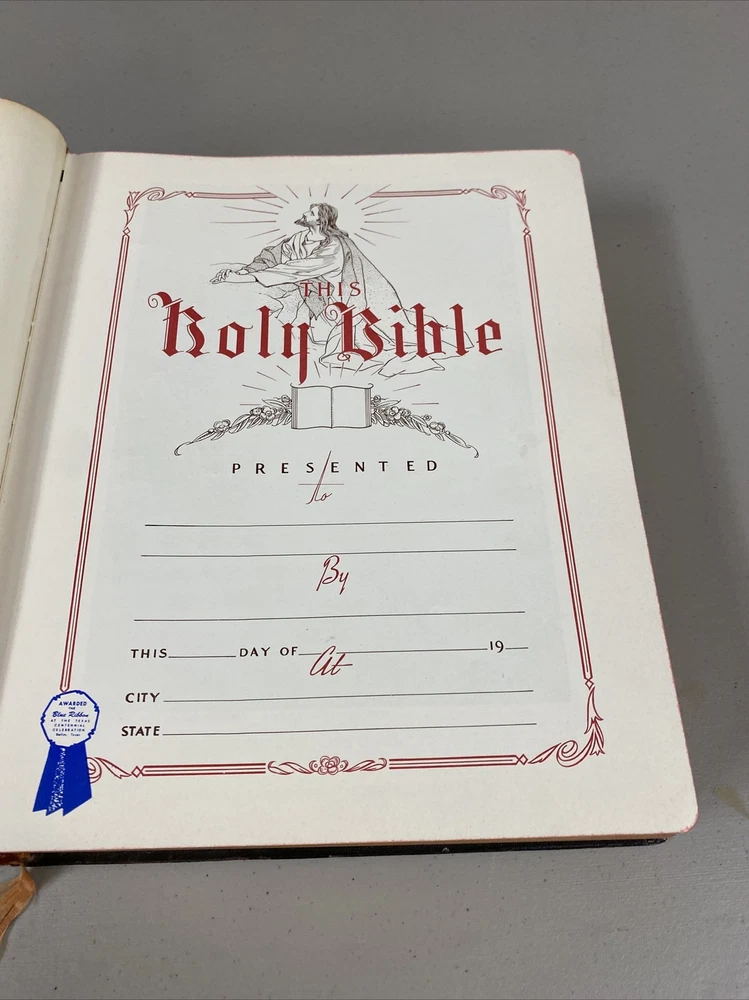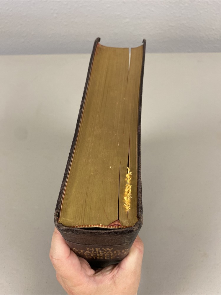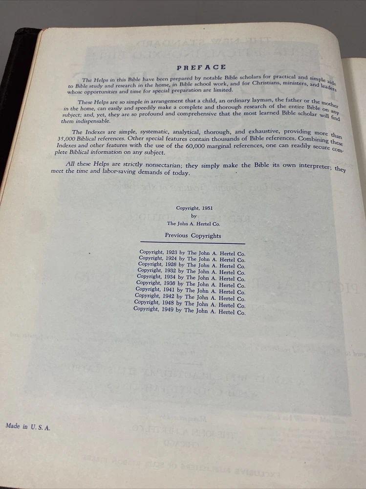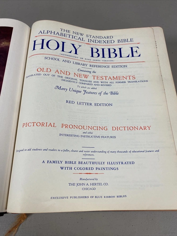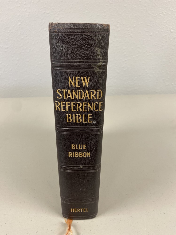 New Standard Reference Bible Blue Ribbon Hertel Leather Red Letter Edition 1951. A great Bible to add to your collection! The pictures do a great job showing the condition, and as one can see, there's some wear and tear on this Bible, especially on the cover. There is no writing or markings in this Bible. Let me know if you have any questions! Blessings!