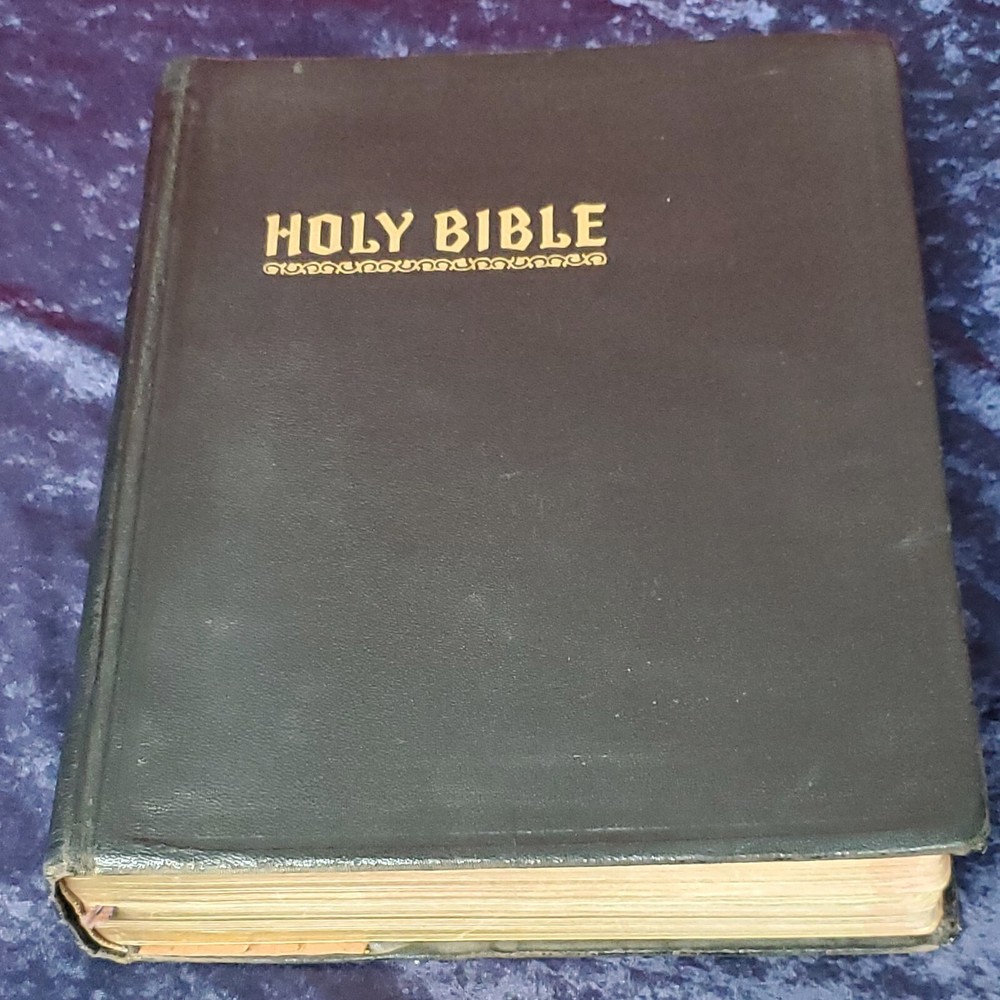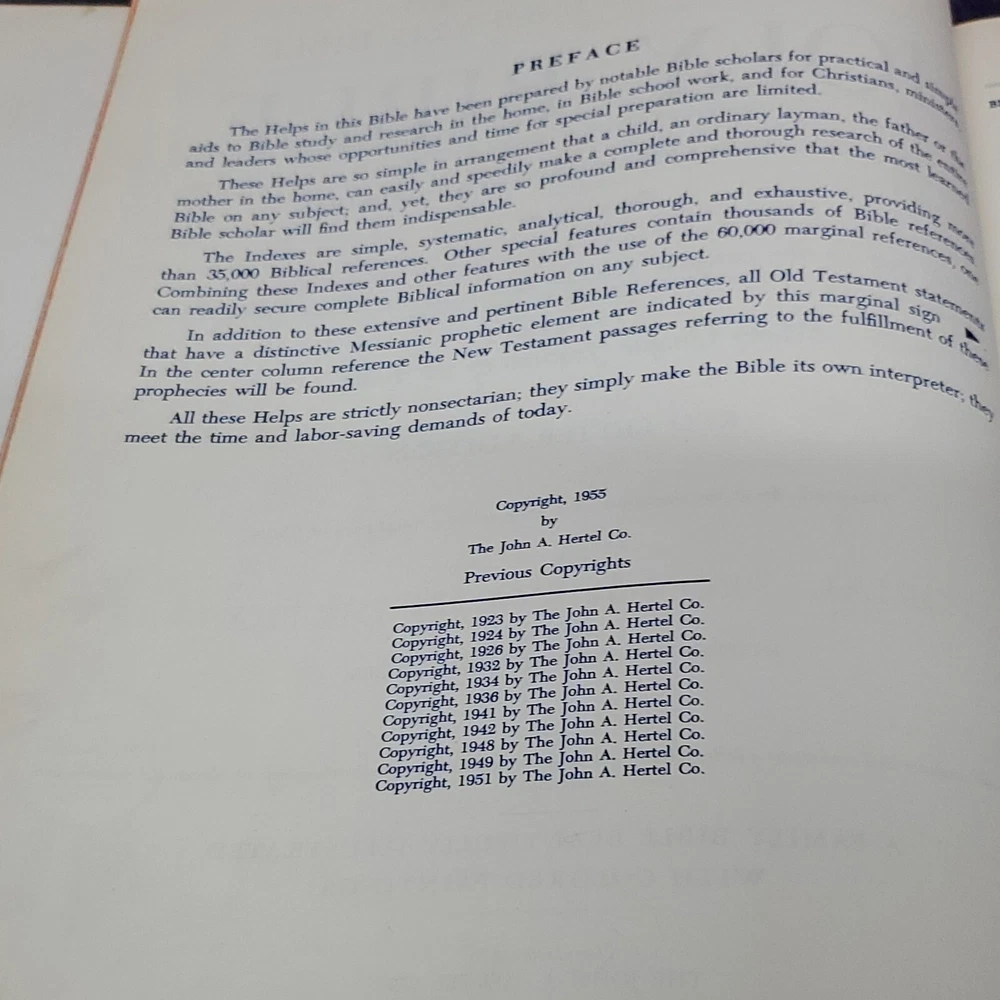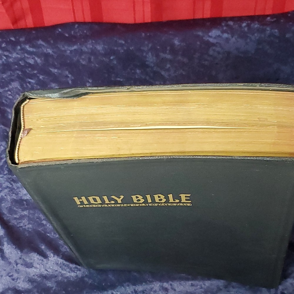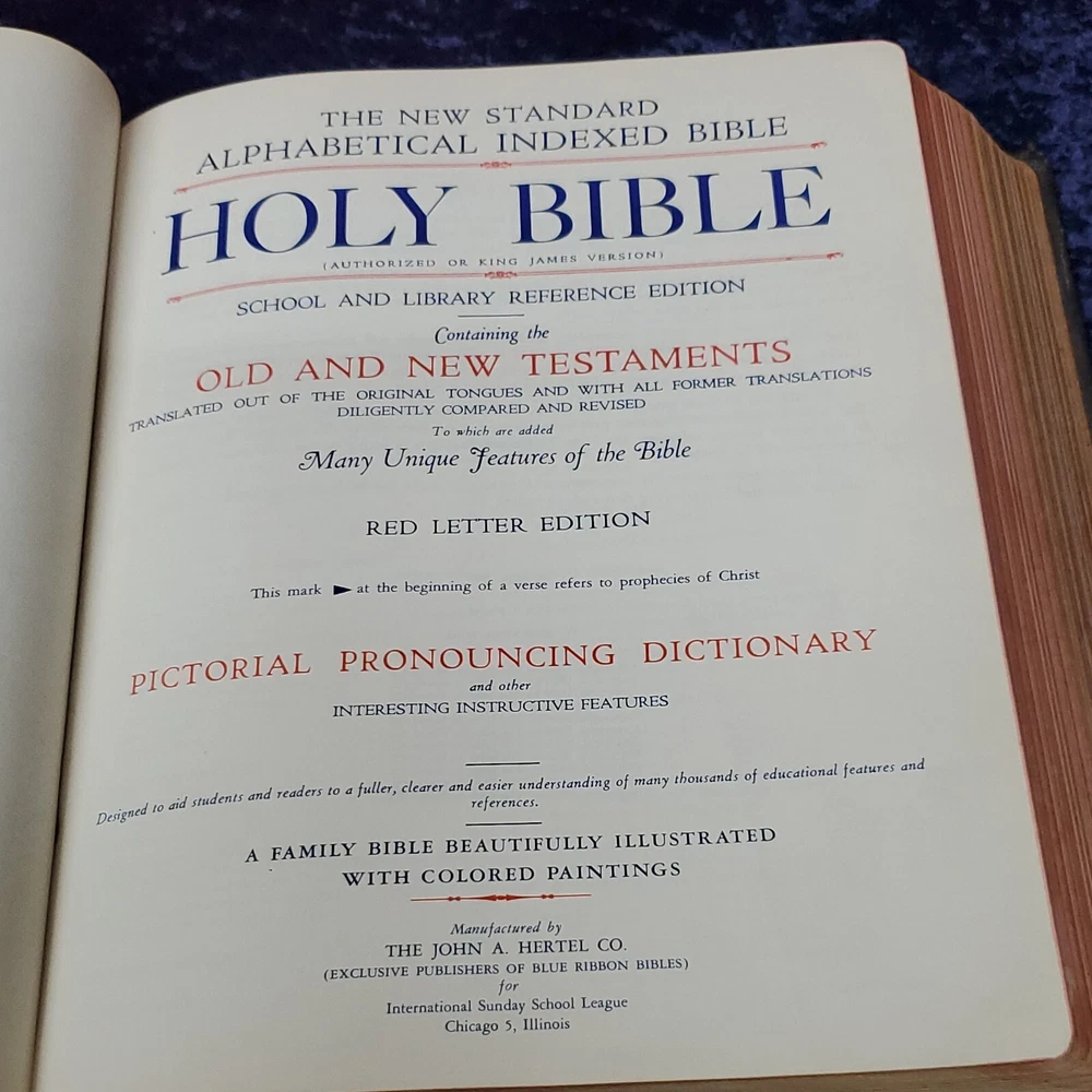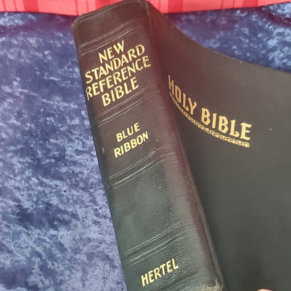 Hertel Blue Ribbon Holy Bible New Standard Reference 1955 Edition. There is no writing found in the Bible. In awesome condition. Church stamps on first and last pages. Table of contents: Bible, character analysis, charts, children's prayers, concordance, dictionary, family registry, index, laws, maps, military service record, miracles, parables, religious workers and Bible teachers Miracles, ... Special features: colored paintings from selected subjects, strange and interesting facts about the Bible, leading doctrines of The Holy Bible, harmony of the 4 Gospels, the Bible in education, divisions of the Bible, synopses of the books, 10 commandments, the beatitudes, Jewish, Apostles creed, Jewish calendar, et cetera. This is a large heavy rather well preserved vintage book. I enjoyed looking through the many extras that they've included. Very interesting. 68 years of use has left it's evidence, not perfect condition but still worth it. Weight is 6 lb 15 oz before packaging. 9½ × 11⅝ × 2¼" Offers always considered. Thank you for looking. PS1-3ca.091223.34.9