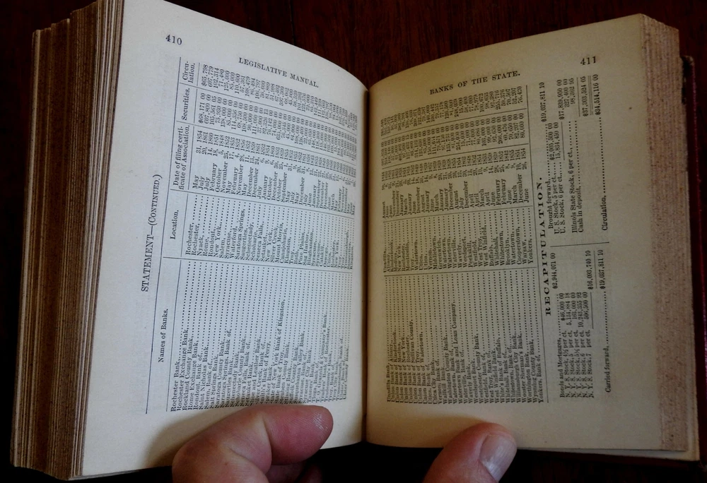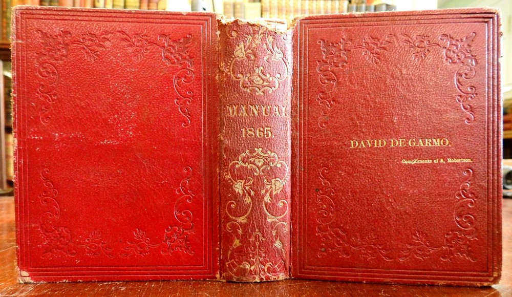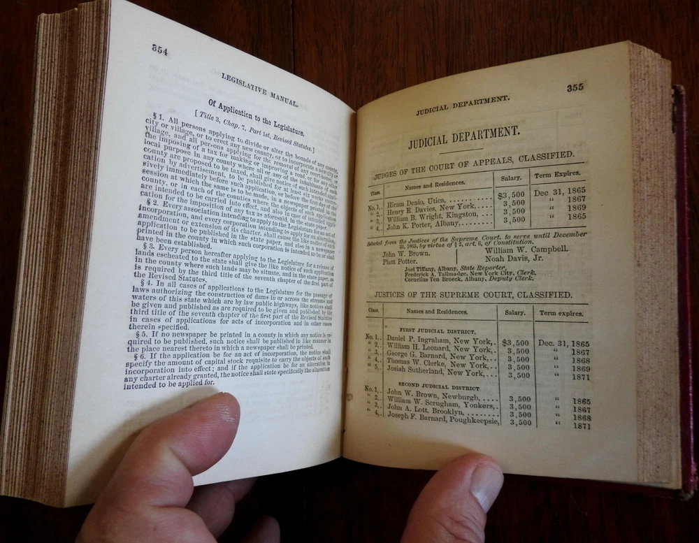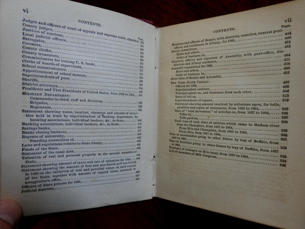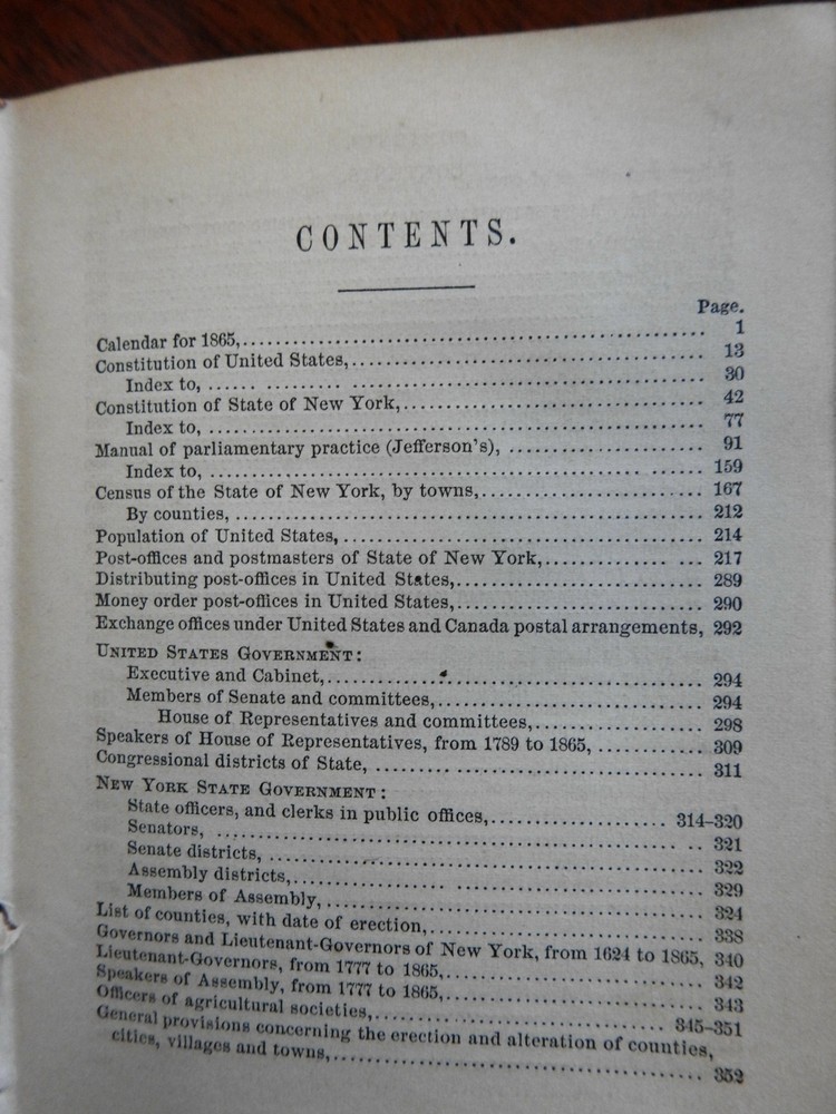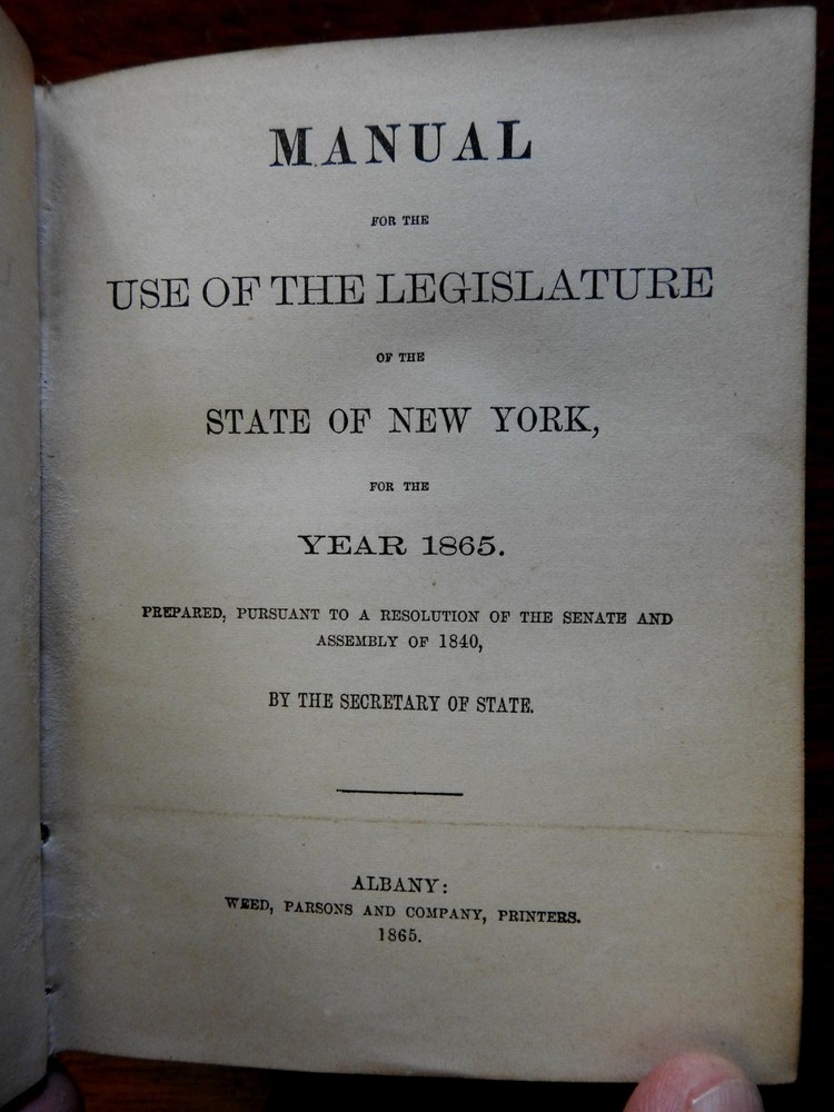 New York State Legislature Handbook 1865 political 2 folding plans leather book New York State Legislature Handbook 1865 political 2 folding plans leather book (Old Books, New York State Legislature, Handbook, Government Guidelines, Building Plans). Manual for the Use of the Legislature of the State of New York for the Year 1865. Published 1865, Albany by Ward, Parsons and Company. 561 pages. Text in English. 2 folding plans of the legislature chamber at front. Period full leather binding, smooth spine, gilt decorated and lettered, gilt and blind embossed cover decorations. Binding remains clean, tight, and sound. Book remains well preserved and attractive on the shelf. Spine head chipped, some surface scuffing and rubbing, but still displays a pleasing and unique age patina and is in nice antiquarian condition, the age flaws easy to overlook or forgive. Please review photos for more detail and our best attempt to convey how this antique item survives. Book Measures c. 5 3/4" H x 4 1/2" W. [B285].