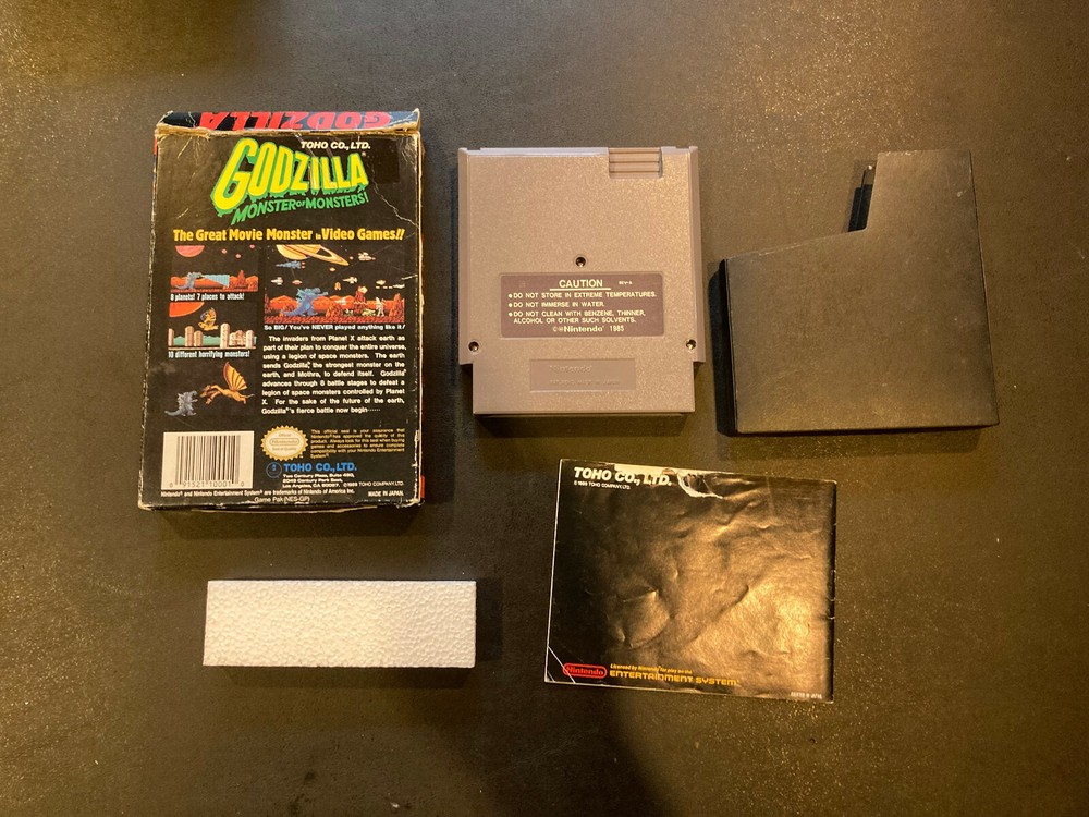 Godzilla: Monster of Monsters for Nintendo. Tested working. Authentic Cartridge. Box has some wear. Manual has some wear/tear. Please see pictures. Any questions please ask.