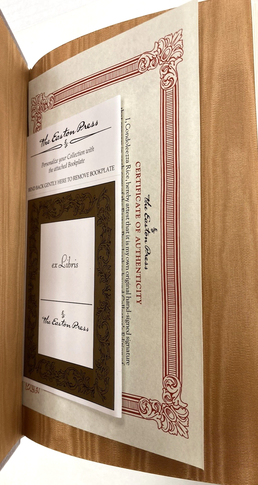 "No Higher Honor: A Memoir of My Years in Washington" by Condoleezza Rice. Easton Press, 2012, signed by Rice. COA, unused bookplate and "Note" laid in. Dark red full leather with bright gilt lettering and decoration; trace wear only. A few tiny scuffs to gilt edges. Binding sound and unread, interior clean. Brown silk moire eps and satin ribbon bookmarker. No prev owner names, stickers or stamps. Not ex-library. Measures 9 1/2'' x 6 3/8". 766 pp. From a smoke free home. Shipping on multiple items is combined whenever possible. Shipping rates are based on final weight and dimensions of packed item(s). Colors may differ slightly from reality due to differences in computer/mobile displays. Please bid with care and examine all photos and read entire description before bidding. Please pay within 3 days of auction's end. If payment is not made in a reasonable amount of time and no response is made to my messages, I will open an unpaid item case and you will be blocked from future bidding on my items.