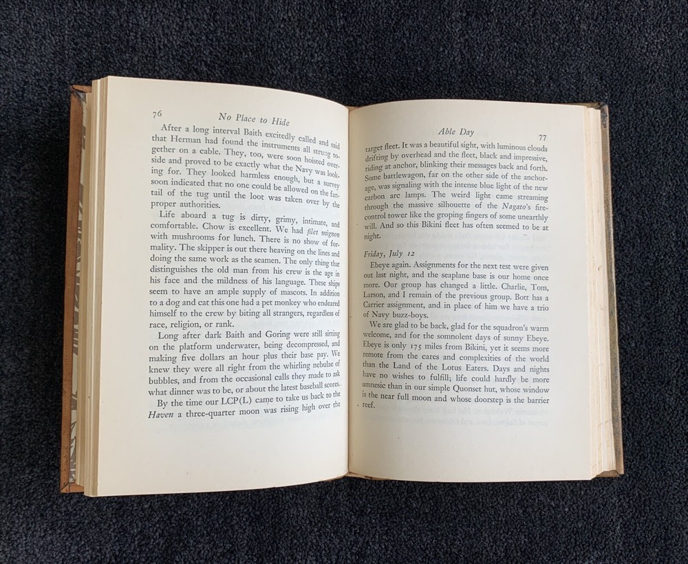 No Place to Hide by David Bradley 1948, Little, Brown, & Co. The book is a Harvard Medical School graduate's autobiographical tale of his work in the Radiological Safety Section in the Pacific in the aftermath of the Bikini atomic bomb tests, Operation Crossroads. b24