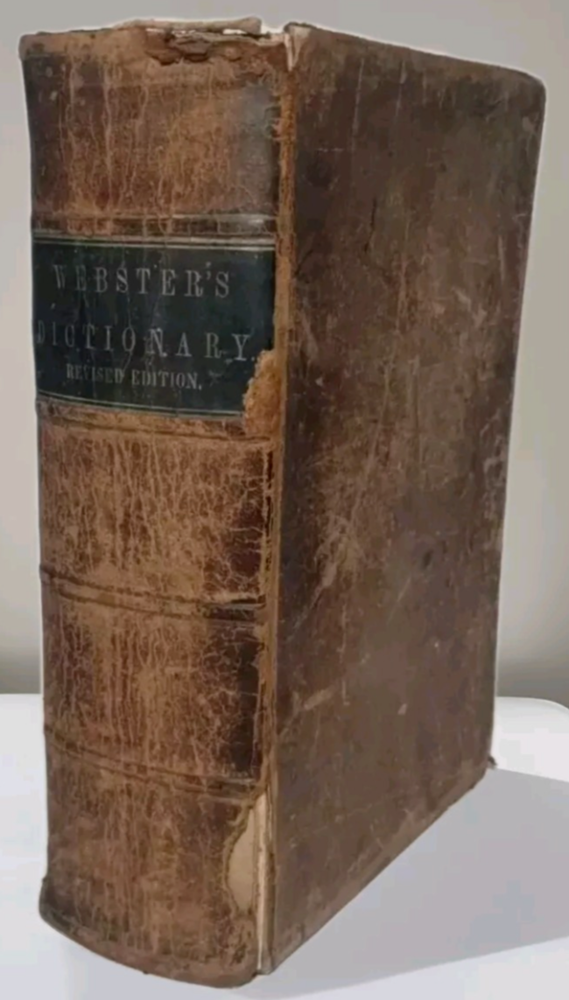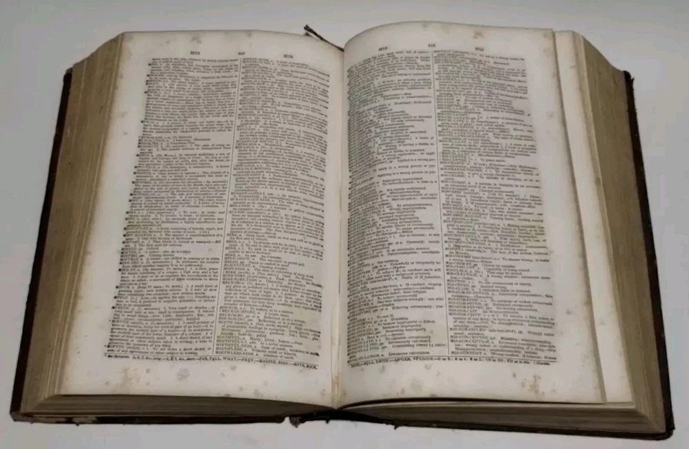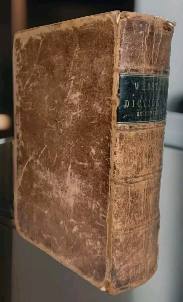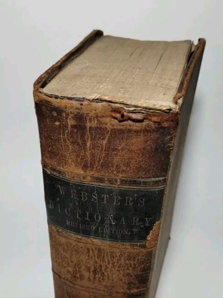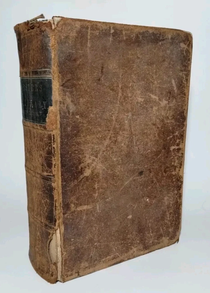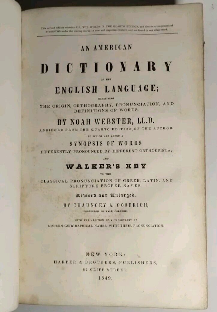 A rare 1849 original leather-bound English American dictionary by Noah Webster. This antique book is a valuable reference for collectors, featuring authentic leather binding, English language content, Harper and Brothers publishing. Size ( Approx. ) : 9.5" x 6.5" x 3" In Good Condition, no writing or underlining on the pages, some spots, foxing or discoloration, binding is solid, edge wear on the cover, hinges and boards are in great shape. Packaged with care and shipped via USPS Ground Advantage