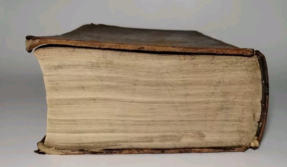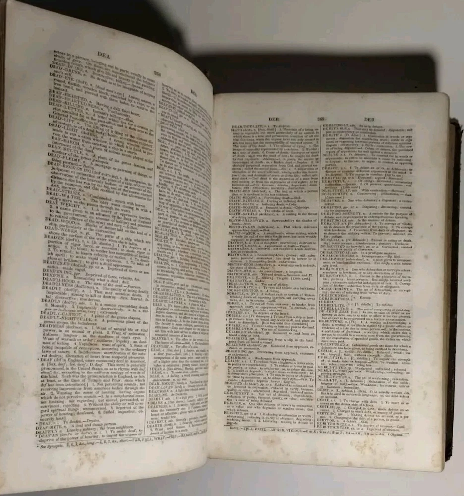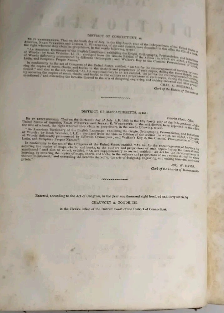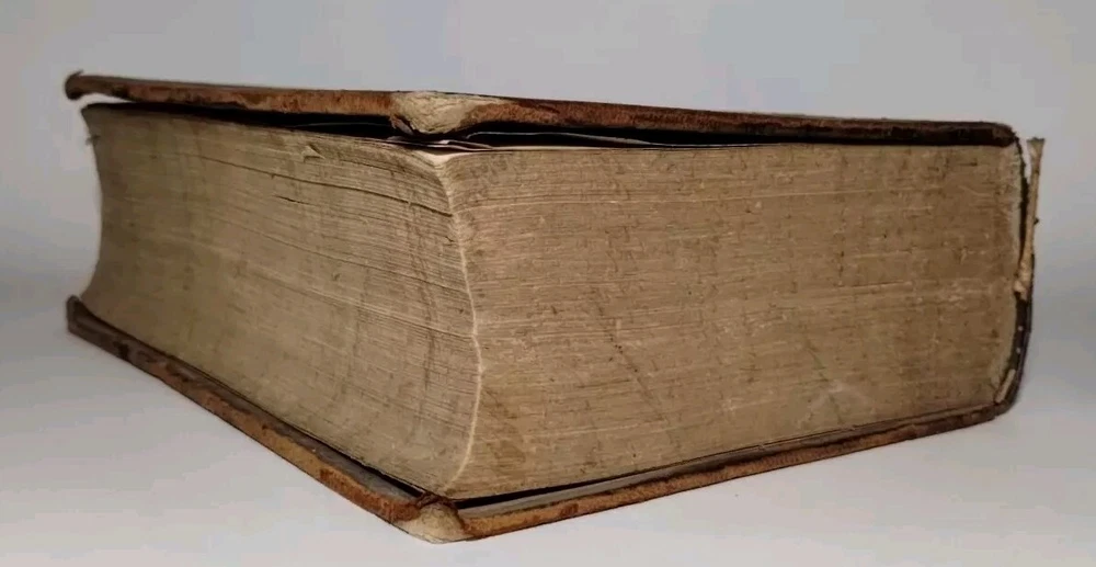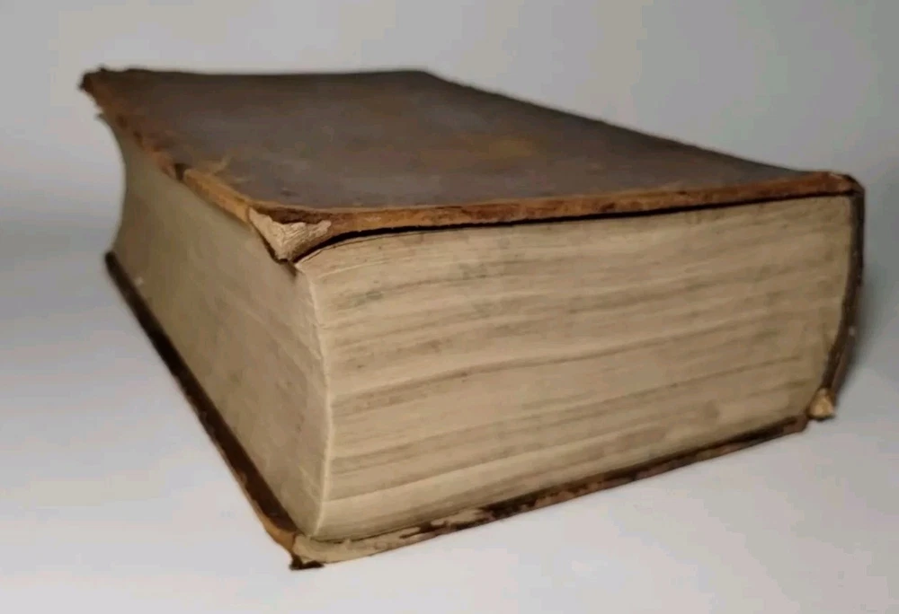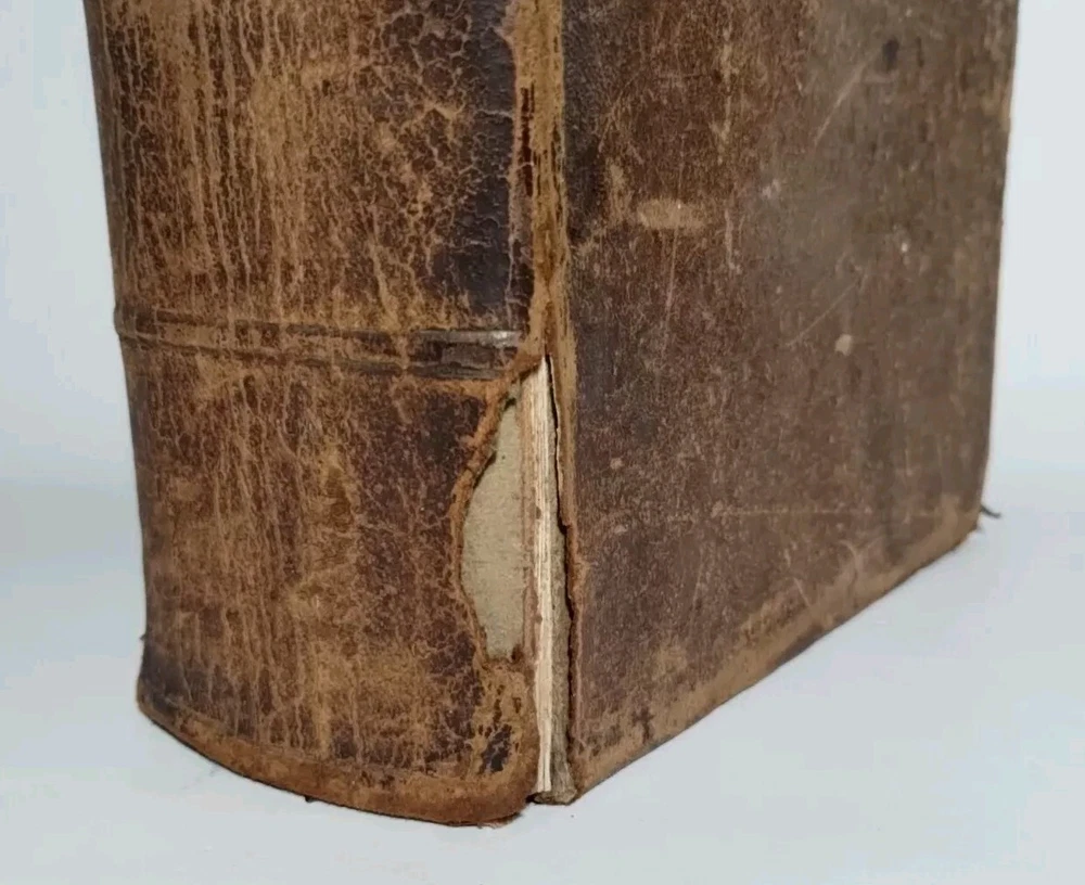 A rare 1849 original leather-bound English American dictionary by Noah Webster. This antique book is a valuable reference for collectors, featuring authentic leather binding, English language content, Harper and Brothers publishing. Size ( Approx. ) : 9.5" x 6.5" x 3" In Good Condition, no writing or underlining on the pages, some spots, foxing or discoloration, binding is solid, edge wear on the cover, hinges and boards are in great shape. Packaged with care and shipped via USPS Ground Advantage