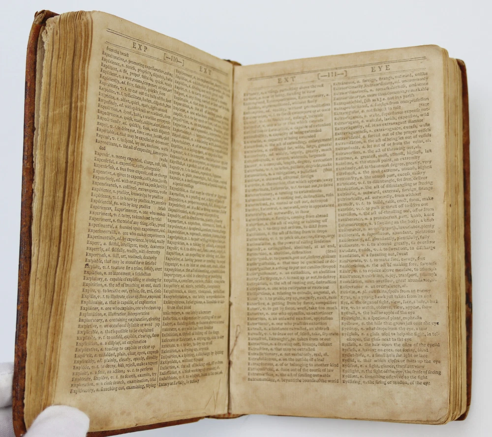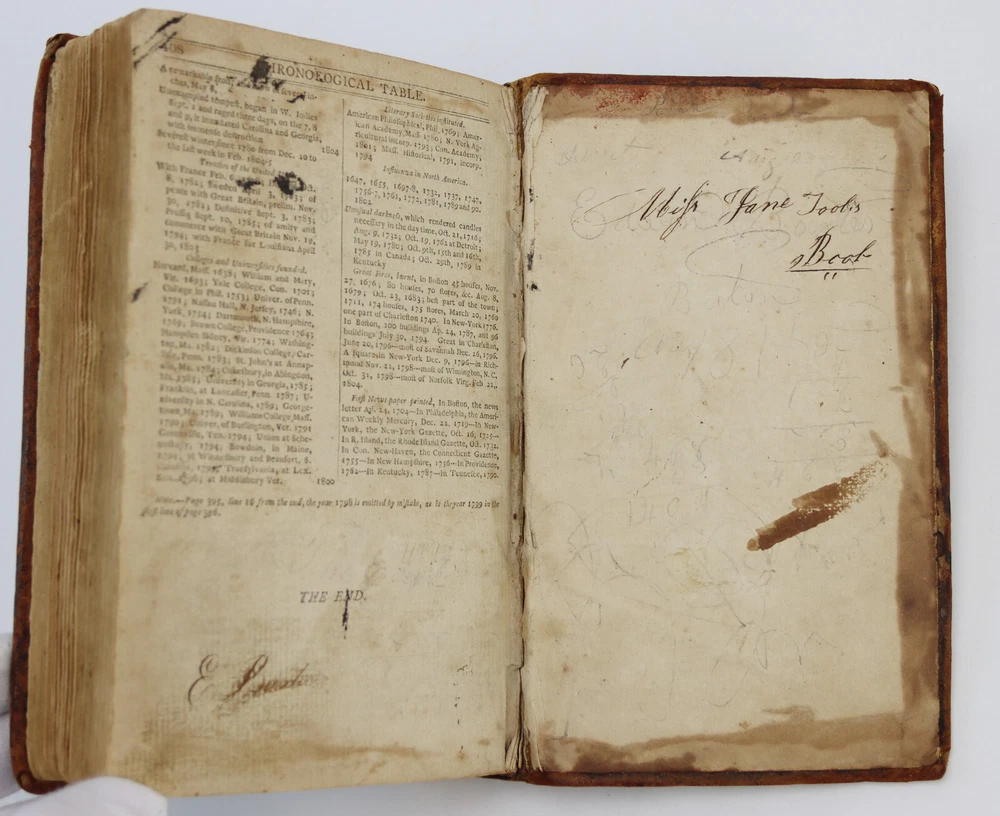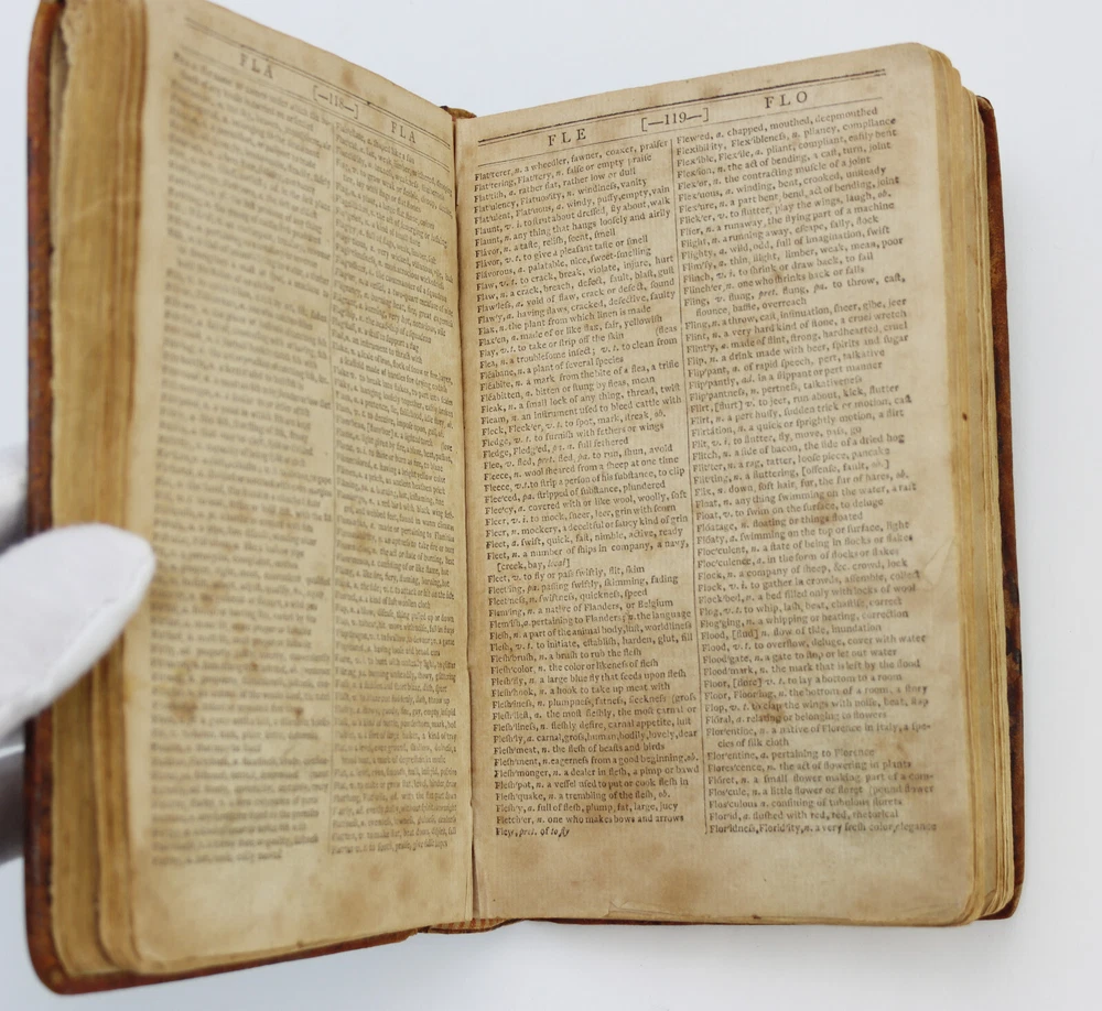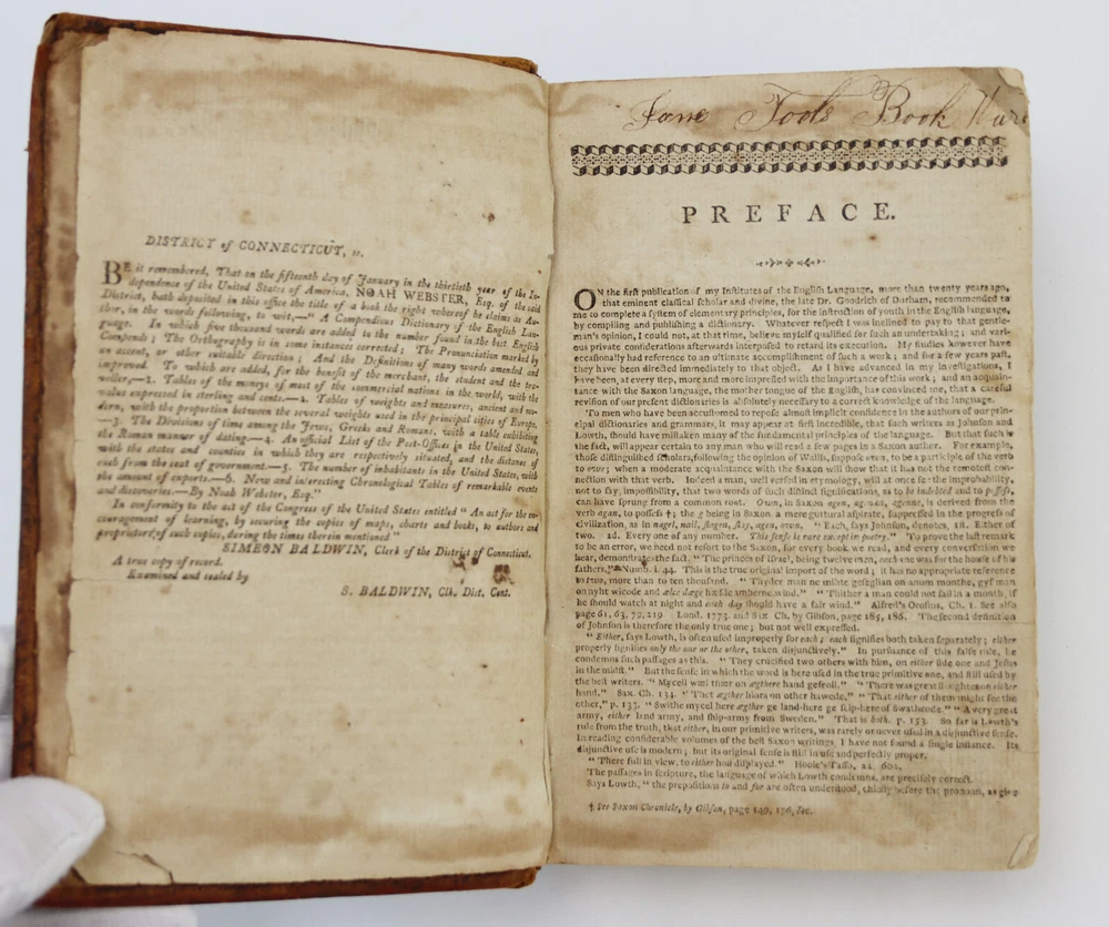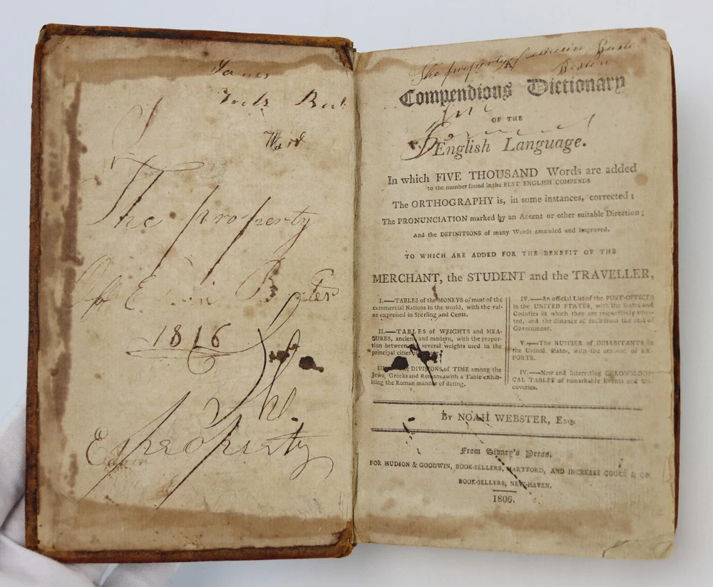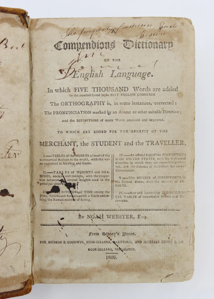 A Compendious Dictionary of the English Language by Noah Webster First Edition, published in 1806 From Sidney's Press For Hudson & Goodwin, Book-Sellers, Hartford, and Increase Cooks & Co. Book-Sellers, New Haven. 408 Pages This is the first edition of Websters dictionary and the first American dictionary. A superb example of this rare and historic edition. Leather binding intact. Toning and foxing, no loose pages. Writing on inside of front cover and back cover. Owner's name on 2nd page. Item will be carefully packed for shipped insured.