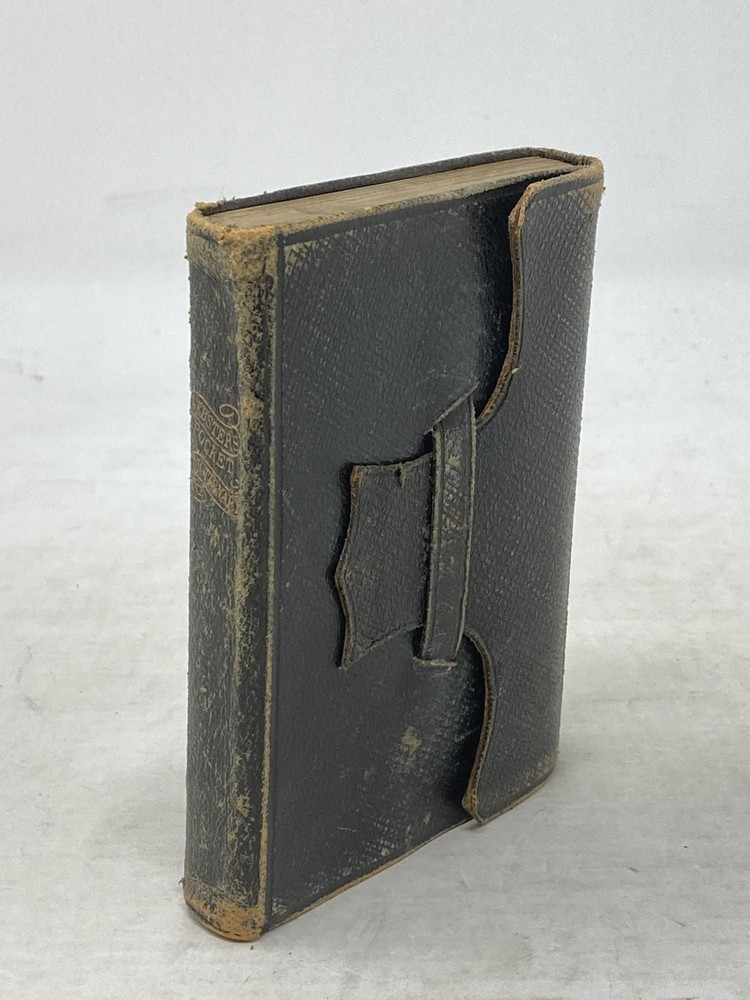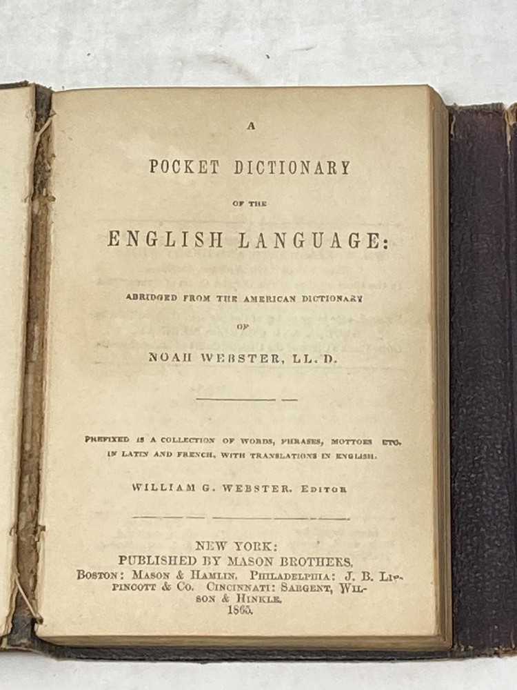 A POCKET DICTIONARY OF THE ENGLISH LANGUAGE: ABRIDGED FROM THE AMERICAN DICTIONARY OF NOAH WEBSTER: PREFIXED IS A COOOECTION OF WORDS, PHRASES, LATIN AND FRECH WITH TRANSLATION IN ENGLISH Author: Webster, Noah (Edited by William G. Webster) Title: A POCKET DICTIONARY OF THE ENGLISH LANGUAGE: ABRIDGED FROM THE AMERICAN DICTIONARY OF NOAH WEBSTER: PREFIXED IS A COOOECTION OF WORDS, PHRASES, LATIN AND FRECH WITH TRANSLATION IN ENGLISH Publication: New York: Mason Brothers, 1865 Description: Leather-bound (Miniature). 32mo, 4.25 in. X 3 in. pp. 249, [1] (advertising). Handsome, soft dark brown morocco with wrap-around scalloped belt and decorative interwoven leather loop. Gilt title to spine. Rubbing to corners and edges. Previous owner's inscription and name to front free endpaper. Hinge split at title page, but holding. Light age-toning to pages. Good Plus. Seller ID: 87323 Subject: Reference Aardvark Rare Books Eugene, OR We work hard to make your Bookbuying Experience safe, easy and fun. Aardvark Books is a proud member of the ABAA (Antiquarian Booksellers Association of America) and IOBA, Independent Online Booksellers Association. Ezra is also an accredited and Qualified Appraiser of Books and Manuscripts, with a designation from the ASA (American Society of Appraisers), with considerable Archive experience as well. Shipping All books shipped to US destinations are sent via the US Postal Service. Faster shipping is available, please ask before paying. We will combine shipping on items purchased at the same time in order to help reduce costs. International shipping is also available. Please inquire for a shipping quote before ordering. This listing was created by Bibliopolis.