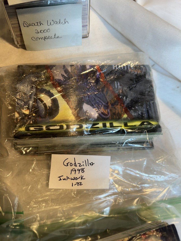 Hi, offering a non sport card lot of 7 sets. Do not include special cards or subsets. Sets put together by hand some cards show some handling and corner wear. Features 3 Hildebrandt sets 2 of the same Death Watch 2000 Jeffery Jones Godzilla Please check out photos to see whats in the lot. Buyer to add 9.49 shipping in the U.S. If outside the U.S. please use Ebay's Global Shipping Program. I am happy to combine shipping on multiple purchases. I have been selling on Ebay for 25 years and really enjoy buying and selling. I would like to assure you that you will be treated professionally, and your items will be packed securely and sent to you in a very timely manner. I usually ship the next day. Most items will have a 30 day return policy. If you have time please check out my store. I sell and collect many different and unique items. Sometimes I have flexibility on the price, just send me an offer.