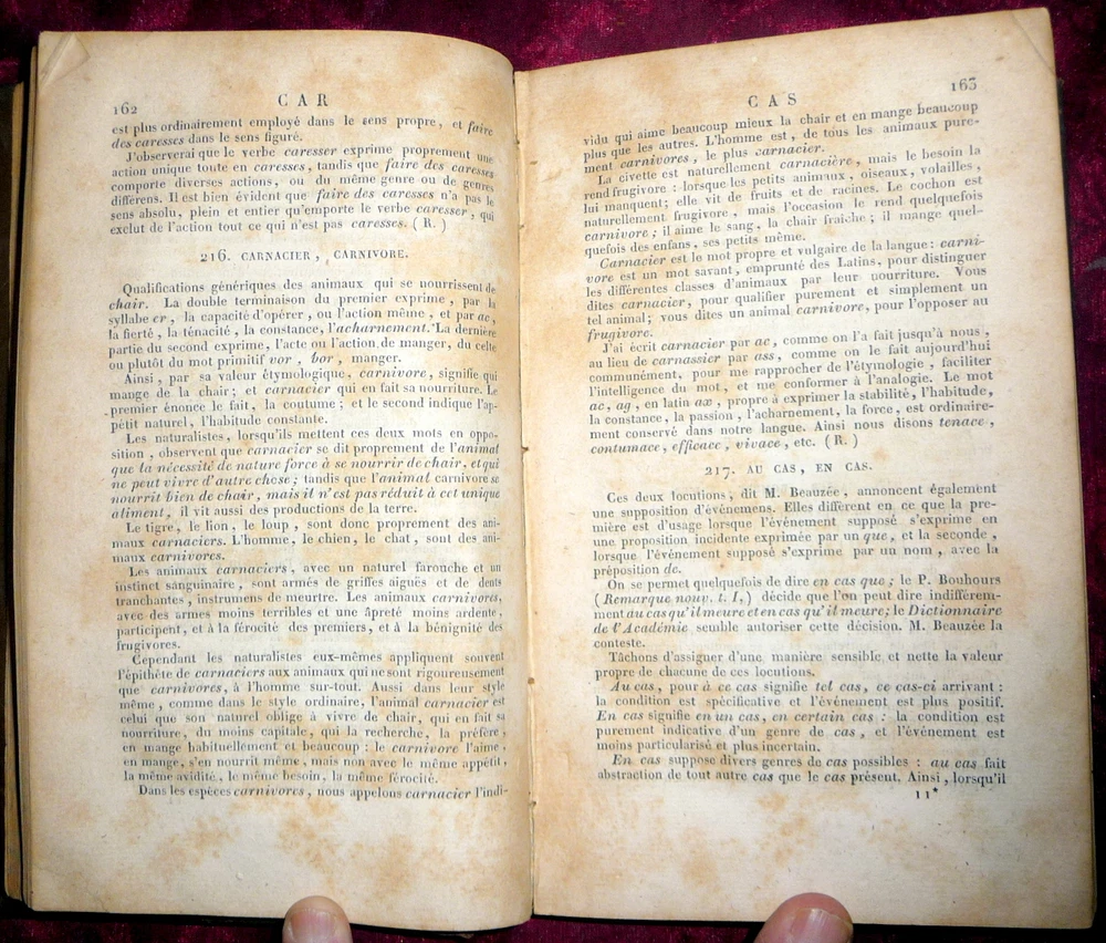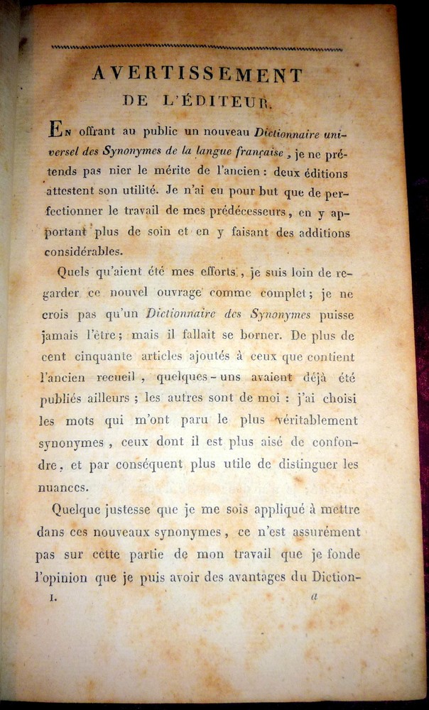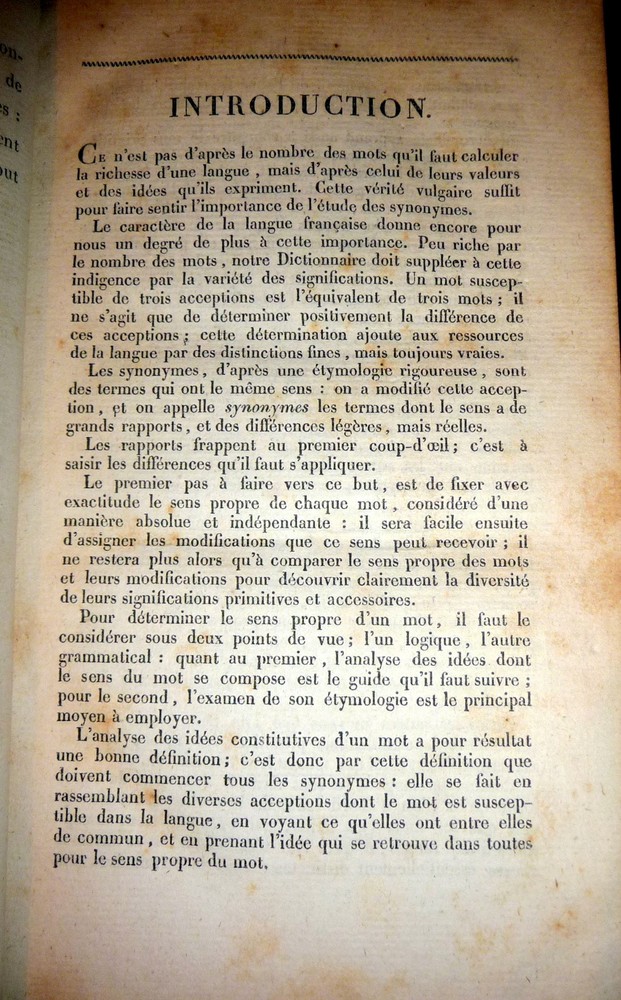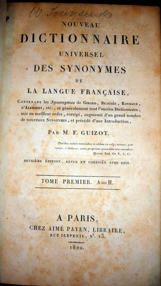 Nouveau Dictionnaire Universel Des Synonymes 1822 French Synonym Dictionary Click to Enlarge Click to Enlarge Click to Enlarge Click to Enlarge Click to Enlarge Click to Enlarge Description: Nouveau Dictionnaire Universel Des Synonymes de la Langue Francaise Contenant les Synonymes de Girard, Beaueée, Roubaud, d'Alembert etc., et généralement tout l'ancien Dictionnaire, mis en meilleur ordre, corrigé augmenté d'un grand nombre de nouveaux Synonymes, et précédé d'une Introduction par M. F. Guizot Deuxieme Edition, Revue Corrigee Avec Soin Tome Premier A - H Chez Aime Payen, Paris, 1822. Hard covers. Leather over boards, marble-patterns page edges and endpapers, 496 pages. CONDITION: Good- Covers (rubbed and worn boards with cloth tape applied at all margins and on spine.) Good Contents (complete and intact but moderately foxed throughout). Tight binding (re-hinged with neatly applied linen tape at front and rear pastedowns). Check our other auctions and store listings for additional unusual items. ( Click here to view all of our auctions ) Shipping and Payment Information Shipping : DOMESTIC Domestic Media Mail shipping, including Delivery Confirmation and Insurance, is standard. This applies to any address in the US and Puerto Rico, as well as to APO addresses. Media Mail, available only for domestic shipping, is trucked to its destination, and shipped by boat to Alaska, Hawaii and Puerto Rico, On the average it takes 3 to 10 days to arrive, depending on the distance and the vagaries of the US Postal Service. Shipments to Alaska, Hawaii, APO and other off-shore addresses take longer to arrive. During the pre-Christmas season, Media Mail is subject to delays. When filling out the Ebay Detailed Seller Ratings, please keep in mind that the sometime slow arrival is due to the performance of the Postal Service and not to any tardiness on the part of the seller. For expedited domestic mailing, Priority Mail shipping can be arranged at an additional cost. For most books, we charge between two and nine dollars for this service, including delivery confirmation and insurance. For heavy sets or high-value books, the charge may be higher. INTERNATIONAL For international shipping, we urge bidders to request quotes of shipping costs before bidding. We will also specify international shipping options and prices after the conclusion of the auction. We will try to provide a range of options but buyers should be aware that all shipments are via air mail and shipping of heavy books can be expensive. COMBINED SHIPPING For international transactions, combined shipping of multiple lots can substantially reduce postage. This is especially the case for M-Bag shipments of up to 11 lbs and for multiple volumes that will fit into a single Priority Mail flat rate box. For the above options, the postage rate is fixed independently of the weight. INSURANCE All of our domestic shipments are fully insured. Payment : No credit cards except through PayPal. Paypal payments should be in US Dollars but Euros are also acceptable if prior agreement is obtained. As of October 2008, Ebay is imposing the requirement that all payments be made via Paypal. We understand that this requirement may be a problem to some of our customers and we will do our best to accommodate their needs. inkfrog terapeak
