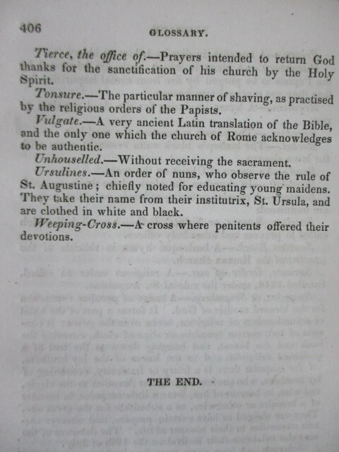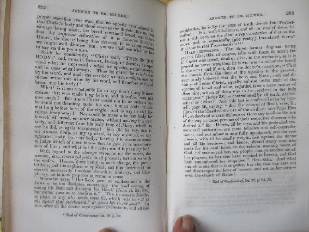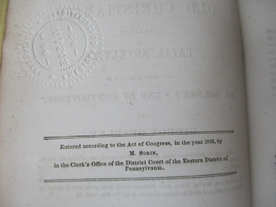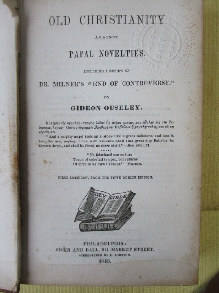 w14. Old Christianity Against Papal Novelties, plus, Review of Dr. Milner's "End of Controversy", by Gideon Ouseley. Pub. Sorin & Ball, Philadelphia, 1843. 12mo, 406 pages, glossary. Full calf covers.........covers loose, but text is tight and clean. X-Church Library with few marks. Acceptable condition. Do not hesitate to e-mail with any questions. As Always, Satisfaction Guaranteed! I expect to receive payment within 10 days, unless we have made other arrangements. Shipping will be USPS Media or First Class, depending on weight. If you prefer Priority mail, I will be glad to make the adjustment. I'm glad to combine multiple purchases in order to minimize shipping costs. I WILL SHIP INTERNATIONALLY, and I try to be as economical as possible with the shipping costs. RETURN POLICY: Satisfaction Guaranteed! Track Page Views With Auctiva's FREE Counter