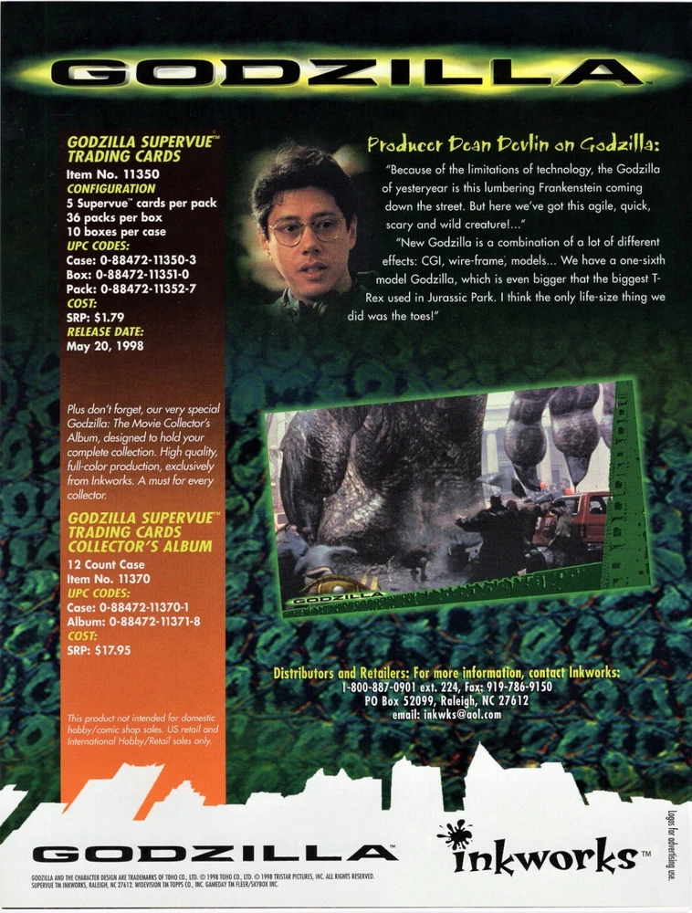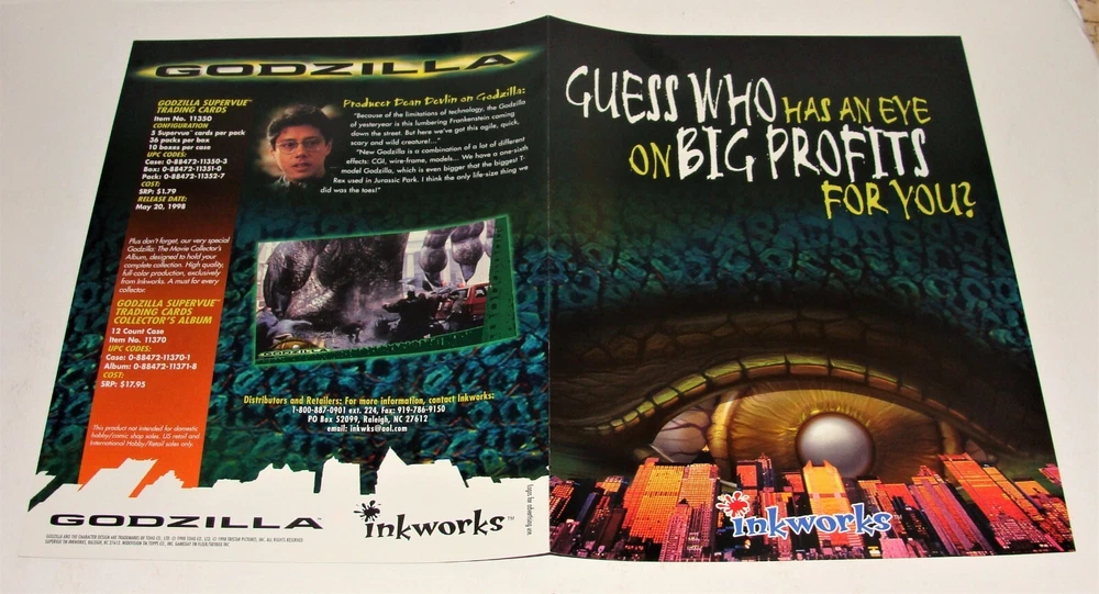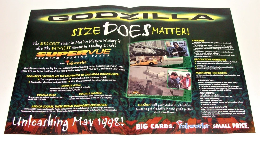 BE SURE TO VIEW ALL IMAGES AND READ FULL DESCRIPTION ON CONDITION OF ITEM. Lot Consists of an Original, 1998 Inkworks, Dealer Promotion Sheet. Sheet Features Then New - Godzilla - Supervue - Premium Trading Cards. Sheet Was Sent Out To Dealers, To Promote Upcoming Card Sets. See Pics For More Details. The 4 page, gloss paper stock, color promo sheet is approx. 11" high x 8-1/2" wide folded and opens to 17" high x 8-1/2" wide. Promo comes as pictured with only light signs of handling on edges and corners. It came folded in half horizontally and was stored away flat and away from light since 1998. Rear of sheet has dealer ordering information. We did not attempt to clean or adjust the piece, left up to new owner to decide to do.... or.....not. Be sure to view all pics for more details. We have other promo sheets and non-sport cards sets / wrappers coming up. Note: No Returns Are Accepted If Item is Altered in Any Way From Pics. Note: Any Bright Spots in Images are Reflections from Flash. Also, We Do Not Use Stock Images, What You See In Our Pics Is What You Will Get. No "Bait and Switch" Here. Check our other auctions for more World's Fair, NYCTA, MTA, Port Authority Material, Fanzines, Magazines, Posters, Books and other collectibles. Note: Item will be shipped flat to US Addresses. We combine shipping on these figures and all paper items. After adding to cart, request total before paying. Thank You. Shipping Cost Above is Based on Continental U.S. Addresses. International Orders Will Be Fulfilled Thru eBay International Shipping and Governed By Their Rules. Kindly Ask Any Questions Before Bidding. Buyer Must Complete and Pay For Purchase Within 5 days of Auction Close. Non-Paying Bidder Alerts Will Be Issued. I will combine shipping whenever possible to save on shipping cost. Some items cannot be combined due to size or fragility. Contact me before paying for items for a combined shipping invoice. This applies to both domestic and international shipping. We Do Not Claim to be Experts or Authorities on Any of The Items Offered By Us at Auction. By Bidding, You, The Buyer, Acknowledge That You Are Bidding on an Item That You Are Knowledgeable and Confident About. If You Are Unsure About An Item, Kindly Inquire Before Bidding. Thanks For Looking.