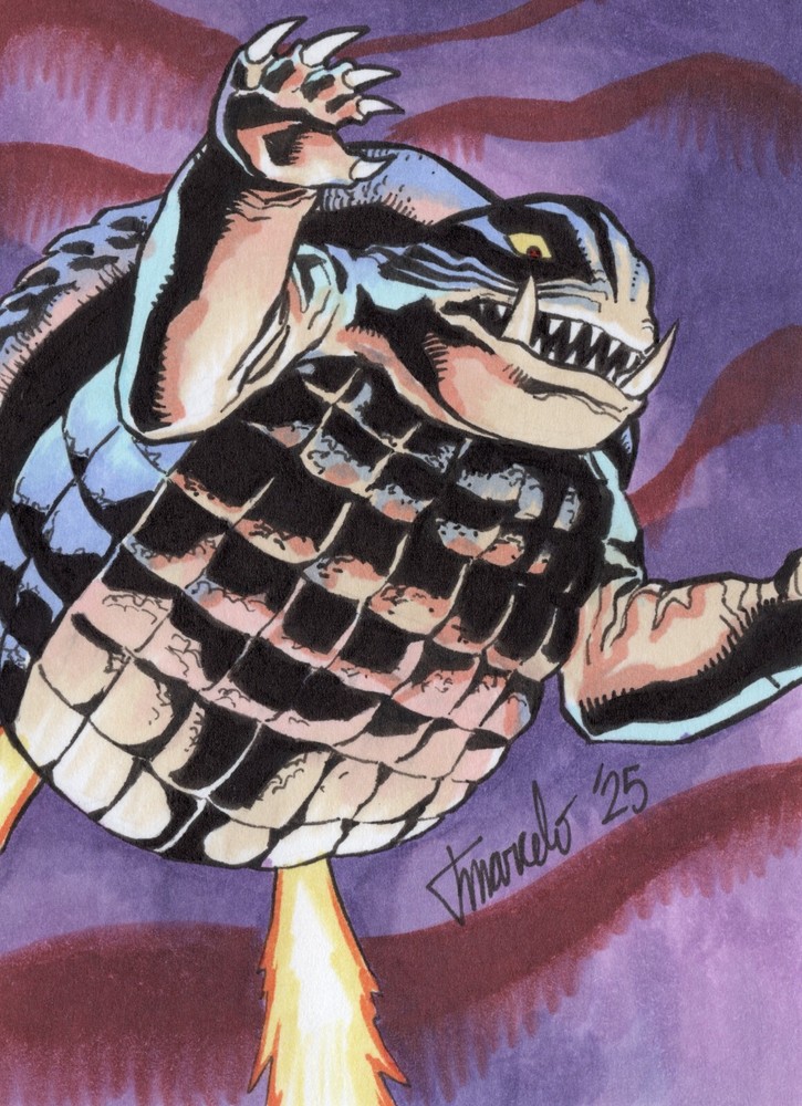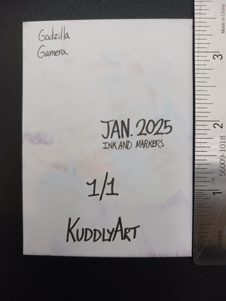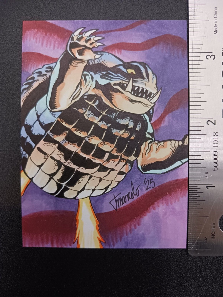 Gamera ORIGINAL This is a unique card you are buying directly from the artist. I work primarily in art markers but also use acrylics. I am a professional artist who has worked for Upper Deck on Marvel sketch cards as a freelance artist. I do commissions for cards and paintings. Feel free to message me if you are interested. Made with alcohol markers and ink on a bristol sketch card. The card is 2.5" x 3.5". Artwork was made and signed by the artist (me). Made in 2025 Will be shipped via envelope with a plastic sleeve and toploader to protect the artwork.