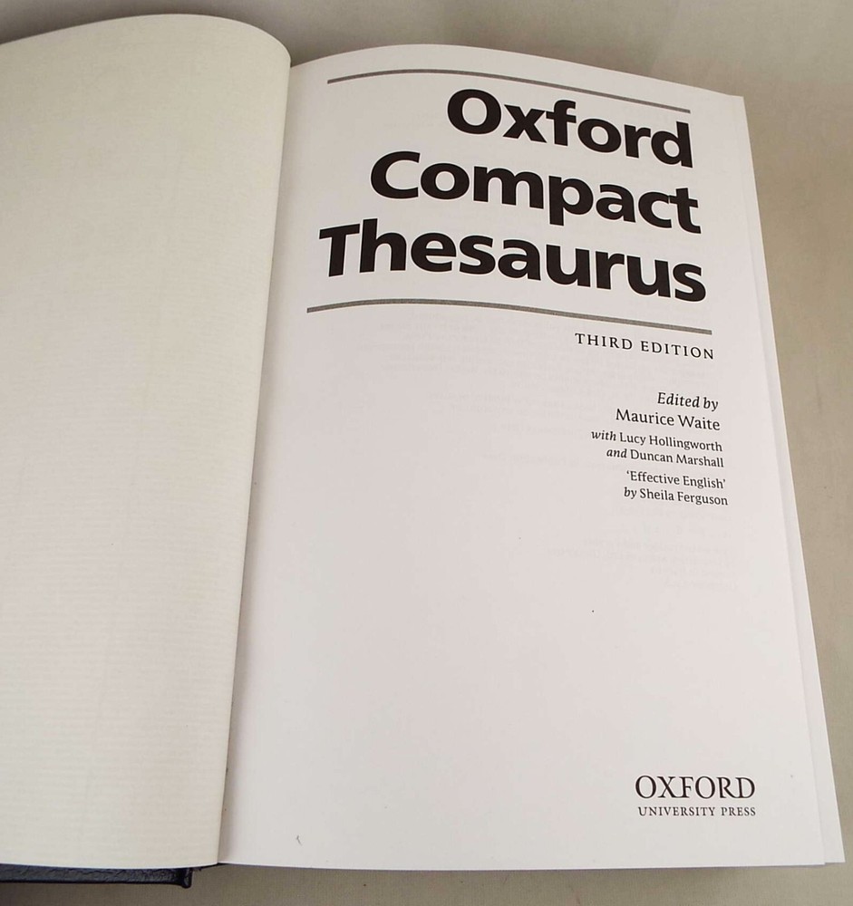 OXFORD COMPACT THESAURUS Third Edition (2005) Published By The Oxford University Press The Oxford Compact Thesaurus is an invaluable tool for anyone who writes, whether memos and reports at work, essays and dissertations at school and college, letters to business contacts, friends, or potential employers, or creative writing for a living or for pleasure. A thesaurus can provide the answer when a word is on the tip of your tongue, or it can expand your vocabulary. It can also help in solving crossword puzzles and with many other word games (perfect defining source for Scrabble fans). ~Preface _________ ________________________ Condition: excellent shape with a tight cloth-sewn binding, nice corners and edges of leather-bound hardcover, bright and clean interior pages , and almost no signs of handling or shelf wear (see photos). Photo graphs shown are of the book currently offered for auction. Leather-bound hard cover , 961 pages, copyright 2001/2005 by Oxford University Press , ISBN 0 198614306 __________ Seller Comment: I am relocating to Central Europe in the coming year, and selling everything to help fund the move. New auction items are posted daily so please check my other auctions regularly for many amazing deals! SHIPPING POLICY Method: USPS Media Mail delivery USPS Priority Mail shipping is also available Books are individually wrapped, well-packed and securely boxed. Orders ship within two business days after payment has cleared. (holidays & weekends excepted) THANKS FOR VISITING OUR AUCTIONS AND PLEASE COME AGAIN!