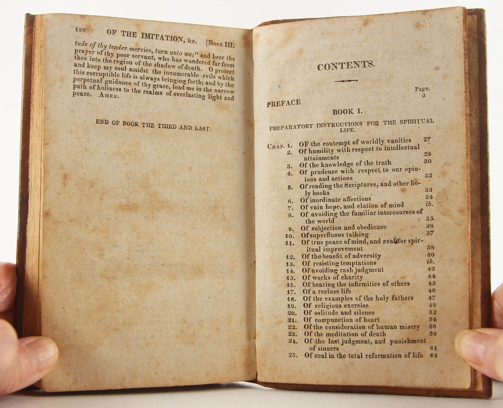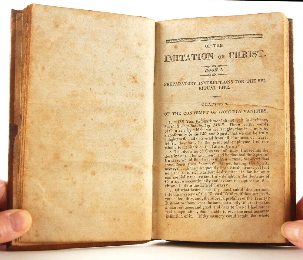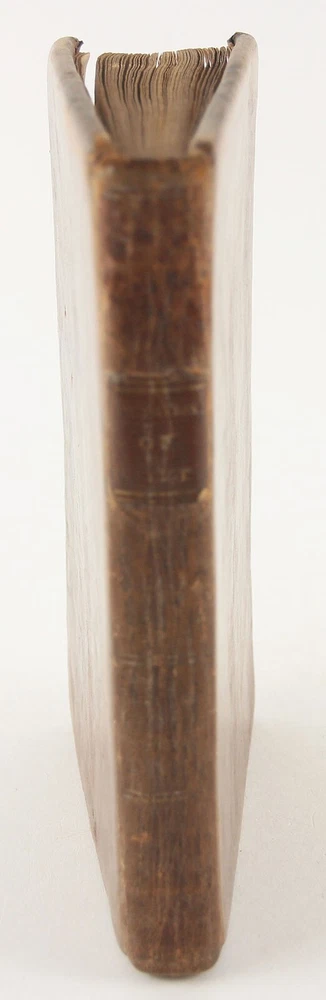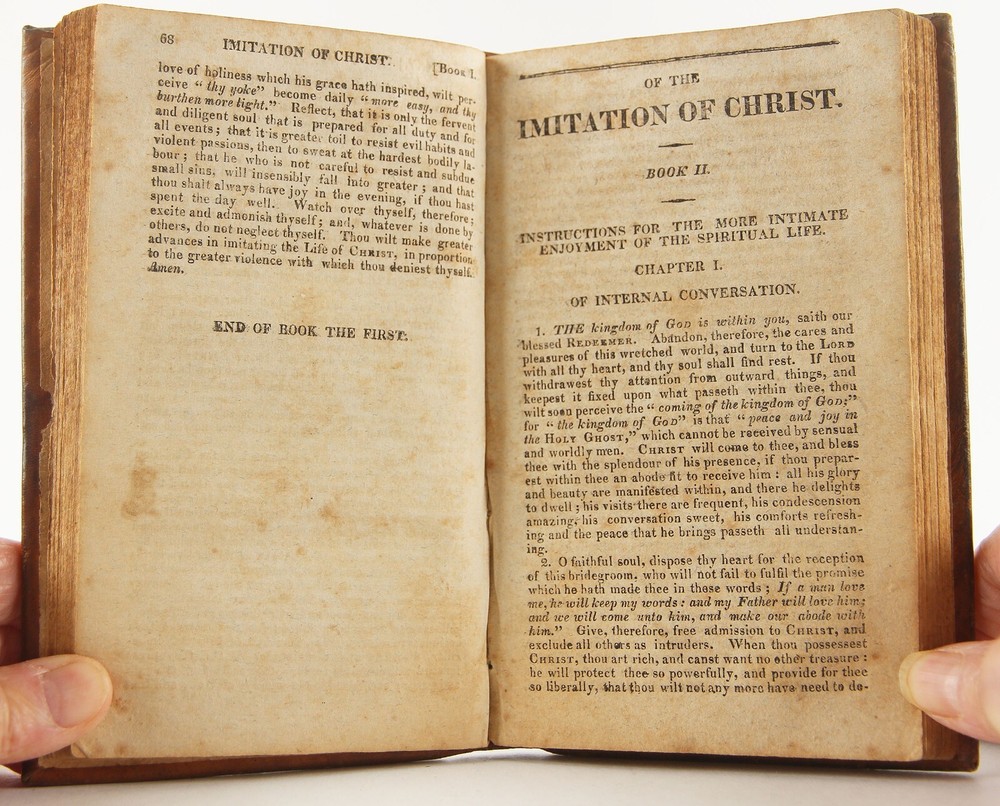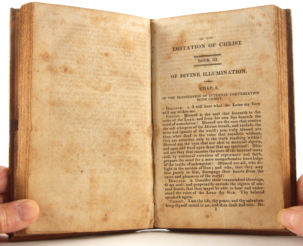 Of The Imitation of Christ, In Three Books, Translated from the Latin of Thomas à Kempis by John Payne by Thomas a Kempis, John Payne 1815 first edition thus, 'Printed by Gaddis and Abrams' (Wilmington, Ohio), 4 3/8 x 6 7/8 inches tall full leather bound, gilt-lettered leather label to spine, 195 pp. Error in printer's pagination, with page numbers for pp. 143-144 inverted, but the text is correct. Slight soiling, rubbing and edgewear to leather covers, with a bit of bumping to the tips. One-inch stain to the fore margin of the blank front free-endpaper, title page and first page of preface. Chipping to fore edge of front free-endpaper and bottom edge of title page. Light to moderate foxing throughout, typical for early nineteenth century imprints. Otherwise, apart from creasing to a handful of pages, a very good copy - clean and unmarked - in a solid period binding. Altogether a handsome example of an uncommon early American printing of this beloved devotional classic, intended for sale to a burgeoning Protestant and Quaker audience in Ohio and Pennsylvania. An early and important work of Catholic Americana, and one of the earliest Ohio printings of this beloved Christian devotional. OCLC (No. 1013235100) locates only one copy at institutions worldwide, and COPAC has no listing. Shaw & Shoemaker locates seven copies. References: Shaw-Shoemaker, Early Am. imprints, 2nd series, No. 34992; Ohio Imprints 258; Parsons, Early Catholic Americana 515. An early American edition - the first book printed by this Wilmington, Ohio publisher - of the popular 1785 John Payne (d. 1787) translation of the Imitation of Christ (Copinger, On the English Translations of the Imitatio Christi (1900), pp. 84-87). In the first paragraph of his lengthy preface, Payne explains that he hoped in this translation to do 'some justice to the sense of the Original; which is almost lost in the loose paraphrase of Dean Stanhope,' referring to Anglican George Stanhope's often reprinted 1698 English translation. However, Payne's translation uses the King James Version wording for scriptural quotations within the work, rather than the Vulgate edition of the Bible available to a Kempis in the fifteenth century. And Payne has edited out much from the original which he found overly 'monkish' or 'popish,' including all of Book 4, dealing with the (Roman Catholic) Mass. The Imitation was written in Latin by Catholic monk Thomas Kempis (circa 1380-1471), as four separate books completed between 1420 and 1427, at Mount Saint Agnes monastery, in the town of Windesheim, located in what is now the Netherlands. About this printing: Rice Gaddis (1789-1853), a son of Thomas Gaddis, is said to have arrived in Wilmington in September 1814, the family having come down the Ohio river in boats, bringing a printing press and types with them. These were left at Manchester, and the family came to Wilmington and located in a house belonging to Henry Babb. The paper was probably only published a few years, and after its discontinuance Mr. Gaddis removed his press to his home on Todd Fork, where he did job work and published a few original essays.