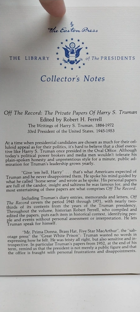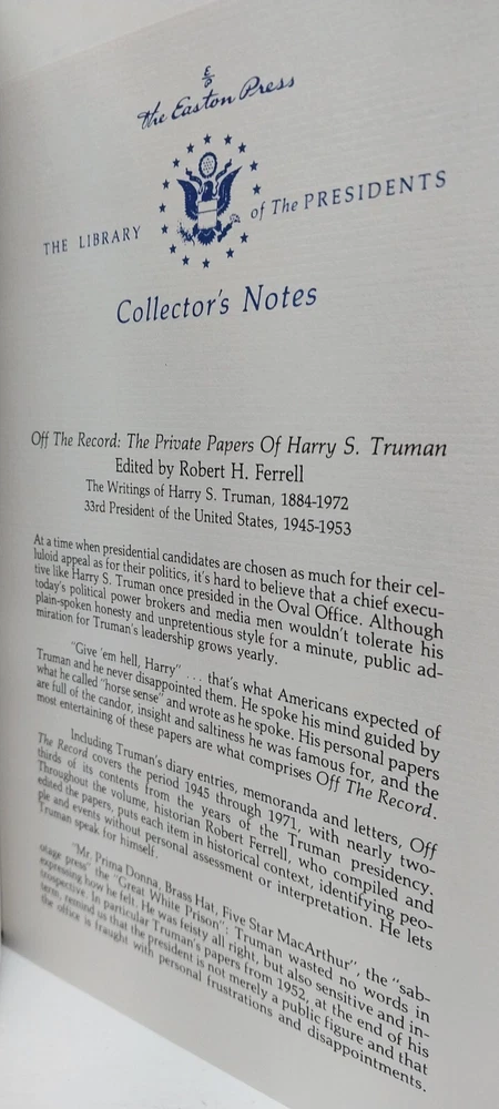 This is a rare and valuable book titled "Off the Record: The Private Papers of Harry S. Truman-EASTON PRESS LEATHERBOUND". The book is a first edition collector's item that was published in 1989 by Easton Press. It contains the private papers of the former US President, Harry S. Truman, and is written in English. The binding of the book is made of high-quality leather, and it was published in Norwalk, Connecticut, in the United States. The book is a great addition to any collector's library, especially for those interested in politics and biography. It is a valuable and original item that is in excellent condition. Item is in great preowned condition. Please see photos! Shopping with us helps us to continue the work that we do with victims of domestic violence and their families. Our goal is to change live. Forever. The mission of the Women's Center is to empower women and their families by providing support, education, counseling, information and services.