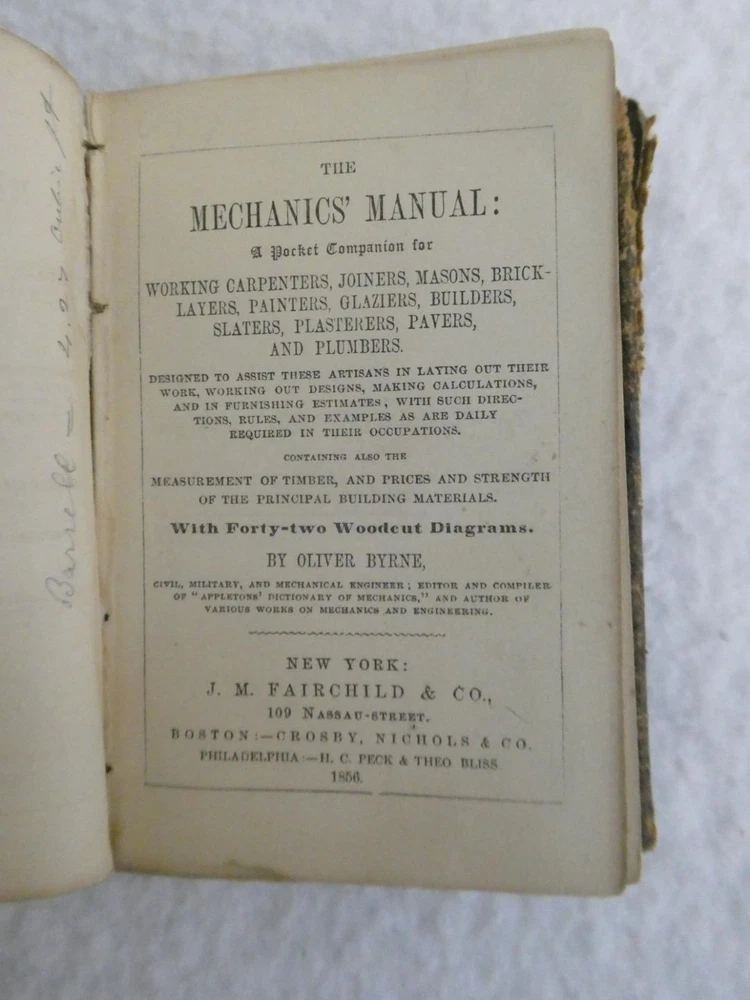 Oliver Byrne THE MECHANICS' MANUAL 1856 J. M. Fairchild & Co., NY Leather In good condition. Please examine photos for details. Condition: We strive to describe and photograph the condition of every item as accurately as possible. Photos are of the actual item that is being sold. Please examine the photos carefully for any condition details and possible flaws. Best Offers: Items are available for offers only after being listed for 30 days. We consider all offers in relation to current market values. We try to respond almost immediately to most offers. Most of our counteroffers are firm but we are open to bargaining. Shipping for US Customers: We combine shipping. When ordering multiple items from us please request a total before paying. We charge postage based on weight plus $1 for each eBay listing. All of our orders are packed carefully to prevent damage during shipment. We ship most of our items within 24 hours. Shipping for International Customers: All international orders are shipped via Ebay's Global Shipping Program. IF AN INTERNATIONAL CUSTOMER IS INTERESTED IN ORDERING MORE THAN ONE ITEM please do not Buy It Now or use the Make An Offer option on the listing. Rather message us first with a list of the items desired along with any offers. After we agree on prices we will combine all the orders into a single listing at the agreed upon total price. This will save you significantly on the cost of shipping. Contact Us: We are available 7 days a week and are happy to answer any questions you may have. Attention Sellers - Get Templates Image Hosting, Scheduling at Auctiva.com.
