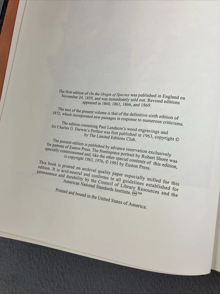 On the Origin of Species by Charles Darwin - 1976 Easton Press Leather VERY GOOD CONDITION -- CLEAN COPY/NO MARKINGS ON THE INSIDE (see pics) *Item will be protected well for shipping and comes with a tracking number for confirmation.* I ship out items every day so expect a quick delivery!