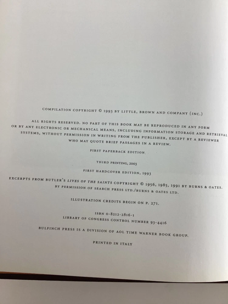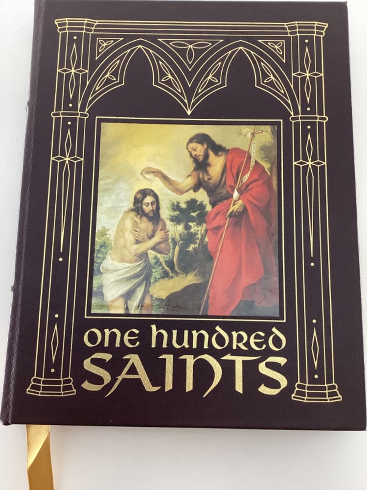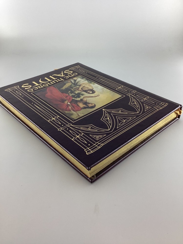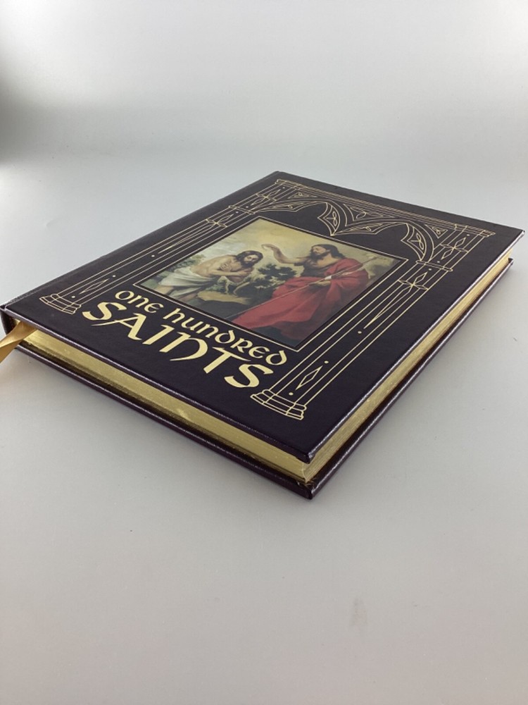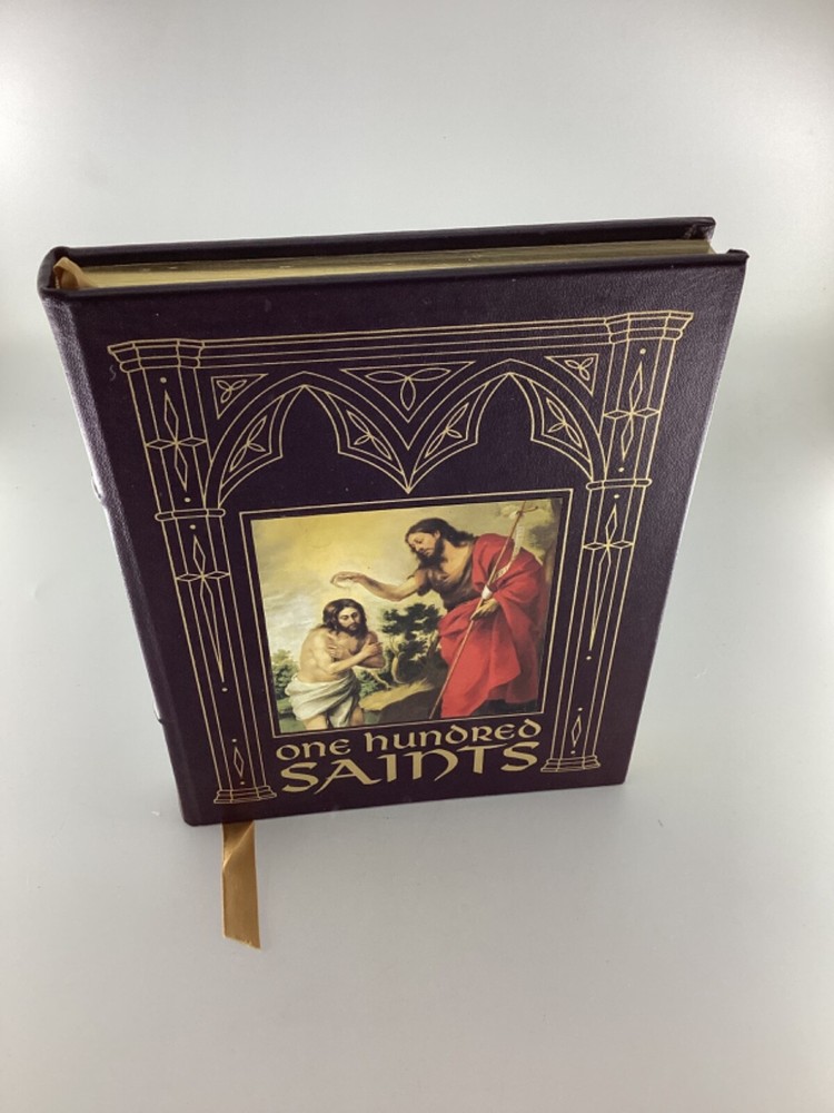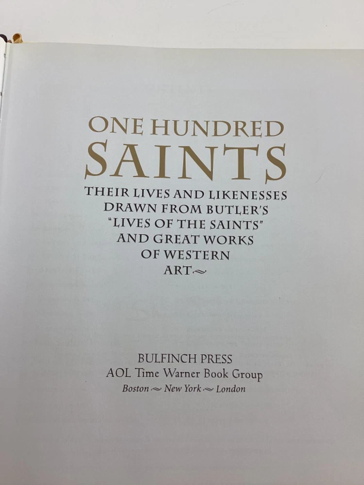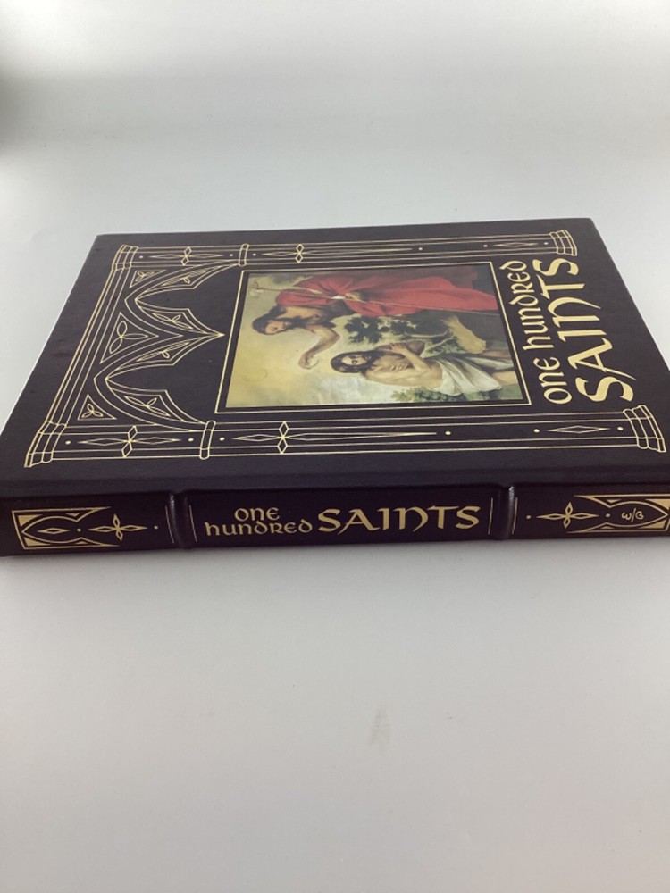 One Hundred Saints: Their Lives and Likenesses Drawn from Butler's "Lives of the Saints" and Great Works of Western Art. ISBN 0-8212-2816-1. Bulfinch Press/AOL Time Warner Book Group. 2003. Brown Leather Bound Hardcover Collector's Edition in Fine Condition. Book boards perfect with immaculate gold printing and decorations, gold/brown moiré endpapers, gold leaf on text block edges. Previous owner's bookplate on inside cover. Attached gold satin bookmark. Details of all the works of art included are in a "List of Works of Art" at the back of the book, along with a list of patron saints. Beautiful and collectible! Images included are of the actual book being offered for sale. Saints have played an important role in the lives of millions of people, providing the basis for some of the Western world's greatest art. Compiled as "a gift to the Christian faithful," intended for anyone wanting to know more about the lives of saints and their depictions in Western art. A wonderful book for comprehending the holiness of mere mortals and the good works they performed for the world in honor of God.
