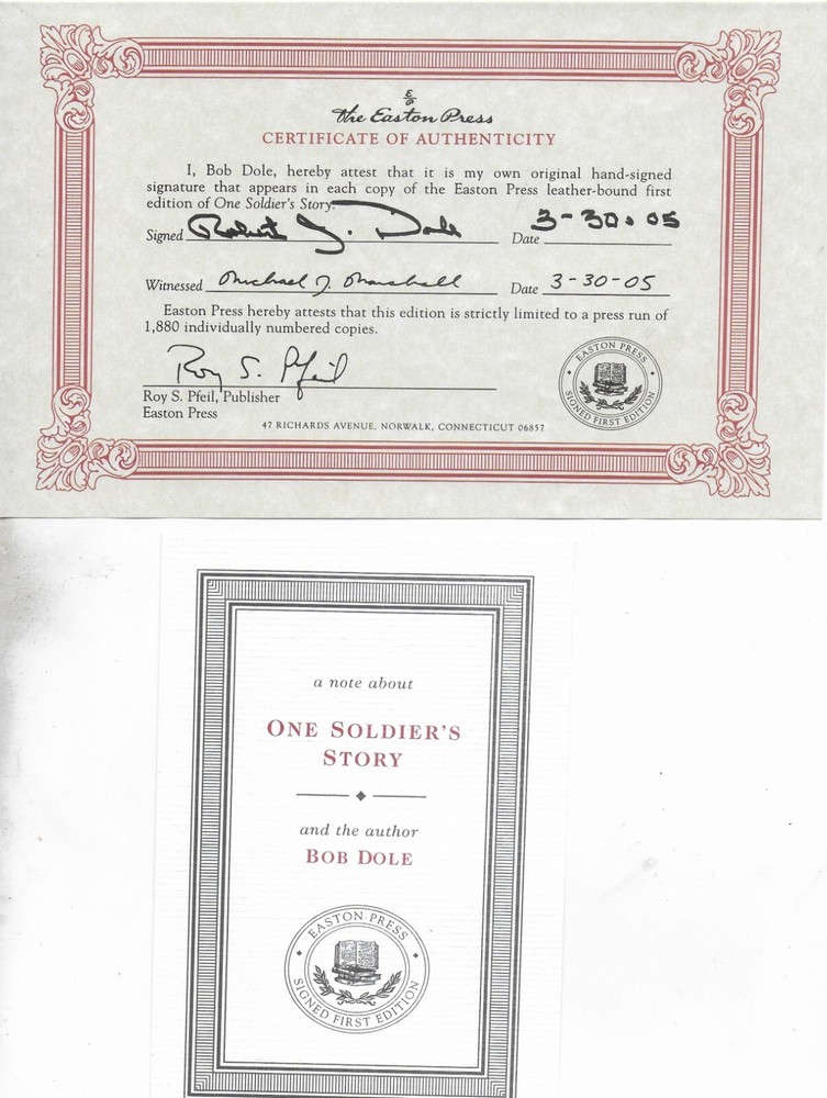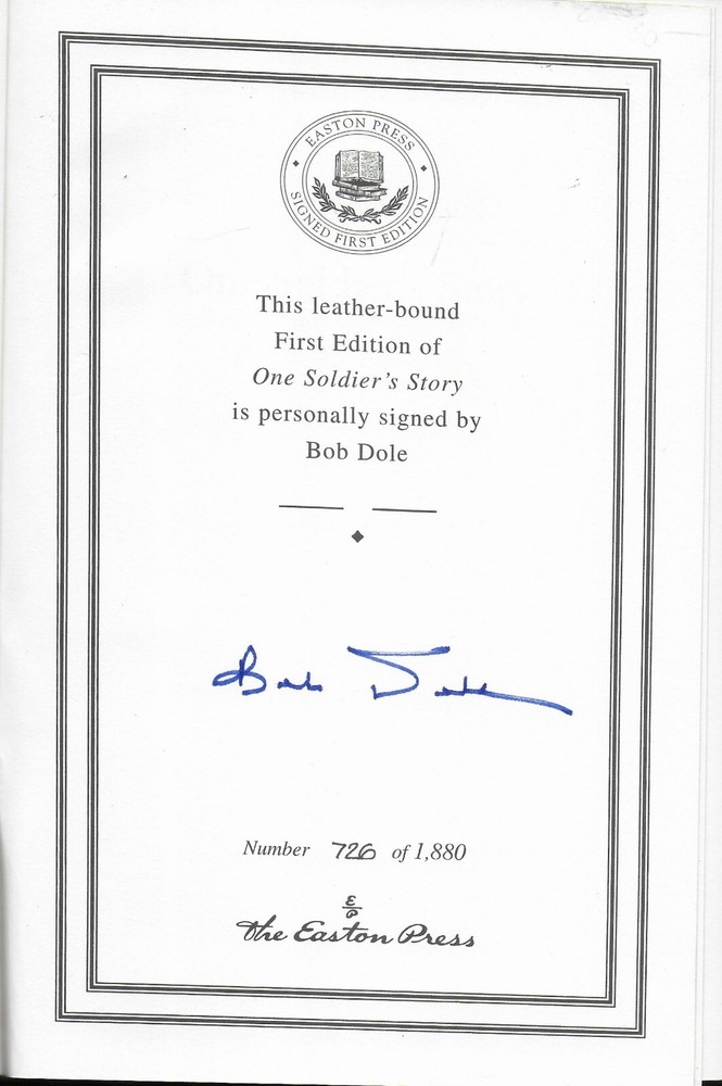 One Soldier’s Story by Bob Dole , Easton Press, Signed, COA & Easton Press Note You are bidding One Soldier’s Story by Bob Dole . The Easton Press, Norwalk, CT published the book special contents copyright 200 5 . The book is a signed limited first edition . It is copy #726 of an edition of 1880 copies. Bob Dole signed the limitation page. The interior is in fine condition. The pages are tight and clean. There are no tears or marks. There are no signs of prior ownership. The page ends are richly gilded to seal out moisture. The edges are in fine condition. No scratches. The beautiful leather cover is in fine condition. The attached silk bookmark is in fine condition. The book is 6 1/4” x 9 1/4 ” tall and 2 8 7 pages. There are 24 b & w photographs and 1 map. Laid in the front is the Easton Press Certificate of Authenticity and The Easton Press Note . Please if you need any additional information and photos, eBay message me immediately. Combine Shipping Discount!!!!! Save money when you buy more than one item (lot) from us! Except in rare cases, s & h to a U. S. address via media mail in the same box is $1.25 for each additional book. eBay may automatically send a combine invoice with the wrong s & h. Please wait to pay until you receive my combine invoice with the correct s & h. PLEASE CHECK OUT MY eBAY STORE AND OTHER AUCTIONS!!! 8 7 2023 8 2023