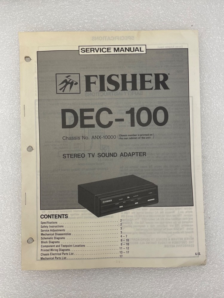 Original OEM service manual, includes, part numbers, schematics, diagrams, charts ect.. . MODEL Original Fisher DEC-100 Stereo TV Adapter Remote Control Service Repair Manual- 1984 Condition :This is an ORIGINAL manual, not a photocopy, reprint or digital version. They may show some wear since most of these are vintage. Some have writing and notes written on the inside and outside of the manuals, mostly useful info. Some manuals have creases and edge wear due to storage. I'm currently in the process of listing an entire electronics repair shops, collection of vintage service manuals. Please click on my eBay store as I will be listing these manuals over the next several months or years!!!!! Thanks for your time and feel free to ask questions if needed. Please see all pictures for detailed description. We use the Ebay Global Shipping program for all International sales, Ebay sets the cost of global shipping, International shipping cannot be combineIf free or flat rate shipping is offered it is to the continental U.S only. All others will be calculated by zip code.We will ship to PO BOXES, APO, FPO, DPO, Puerto Rico, US Virgin Islands but buyer must contact us first as the item will need to go USPS and will more then likely occur an extra charge. Purchase limited to size and weight the USPS allows. Free Pick up is an option but payment must be made in cash upon pick up. Once payment is made we cannot cancel the order . We ship only FED EX, UPS or USPS priority Some Items may require a signature at delivery. All used items are sold AS-IS As described. We do our very best to describe the item listed. Box 3-31