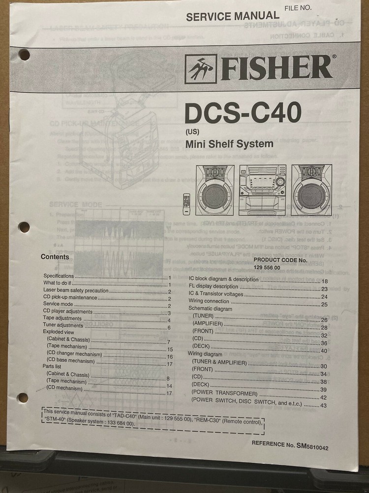 Up for sale is a factory issued Service Manual for the Fisher DCS-C40 Mini Shelf Stereo System . See photos for content . Very good shop used condition. This is an original copyrighted document. Don't settle for hard to read pirated copies or PDF's. I charge a shipping fee so that I can combine shipping for those that want to take advantage of purchasing more than one item. I pack for safe shipment.