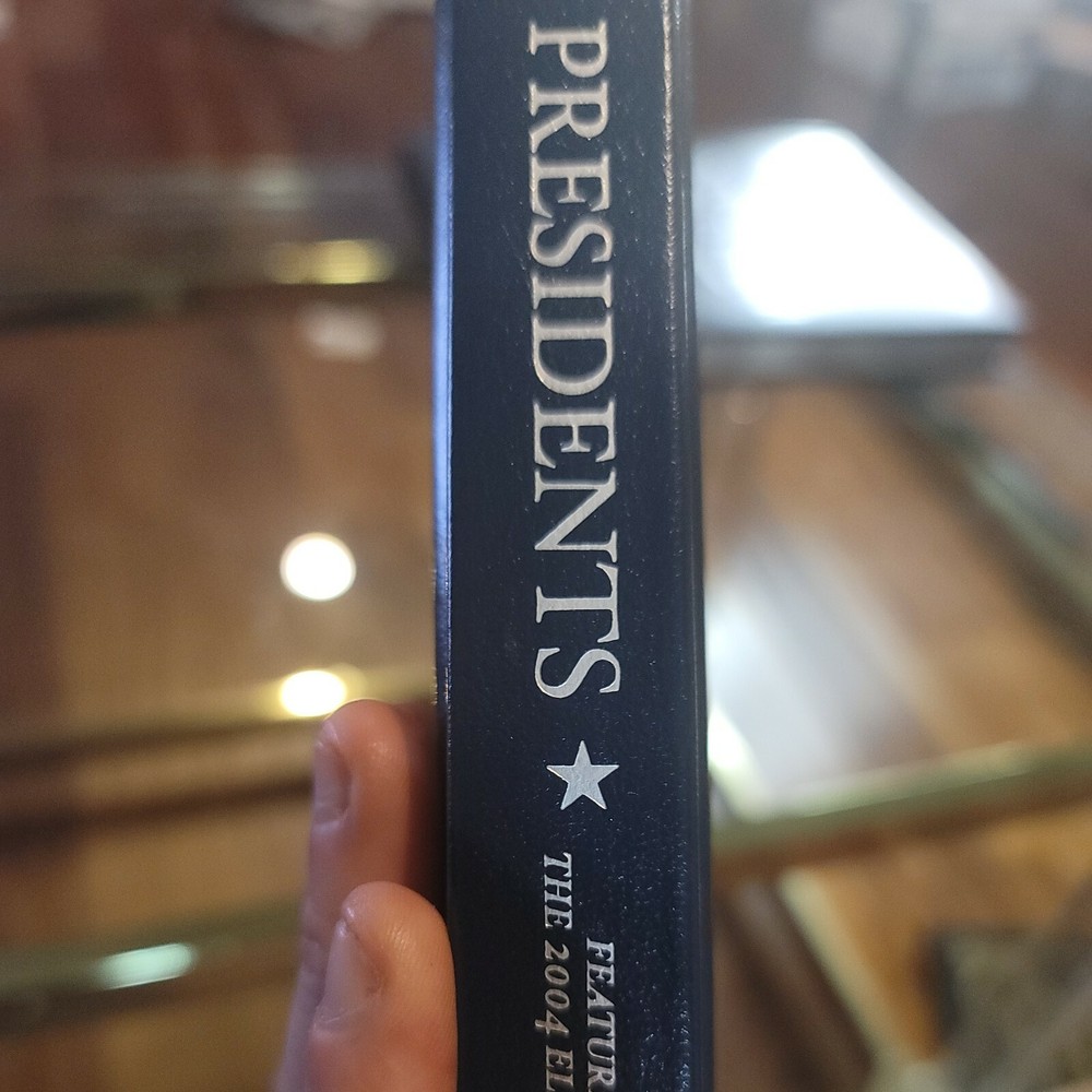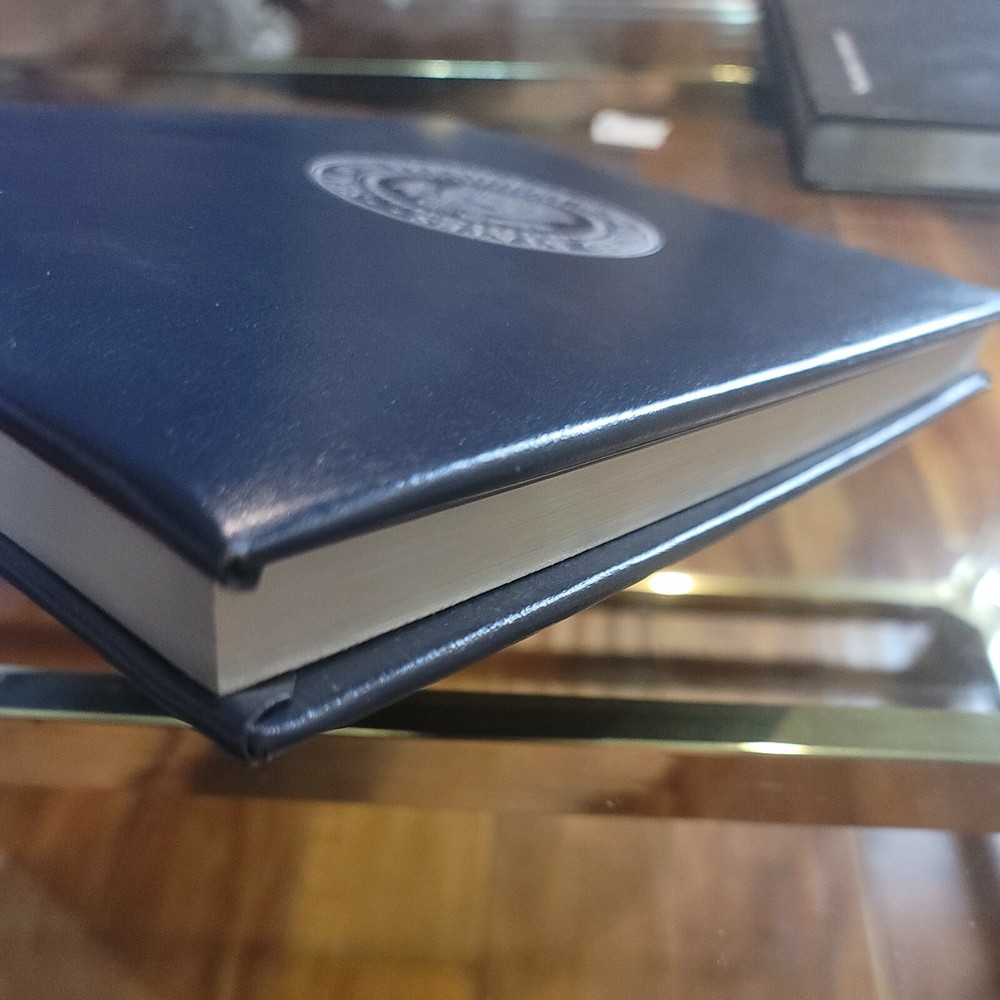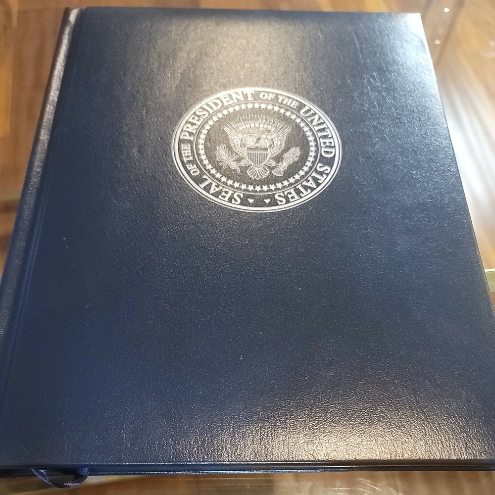 Leather bound with the Seal of the President logo pressed on the front cover, silver gilded pages....
