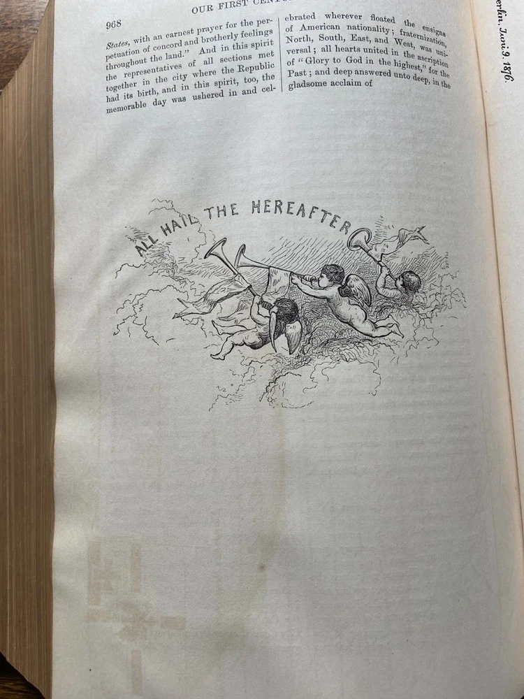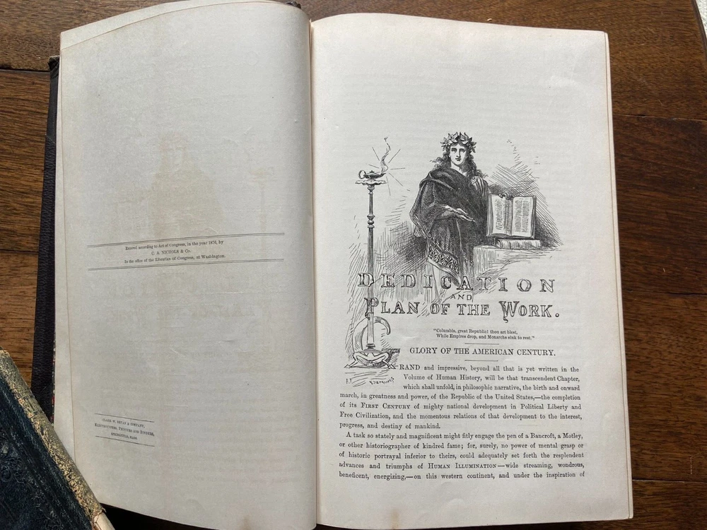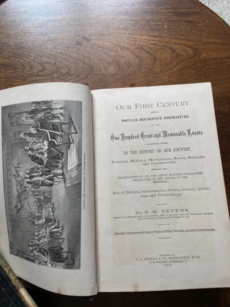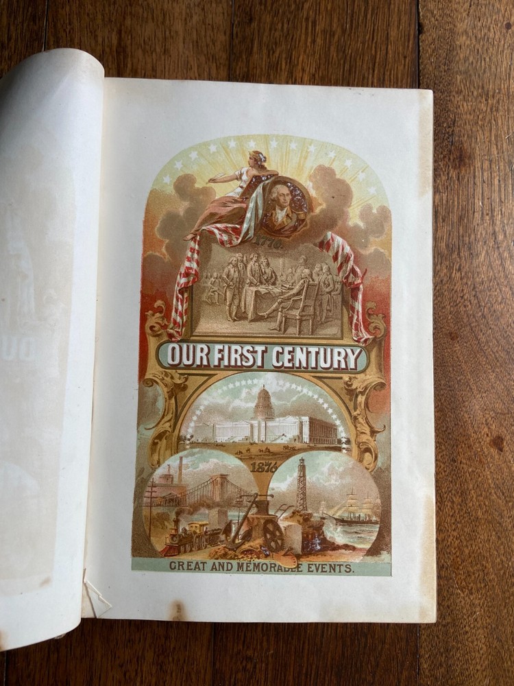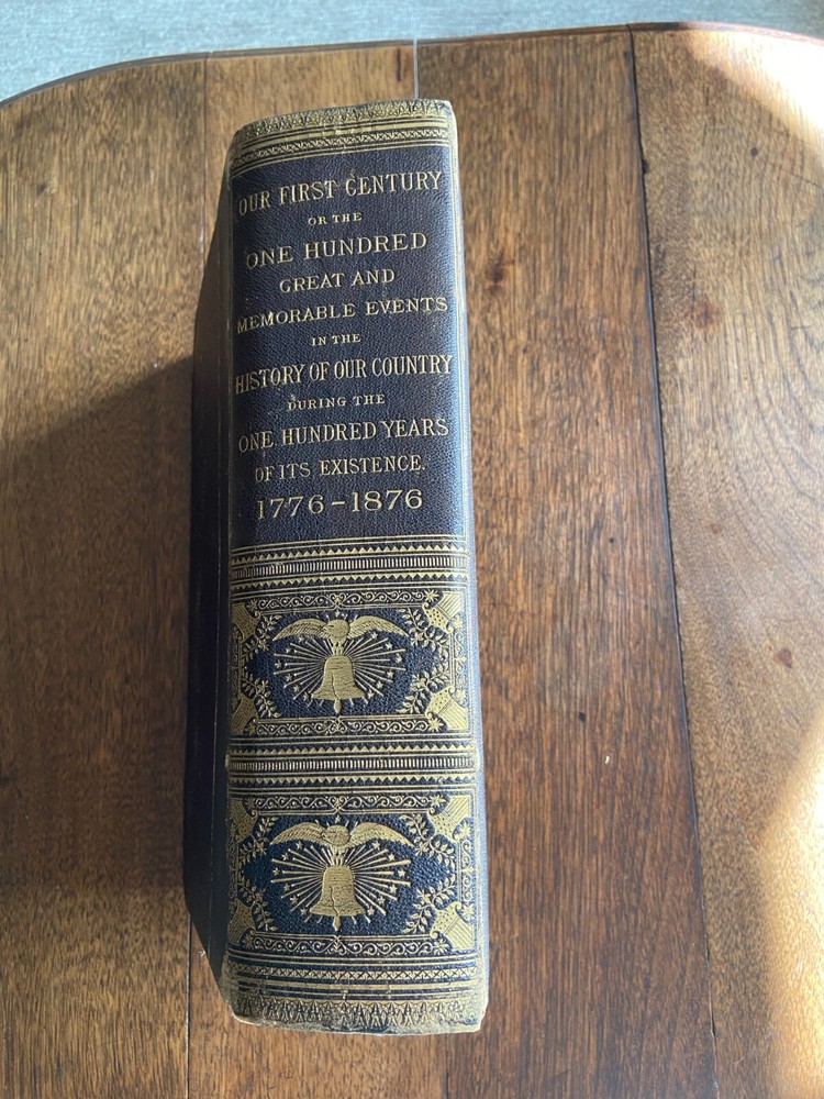 Our First Century Being a Popular Descriptive Portraiture of the One Hundred Great and Memorable Events in Our Century. Published in 1876 by both C.A. Nichols (Massachusetts) and A.H>.Walker(Columbus Ohio)., I believe it to be a first of this edition. Inscribed in inside front..."James Israel 1877." 415 black and white engravings, 1007 pages. Original leather binding with gilt decor on spine and gilt on page edges. Piece of inside paper gone(see photo), otherwise intact. Binding intact and tight, no marks. A beautiful book.