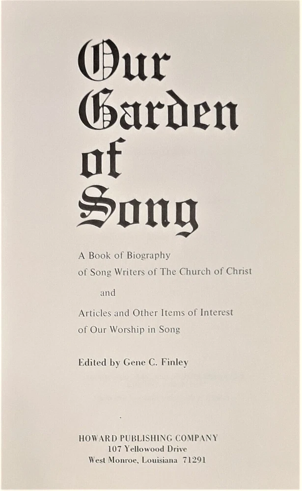 Our Garden of Song Gene C. Finley Hardcover//Faux Leather/Padded Howard Publishing, 1980 Synopsis This is a compilation of Finley's invaluable research on songwriters among the churches of Christ in this country. The book includes music from these song writers, as well as their biographies.
