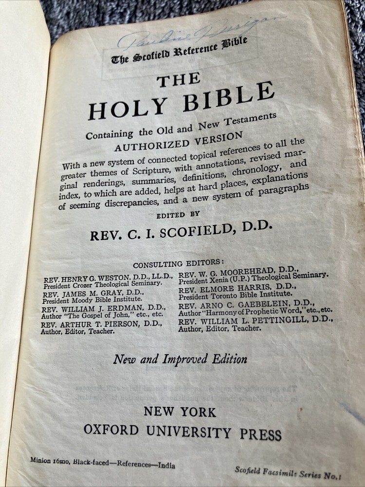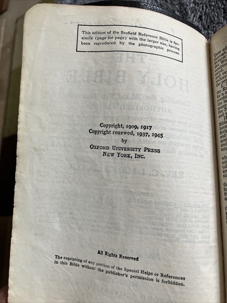Some Markings———This vintage Oxford 1945 KJV Scofield Reference Bible is a beautiful addition to any collection. The Morocco leather bound cover is elegant and durable. The Bible contains 1351 pages including indexes and concordance, making it a valuable resource for anyone interested in the Christian faith. The Bible is written in English and is intended for young adults and adults. The Bible features a bookmark string and is silk sewed, making it easy to mark your place and keep the pages open. The Bible is part of The Holy Bible series and is a nonfiction narrative type. The Bible is perfect for anyone looking for a religious and spiritual guide, and it is a great companion for daily reading and studying. Please see all photos.I Only Ship Overseas Through Ebay Global Shipping, If you are unhappy with item,please contact me to resolve the problem before opening a case,I value your business and work hard to keep a top seller rating, Thank You