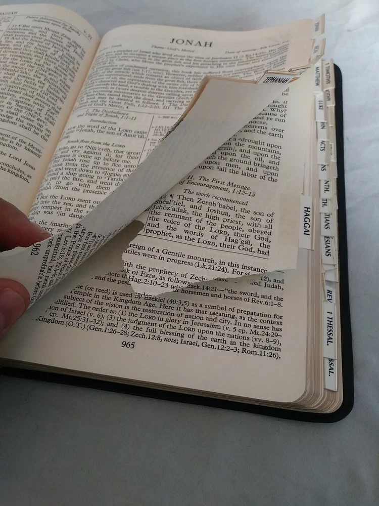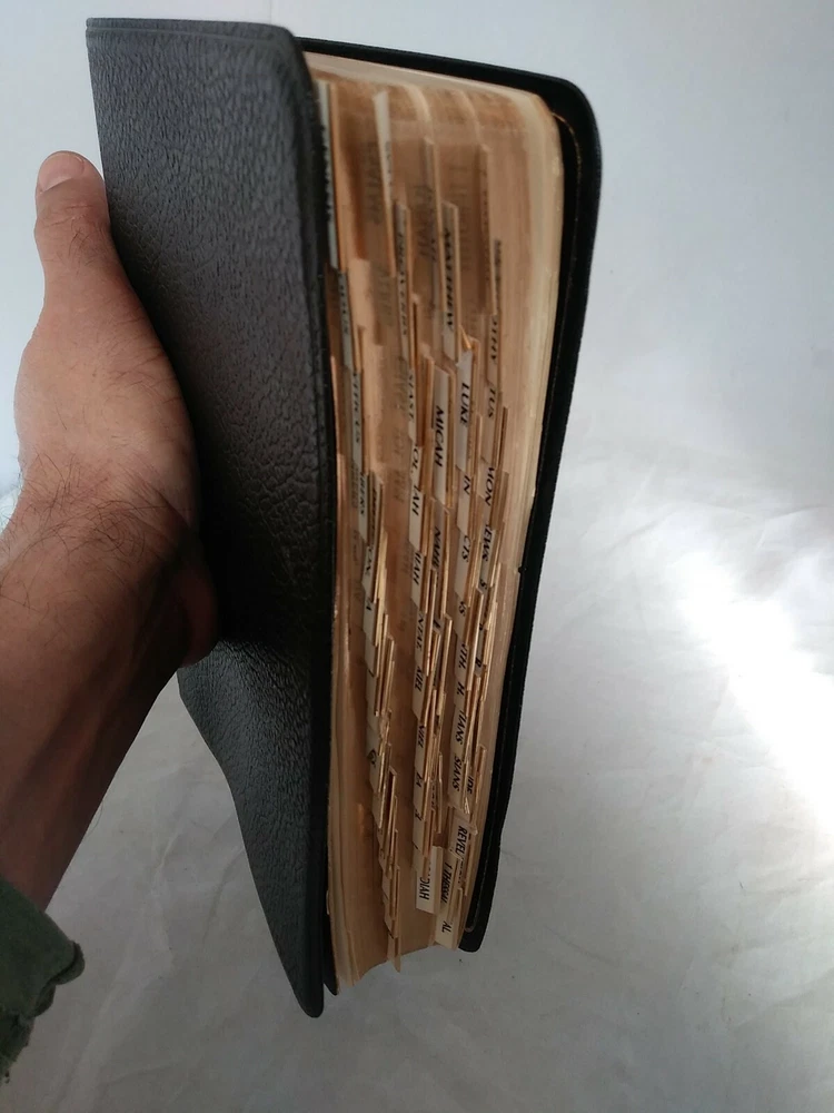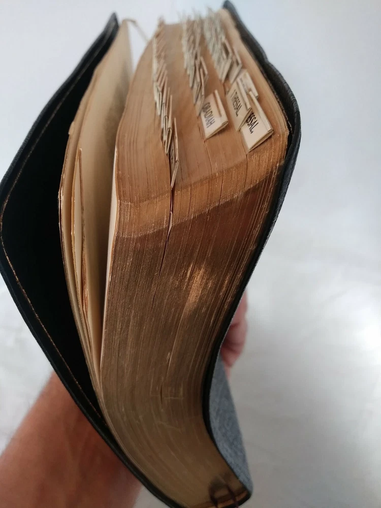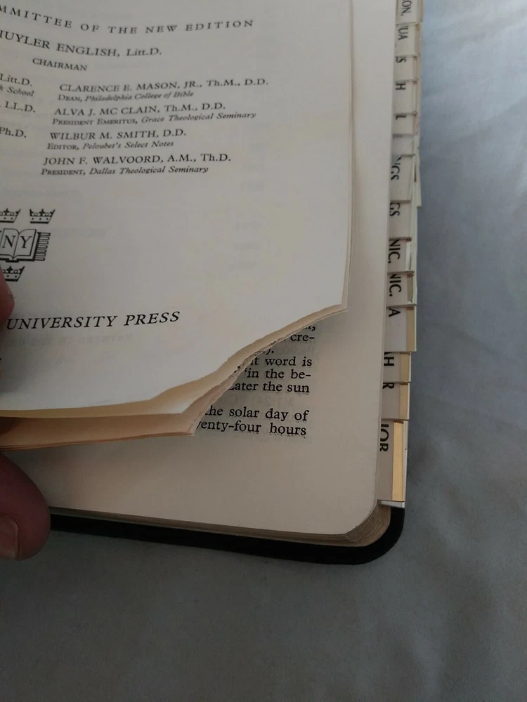 Oxford 1967 KJV New Scofield Reference Bible Genuine Cowhide Leather Lined .Please review photos priced at a deep discount to to the bottom right corners tore out in two sections as shown in photos....
