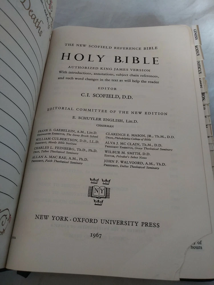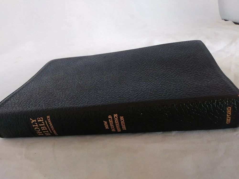 Oxford 1967 KJV New Scofield Reference Bible Genuine Cowhide Leather Lined .Please review photos priced at a deep discount to to the bottom right corners tore out in two sections as shown in photos.
