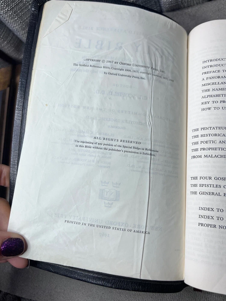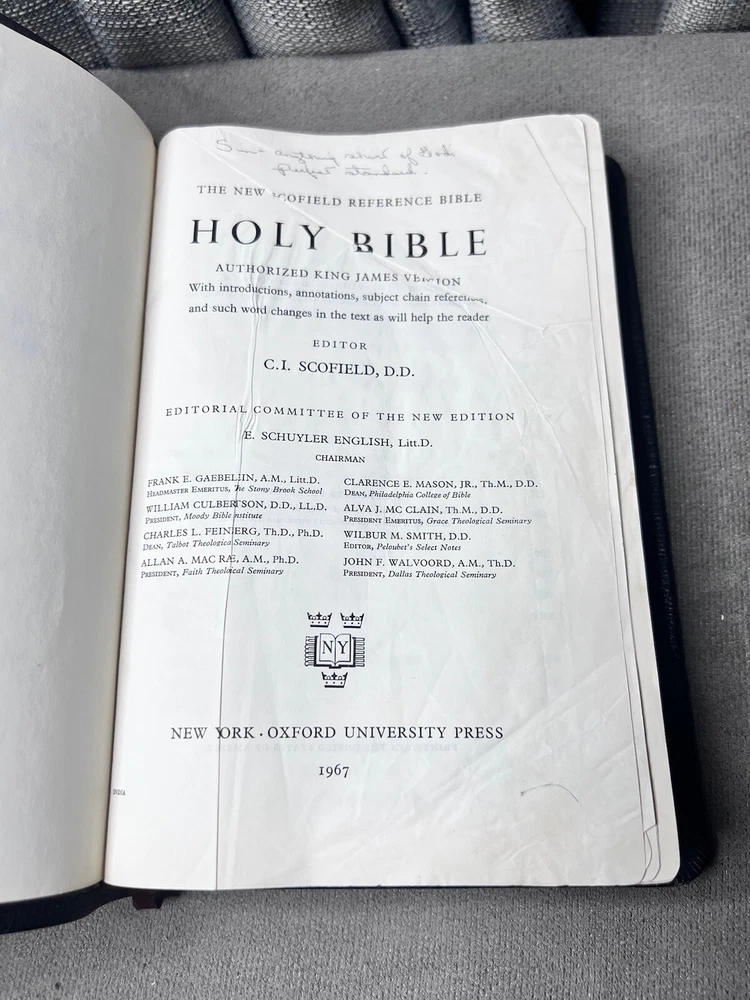 Oxford 1967 Scofield Bible KJV Natural Morocco Leather Lined Concordance READ Well loved bible, has writing on the first several pages with some crossed out areas with marker, edges have wear and tear, a few coffee spots, some corner folds/creases, and torn corners throughout, writing in the back note section, binding is good no returns