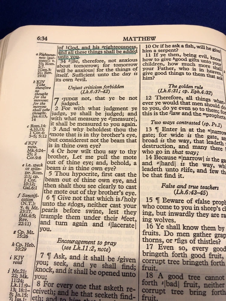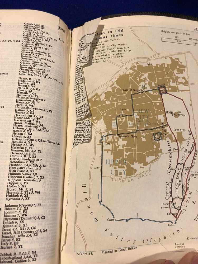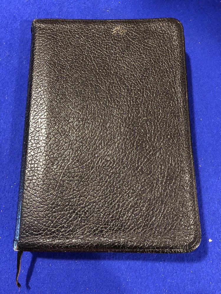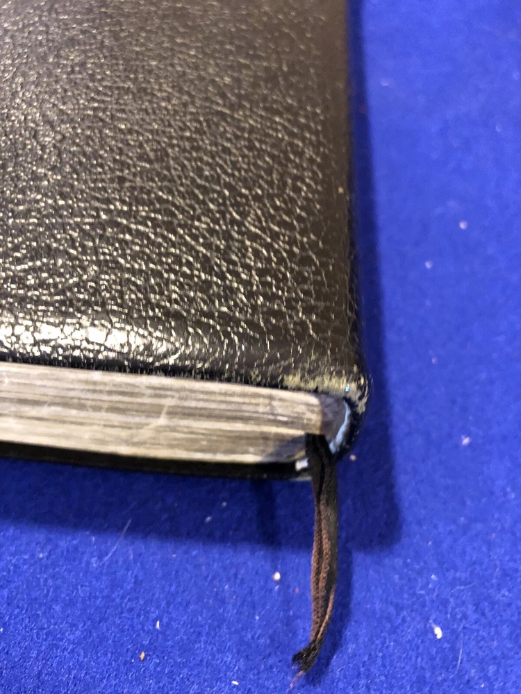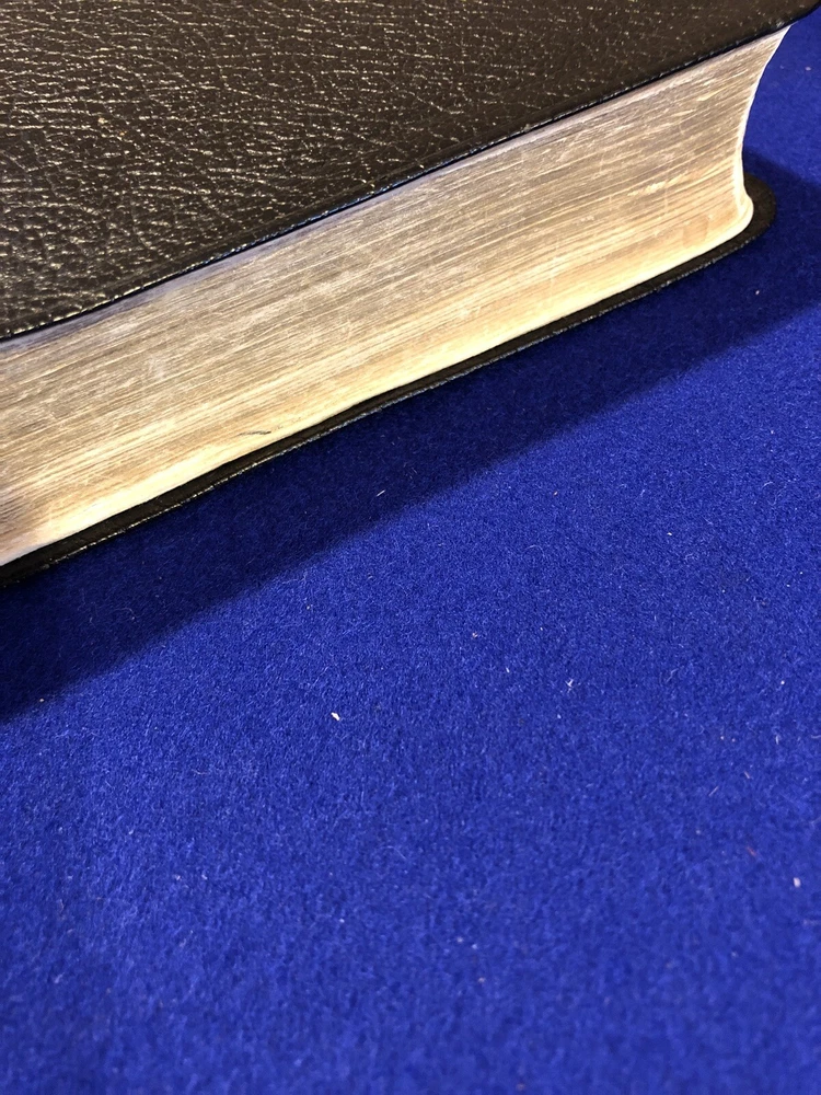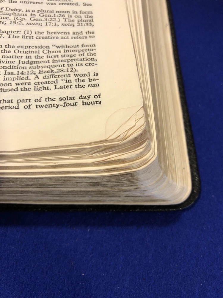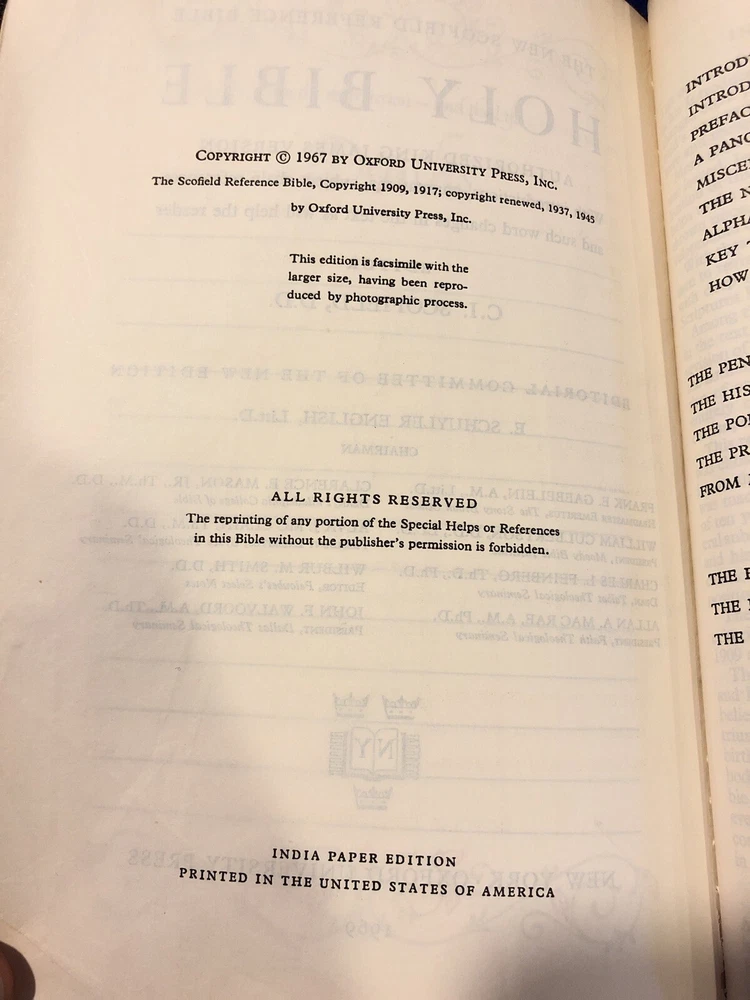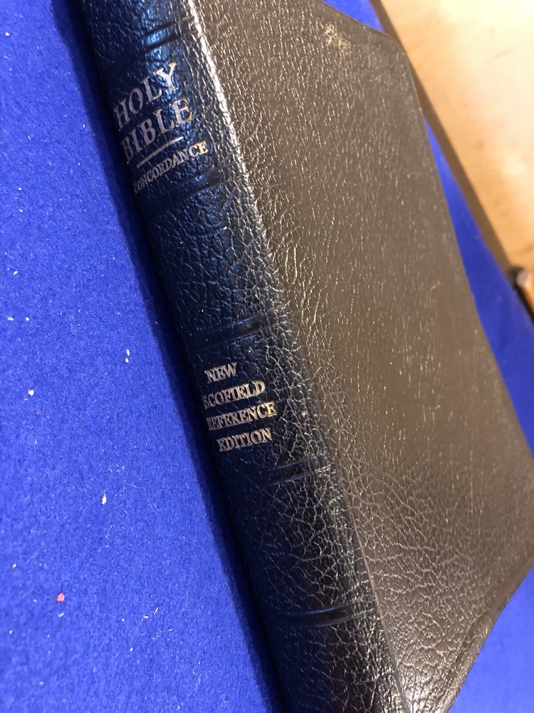 This item is a New Scofield Reference Edition of the Holy Bible. It is bound in Genuine Cowhide, Leather lined. The binding is still strong and leather is supple. The pages are edged in gold and have seen some use. The previous owner was a student of the Word and used this Bible. There are a few highlights and some writing found. (See photos). There is a black ribbon marker, maps, an index to the maps, and a concordance. There is a page or so missing from the index to maps (see photos). The exterior measures approx. 8"x5 1/4" x 1 1/2". The pages are "India paper". Overall, this Bible has a few issues, but is still in good condition and will be useful to you for many years to come.