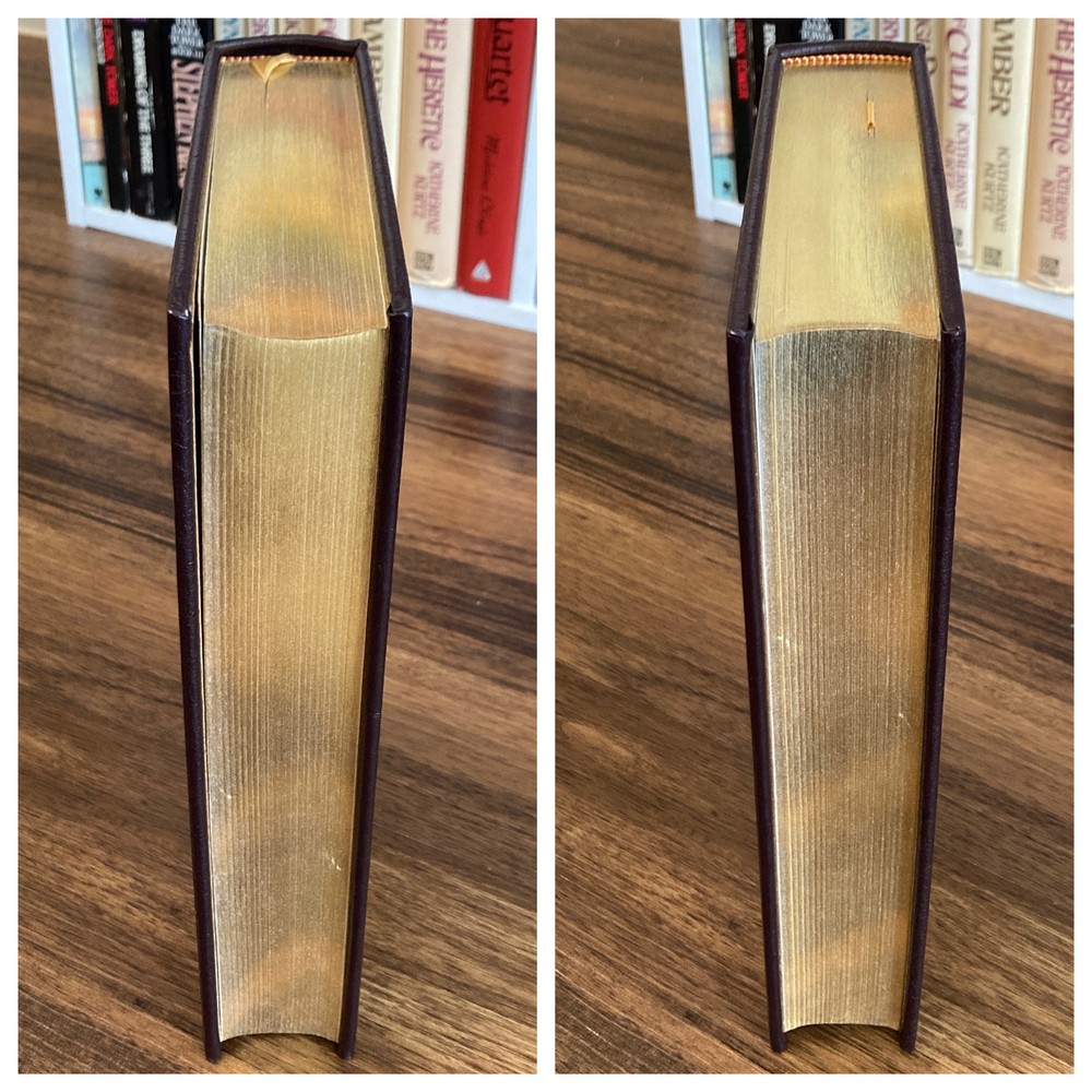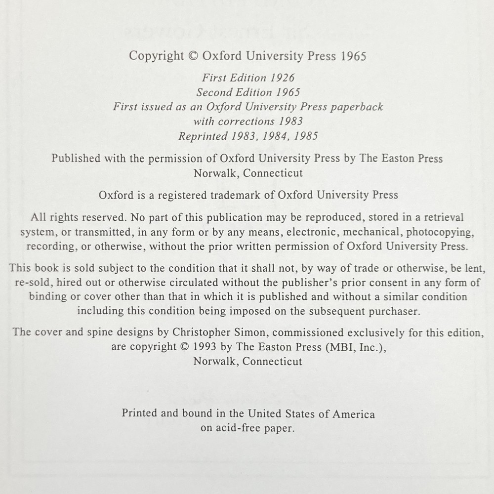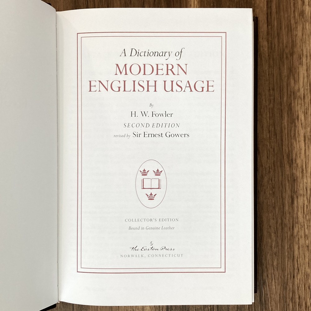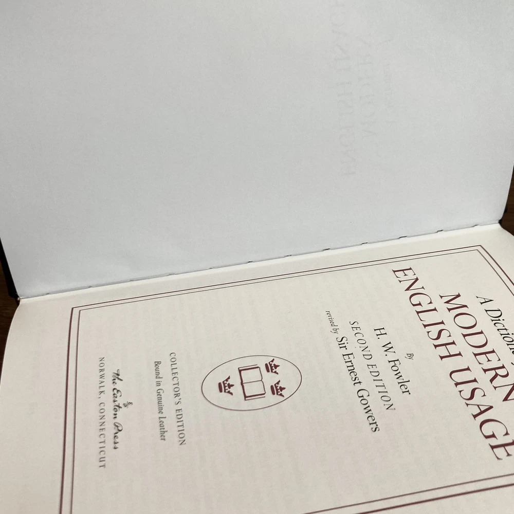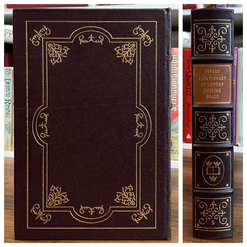 Collector’s edition leatherbound hardcover copy of Oxford Dictionary of Modern English Usage by H. W. Fowler (The Easton Press, 1993). Beautiful special edition with leather wrapped board, gilt lettering and design, gilded page edges, decorative endpapers and attached tassel ribbon bookmark. Very mild shelf wear to covers and faint scuffing to outer edges of text block. A few instances of mildly split binding though spine is straight and binding remains quite firm on the whole. All pages clean and unmarked. See photos for condition. Packaged with care and shipped via USPS Media Mail