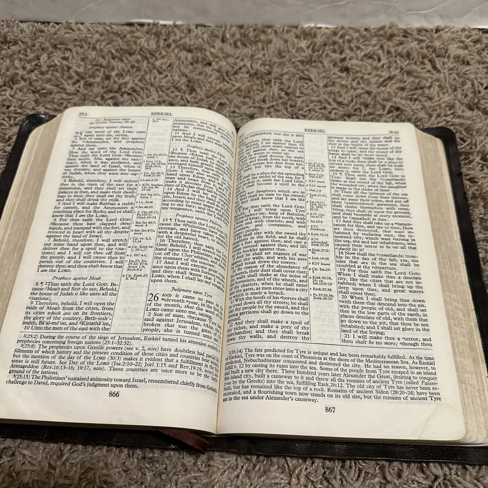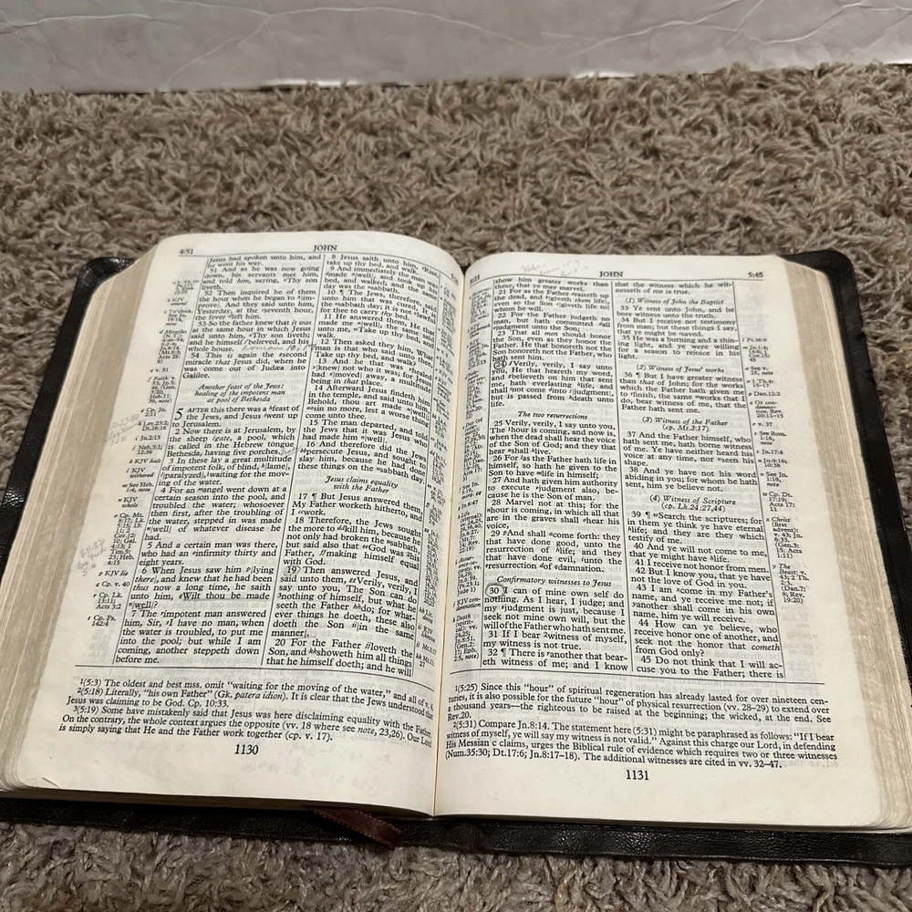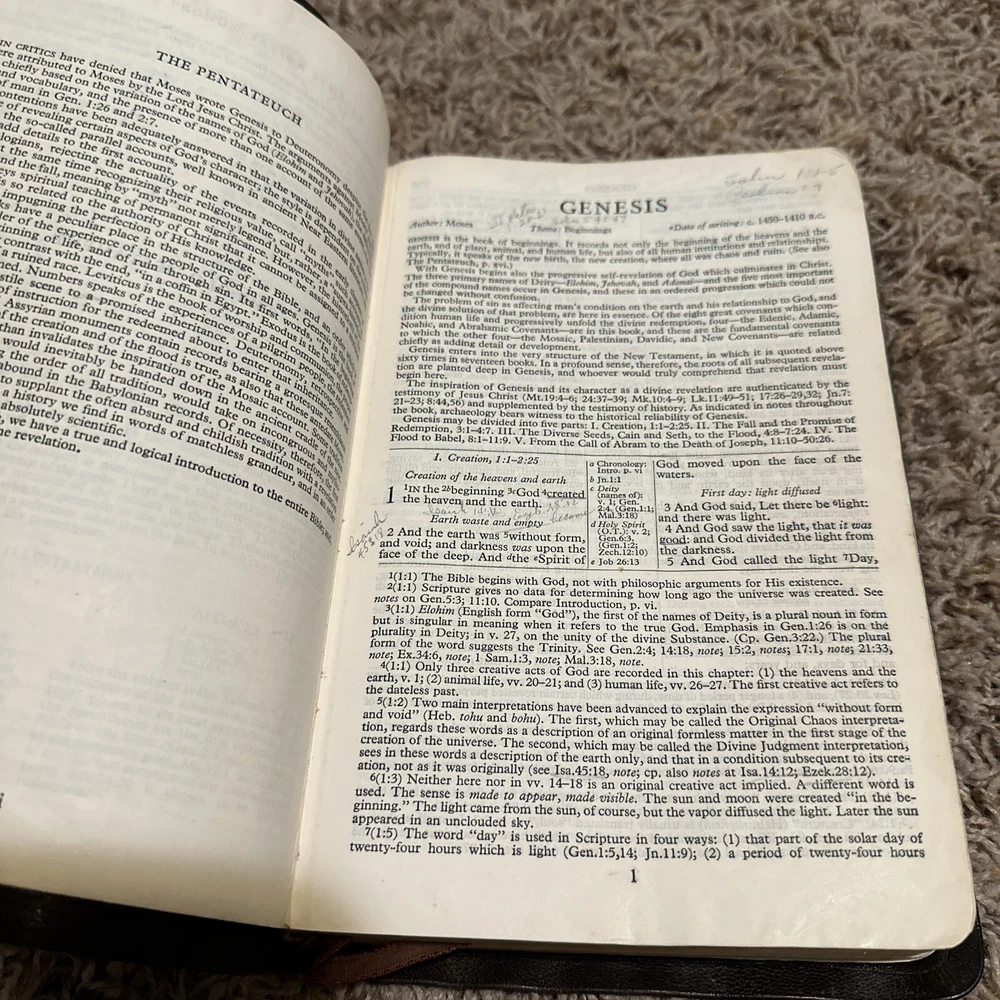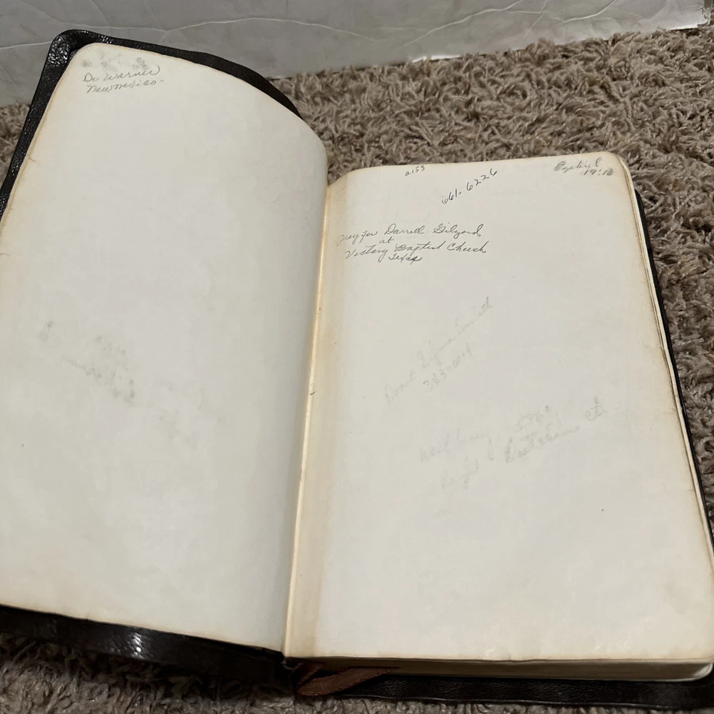 Bible has some light wear on outside of cover. Liquid was spilled near book so some of the pages have some wrinkling. A good amount of writing on pages as well. Please let me know if you have any questions!
