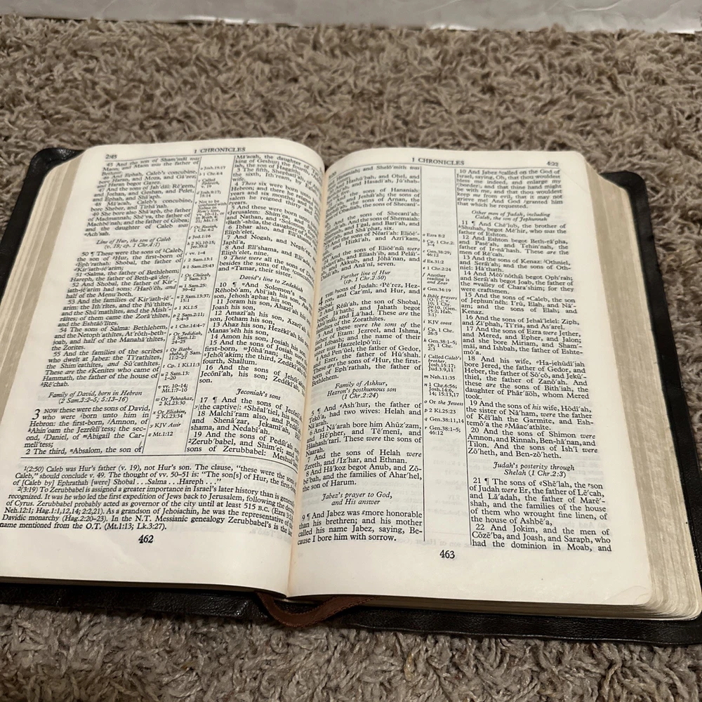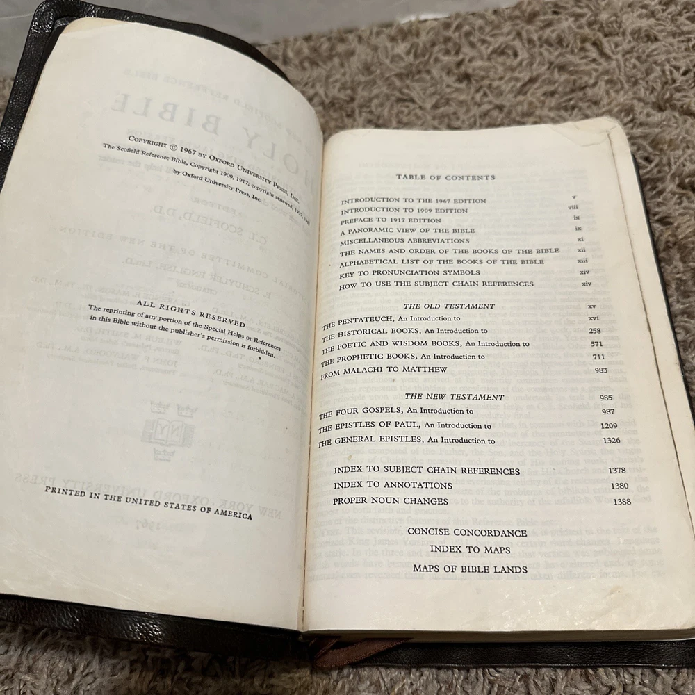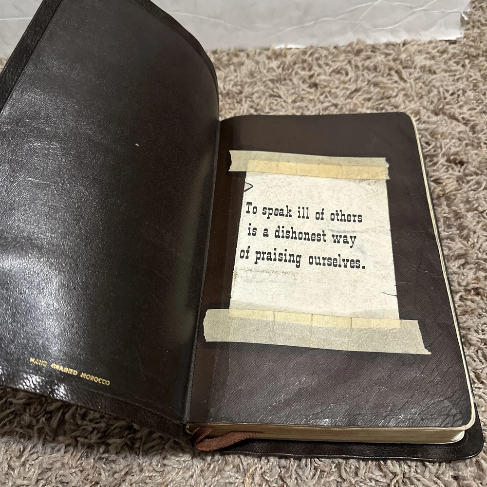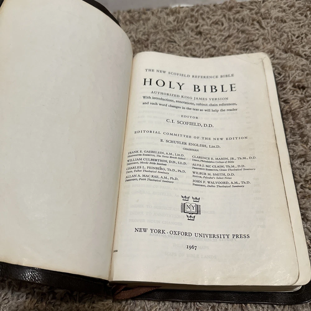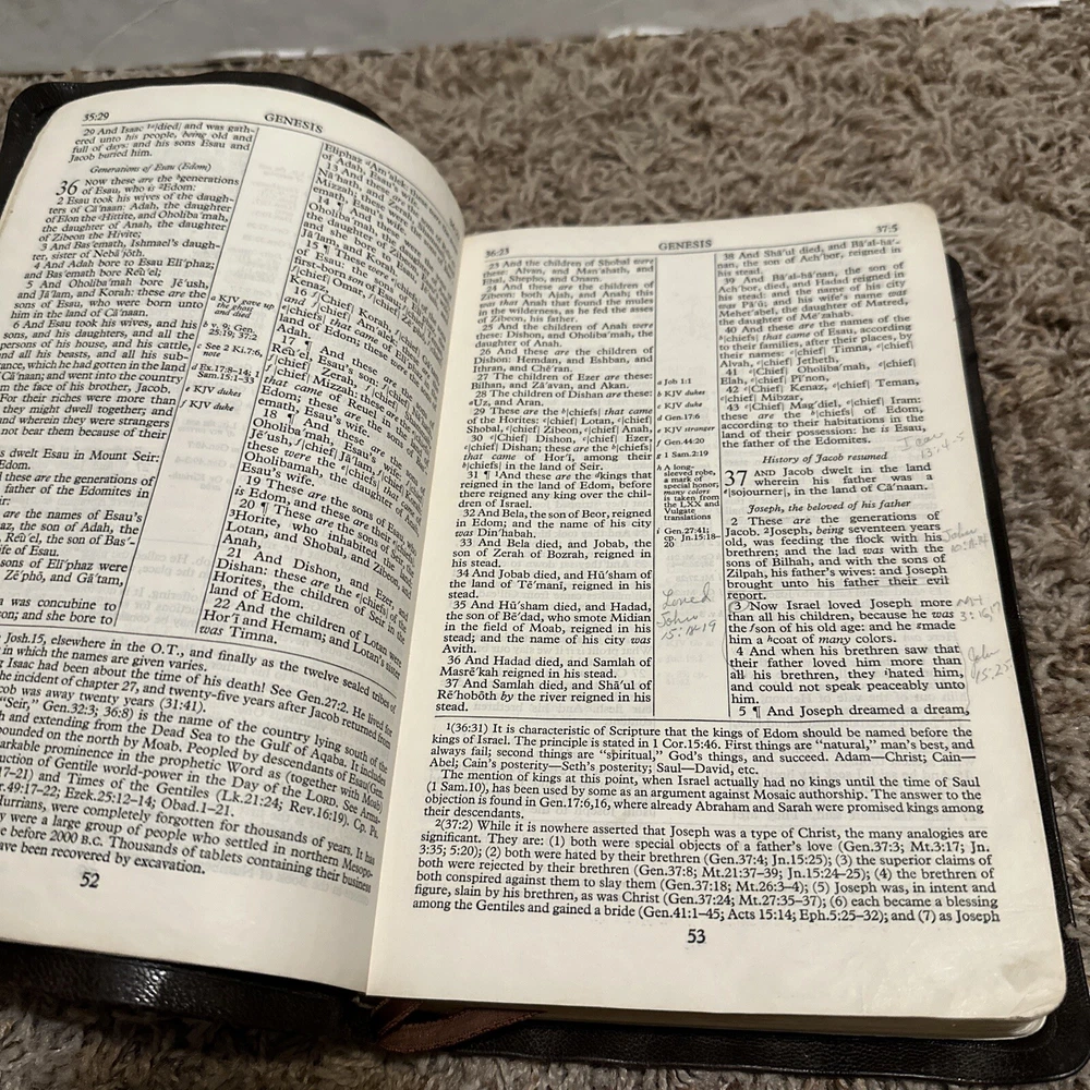 Bible has some light wear on outside of cover. Liquid was spilled near book so some of the pages have some wrinkling. A good amount of writing on pages as well. Please let me know if you have any questions!