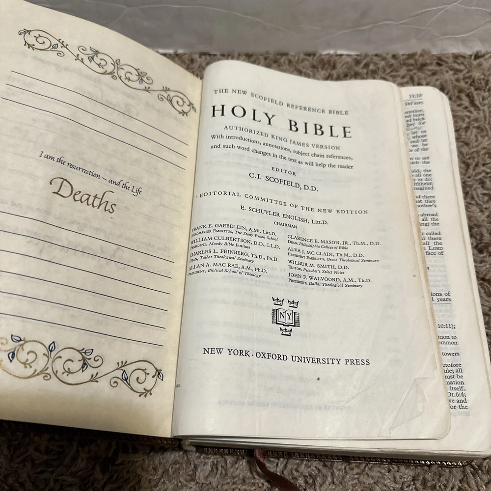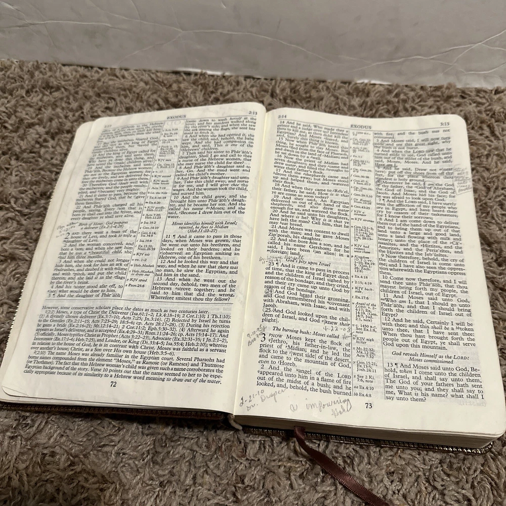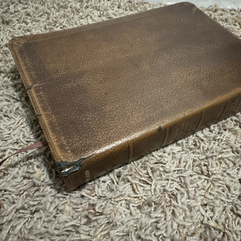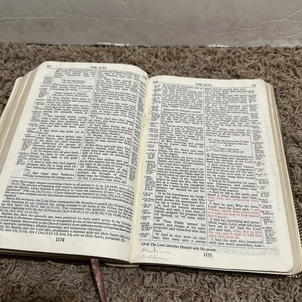 Bible has a good amount of wear on outside of cover. Liquid was spilled near book so some of the pages have some wrinkling. A good amount of writing on pages as well. Please let me know if you have any questions!